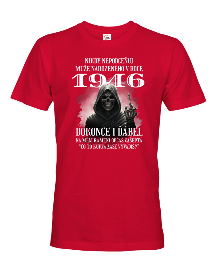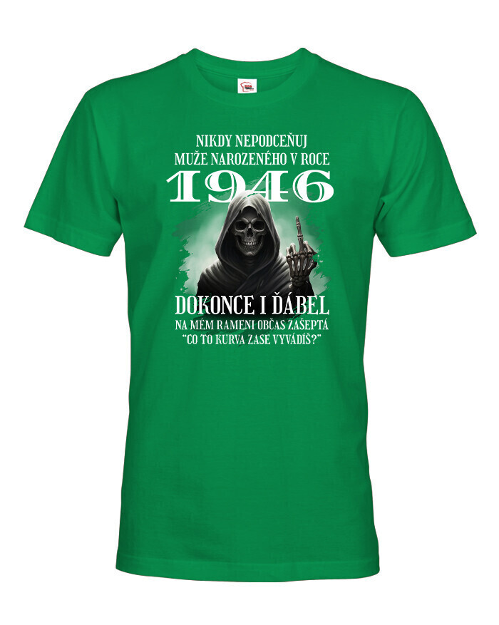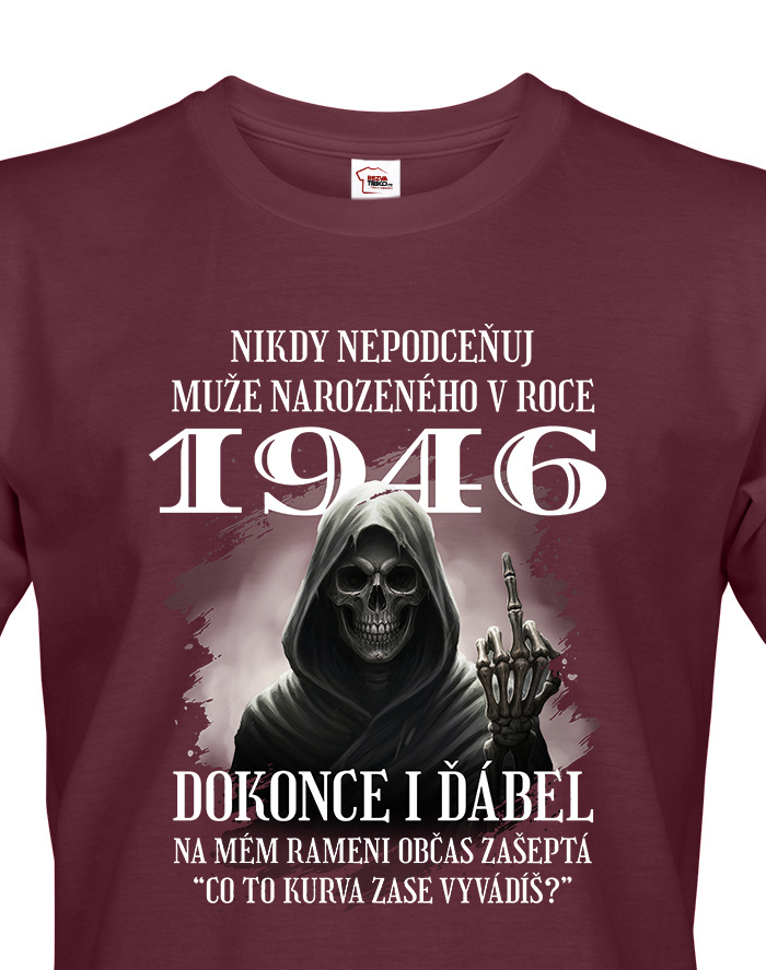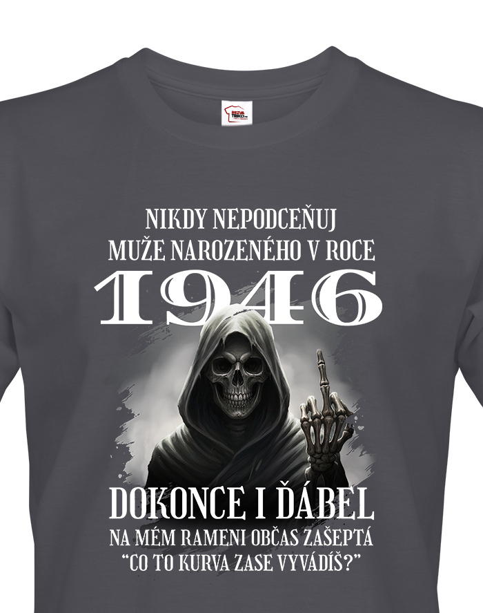 Kostlivec na tričku jasne odkazuje, že roky pribúdajú, ale dobrá nálada zostáva. Dizajn je výrazný, zábavný a okamžite upúta pozornosť. Skvelá voľba na narodeninovú oslavu, rodinné stretnutie alebo len tak – aby bolo jasné, že oslávencovi nechýba humor.