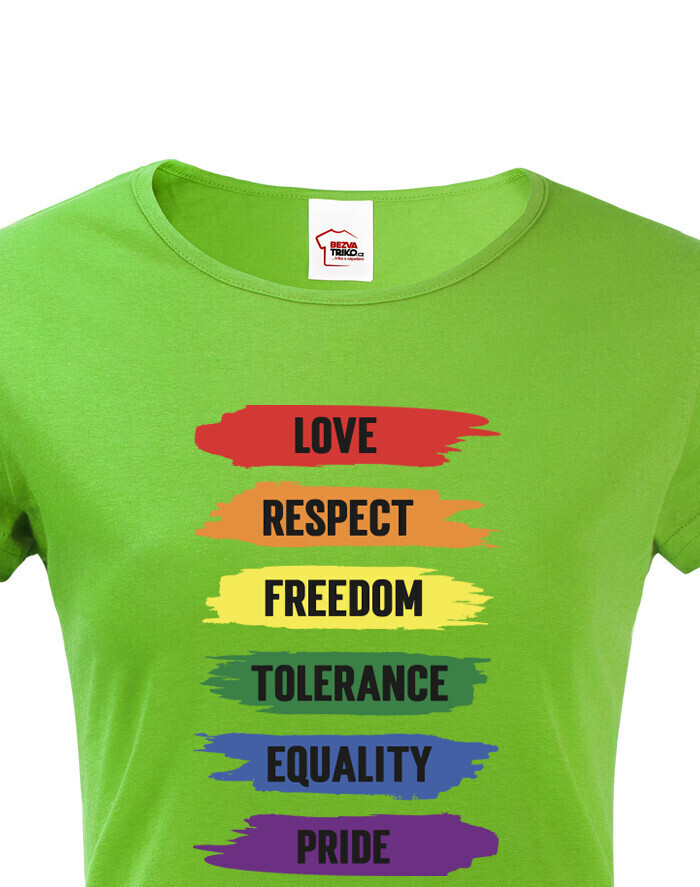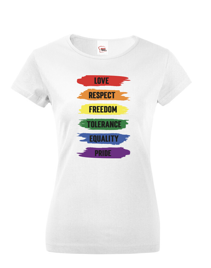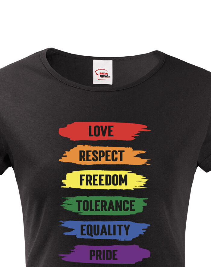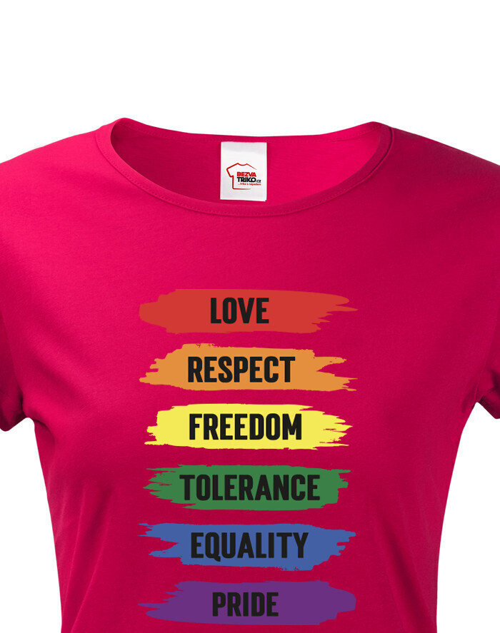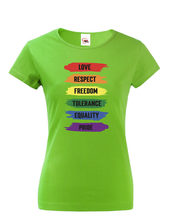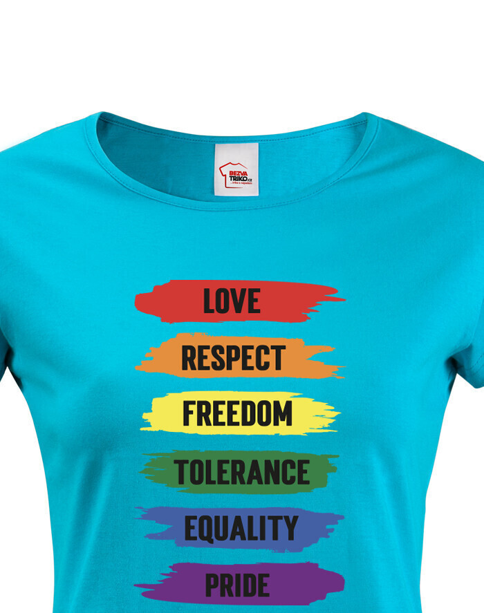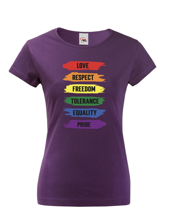 Dámské tričko s potlačou Love-respect-freedom-tolerance-equality-pride. Toto tričko vyjadrí presne na akých princípoch by bol svet fungovať, predovšetkým na tolerancií a slobodnom rozhodnutí. Pokiaľ hľadáš tričko s LGBT motívom, tak toto je presne to pravé. Unisex tričko za super cenu ti určite nesmie chýbať v šatníku.