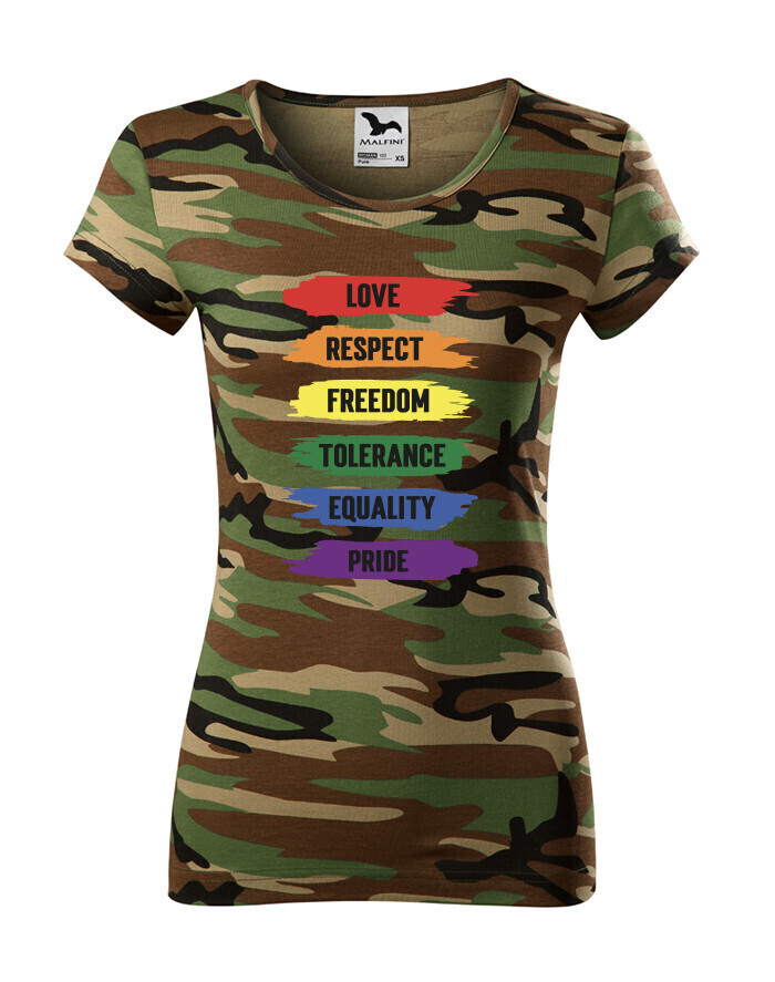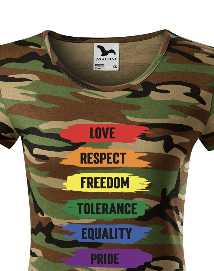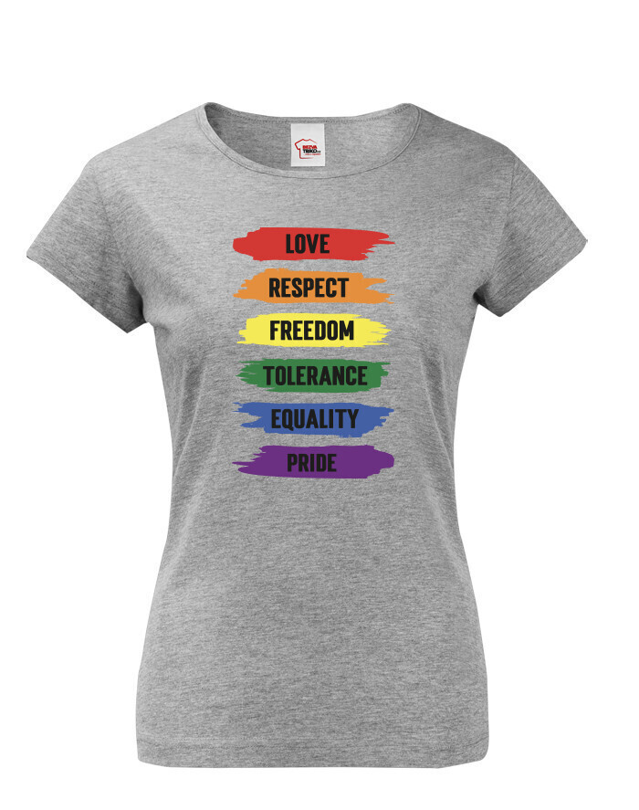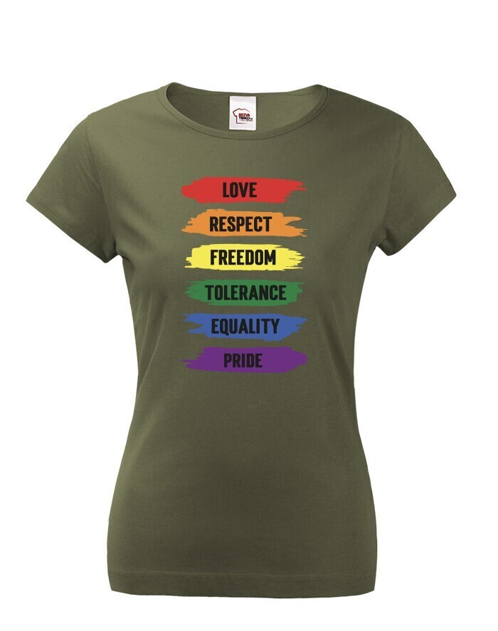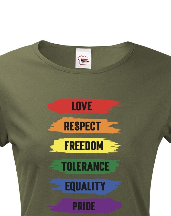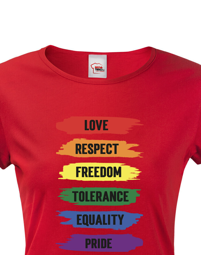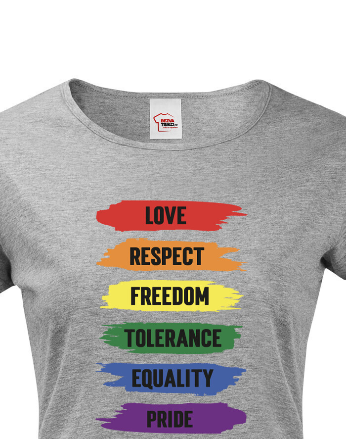 Dámské tričko s potlačou Love-respect-freedom-tolerance-equality-pride. Toto tričko vyjadrí presne na akých princípoch by bol svet fungovať, predovšetkým na tolerancií a slobodnom rozhodnutí. Pokiaľ hľadáš tričko s LGBT motívom, tak toto je presne to pravé. Unisex tričko za super cenu ti určite nesmie chýbať v šatníku.