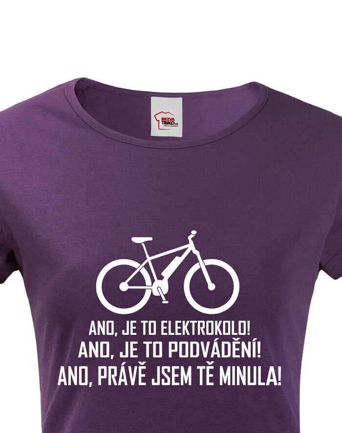 Dámske cyklo tričko Jazdím na elektrobicykli je skvelé tričko pre každú elektrocyklistku! Ukážte všetkým vtipnou formou, že Vás nezaujíma, čo si ostatní o používaní elektrobicyklov myslia! Vtipný nápis Áno, je to elektrobicykel! Áno, je to podvádzanie! Áno, práve som ťa minula! skvele zhrnie, čo si o ich názore myslíte. Tričko je dobrým spoločníkom na Vašom cyklovýlete, ale aj na posedenie s priateľmi po ňom. Tričko je skvelý darček na narodeniny, na Vianoce alebo len tak pre radosť pre každú, čo si rada zajazdí na elektrobicykli!