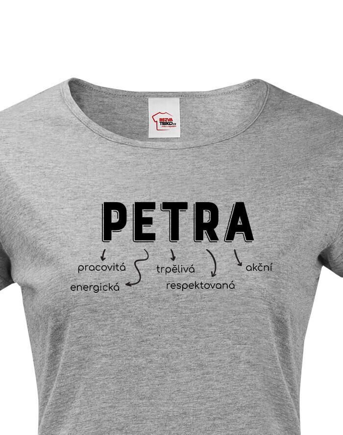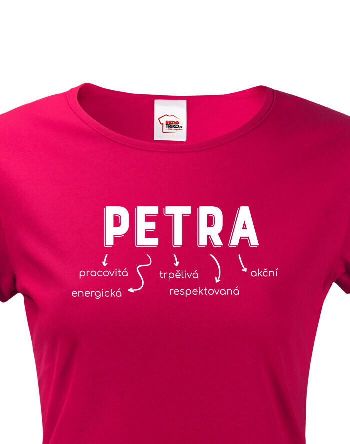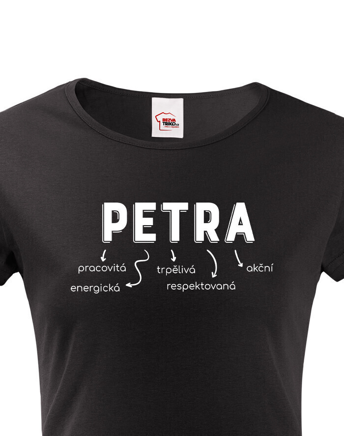 Dámske tričko s nápisom „Petra“ k meninám je ideálnou voľbou pre všetky ženy menom Petra, ktoré ocenia osobný a originálny darček. Tričko je pohodlné, vyrobené z kvalitného materiálu a príjemné na nosenie celý deň, takže sa hodí na každodenné nosenie, oslavy, posedenia s priateľmi alebo voľný čas. Dizajn s vlastným menom dodáva tričku jedinečný a osobitý vzhľad, ktorý určite vyčarí úsmev obdarovanej. Je to perfektný darček k meninám, narodeninám, Vianociam alebo len tak, ak chcete niekomu urobiť radosť. Tričko sa ľahko kombinuje s džínsami, sukňou alebo športovými nohavicami. Hodí sa pre ženy všetkých vekových kategórií, ktoré chcú byť originálne a štýlové. Vyrazte von s komfortom, štýlom a osobným šarmom.