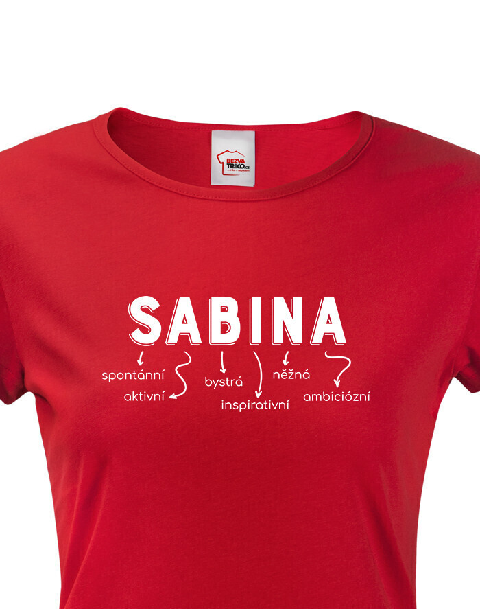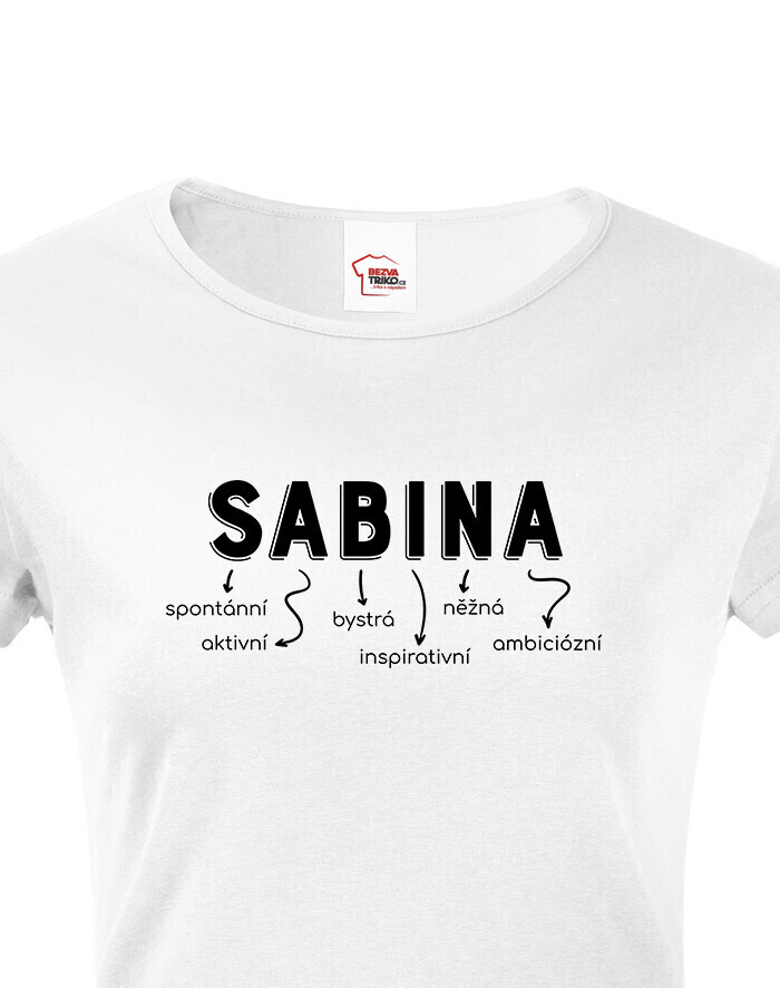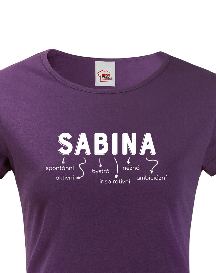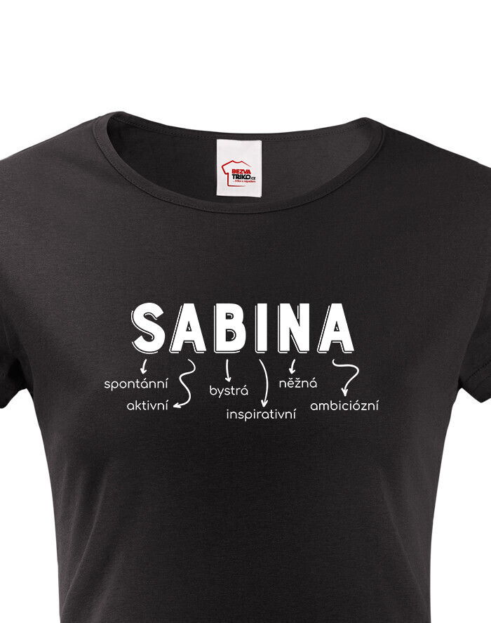 Meno Sabina vyjadruje osobnosť: spontánna, aktívna, bystrá, inšpiratívna, nežná a ambiciózna. Dizajn s vlastným menom dodáva tričku jedinečný a osobitý vzhľad, ktorý určite vyčarí úsmev obdarovanej.
