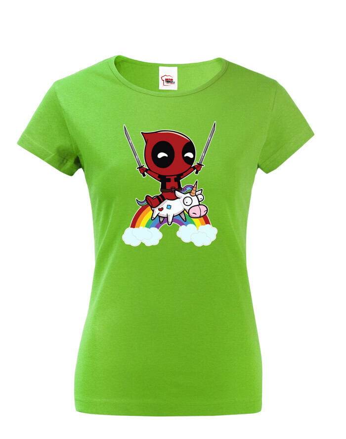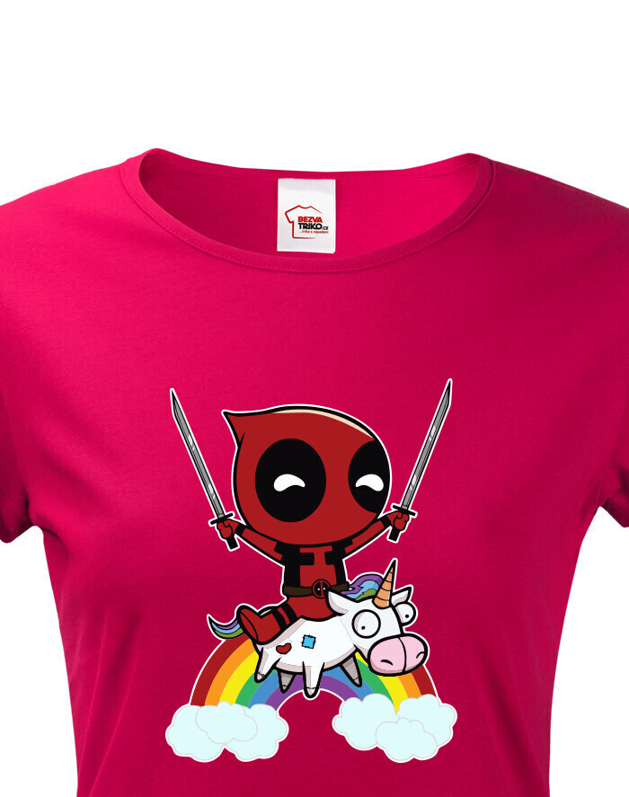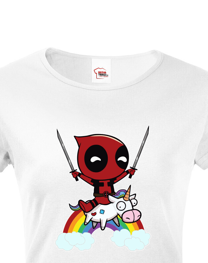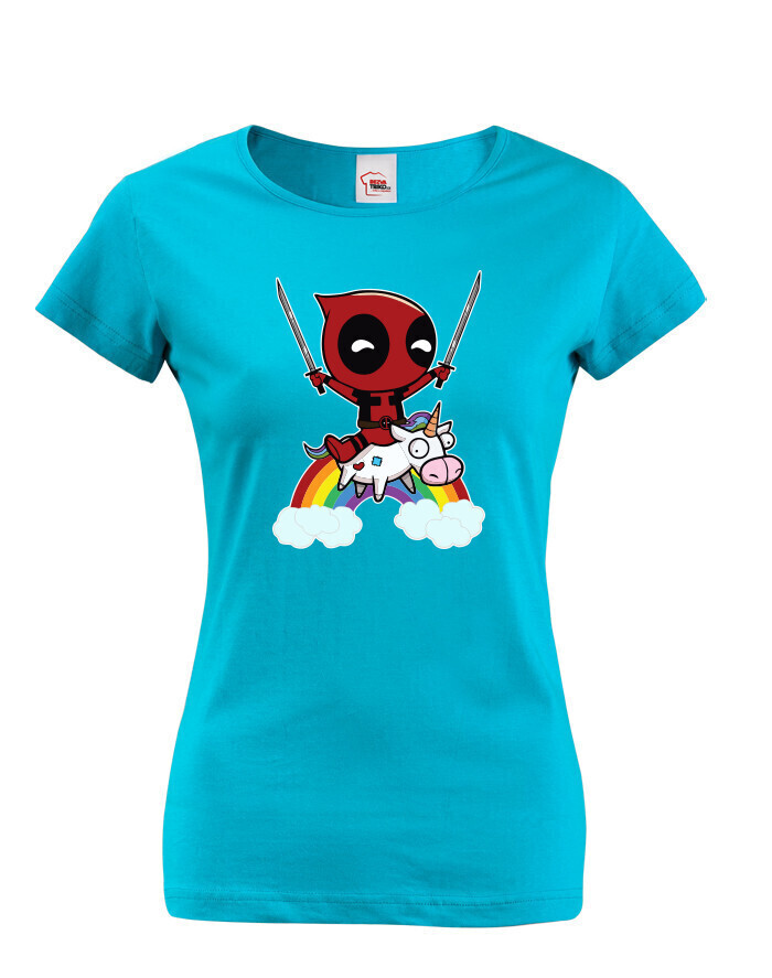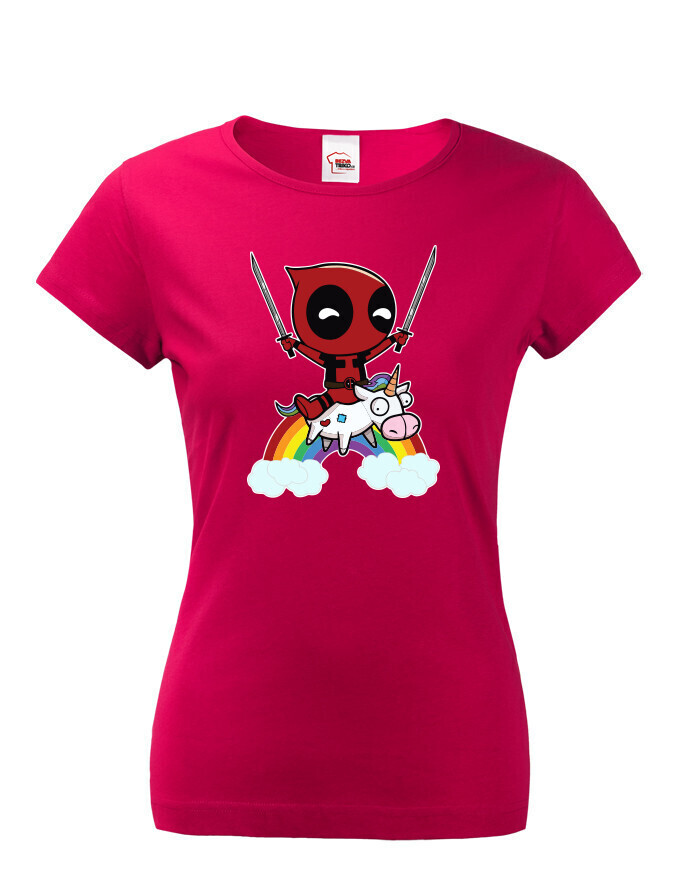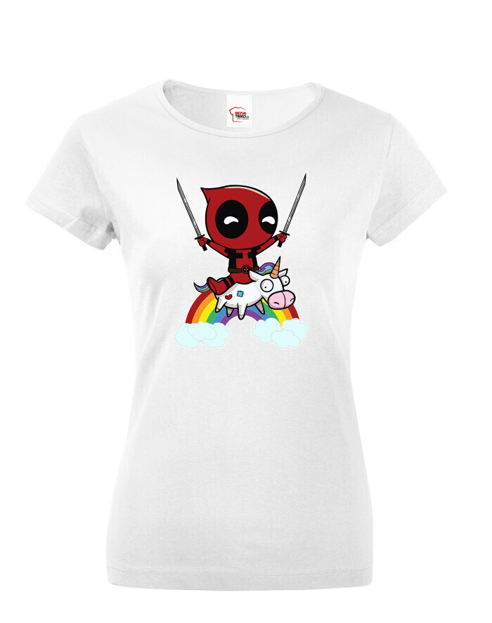 Dámské tričko s potlačou Deadpool. S týmto tričkom určite potešíme fanúšikov Marveloviek. Urobte radosť s týmto tričkom sebe alebo svojím blízkym či už na narodeniny alebo Vianoce. Na tričku je zobrazený Deadpool a farebná dúha s jednorožcom. Tričko je skvelé na bežné nosenie, ale aj kamkoľvek inak. S týmto tričkom zaručene nešliapnete vedľa. Potlač skvelo vynikne na čiernom tričku, ale rovnako tak bude vyzerať dobre na bielom alebo farebnom.