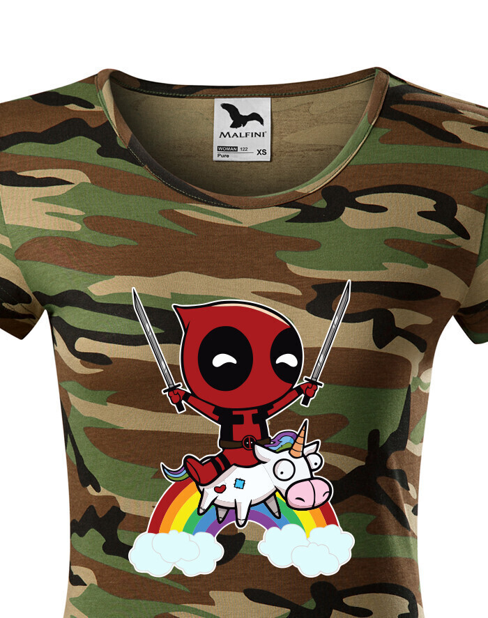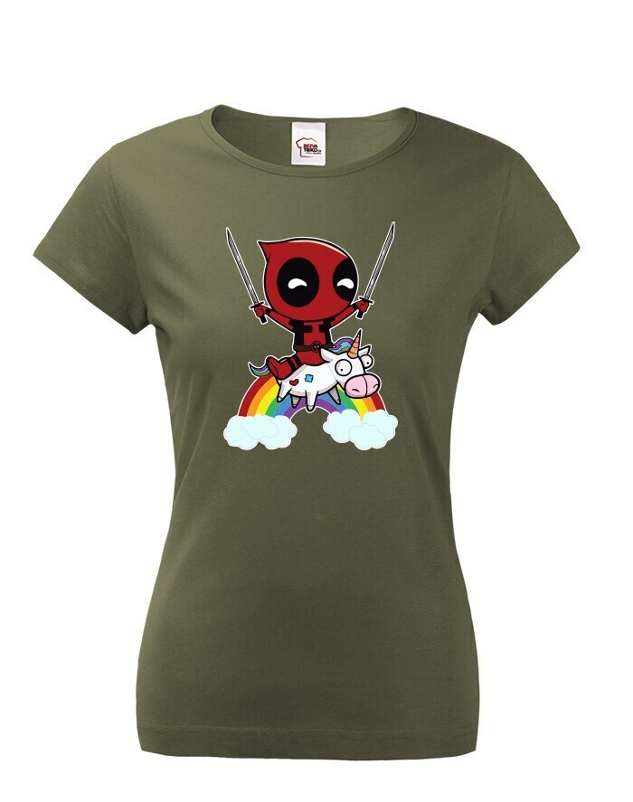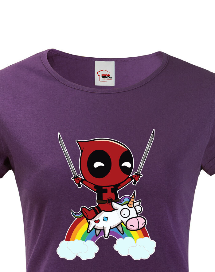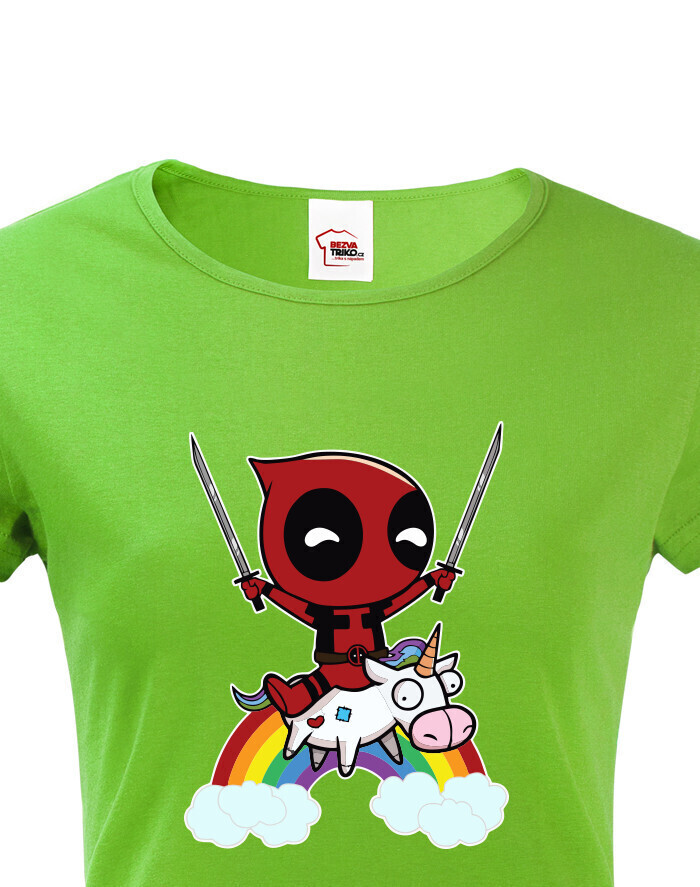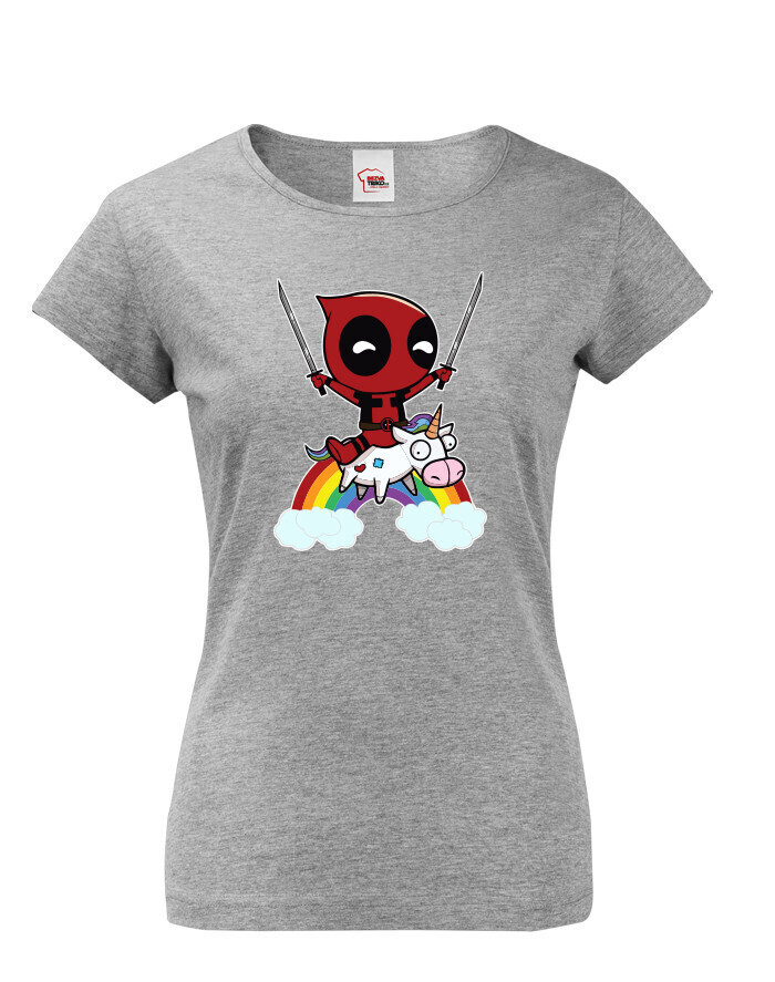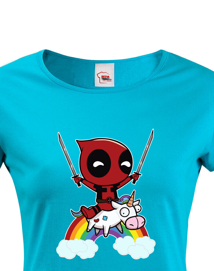 Dámské tričko s potlačou Deadpool. S týmto tričkom určite potešíme fanúšikov Marveloviek. Urobte radosť s týmto tričkom sebe alebo svojím blízkym či už na narodeniny alebo Vianoce. Na tričku je zobrazený Deadpool a farebná dúha s jednorožcom. Tričko je skvelé na bežné nosenie, ale aj kamkoľvek inak. S týmto tričkom zaručene nešliapnete vedľa. Potlač skvelo vynikne na čiernom tričku, ale rovnako tak bude vyzerať dobre na bielom alebo farebnom.