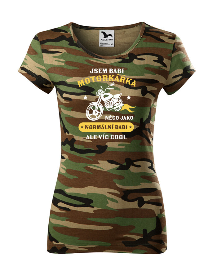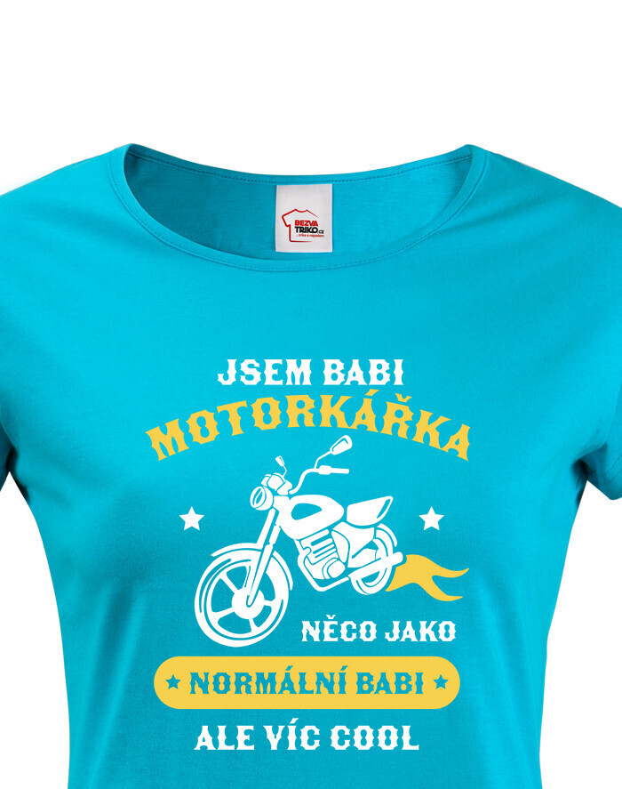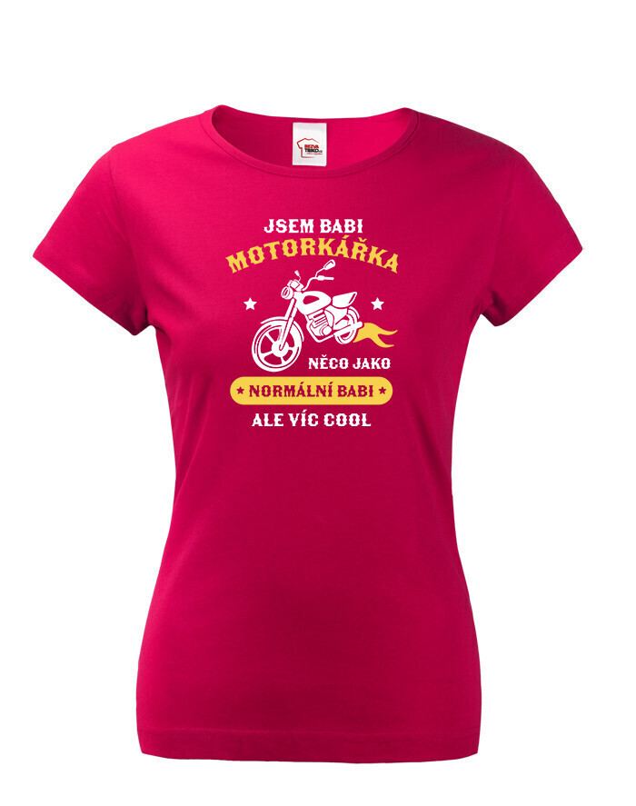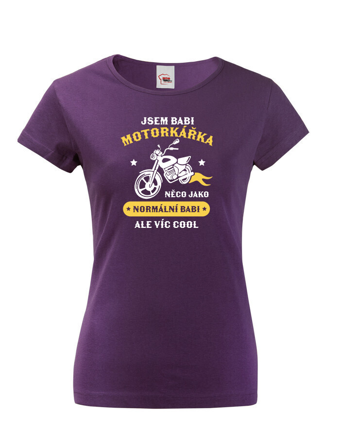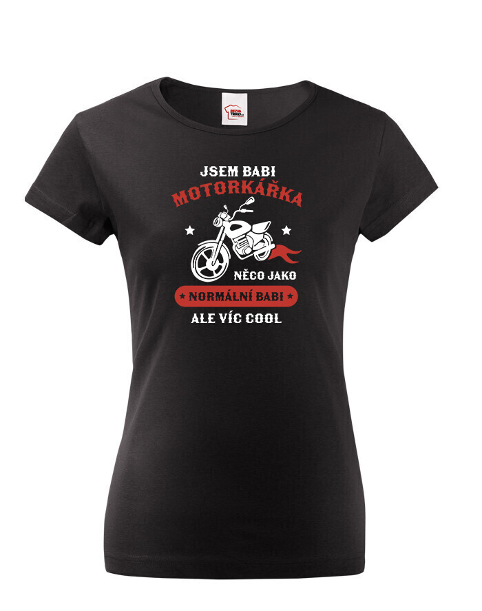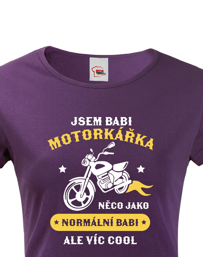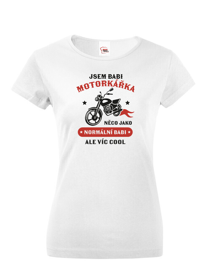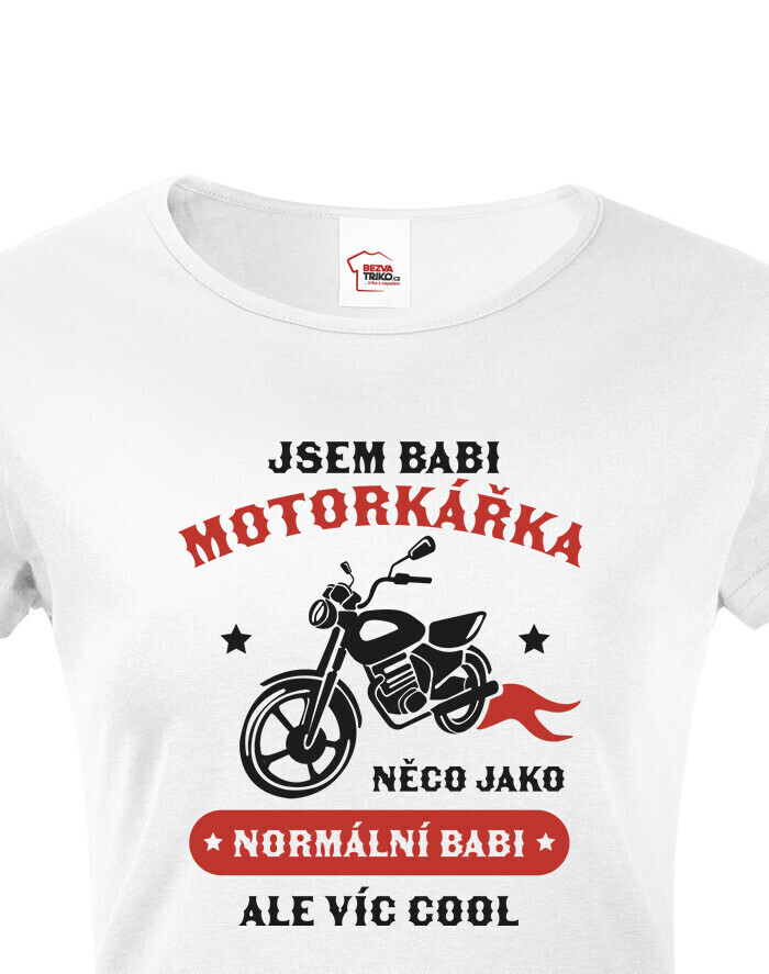 Vtipné dámské tričko pre babku motorkárku, ktorá sa ničoho nebojí! Dámské tričko s potlačou "Som babka motorkárka niečo ako normálna babka ale viac cool" rozosmeje každú nadšenú motorkárku. Tento netradičný darček určite poteší každú motorkárku. Darujte toto motorkárske tričko sebe alebo svojej babke. Radosť je zaručená. Potlač super vynikne na bielom alebo čiernom tričku, ale s inou farbou tričko určite nešlapnete veďla.