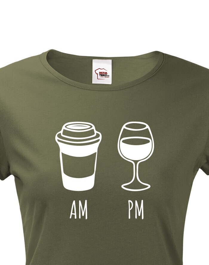Ďalšie vtipné tričko s vínom pre naše dámy. Pokiaľ milujete večer pohárik vína a cez deň Vás dobíja šálka dobrej kávy, toto tričko si zamilujete. Minimalistická a pritom originálna potlač s pohárikom vína a kelímkom kávy zaujme vaše okolie.