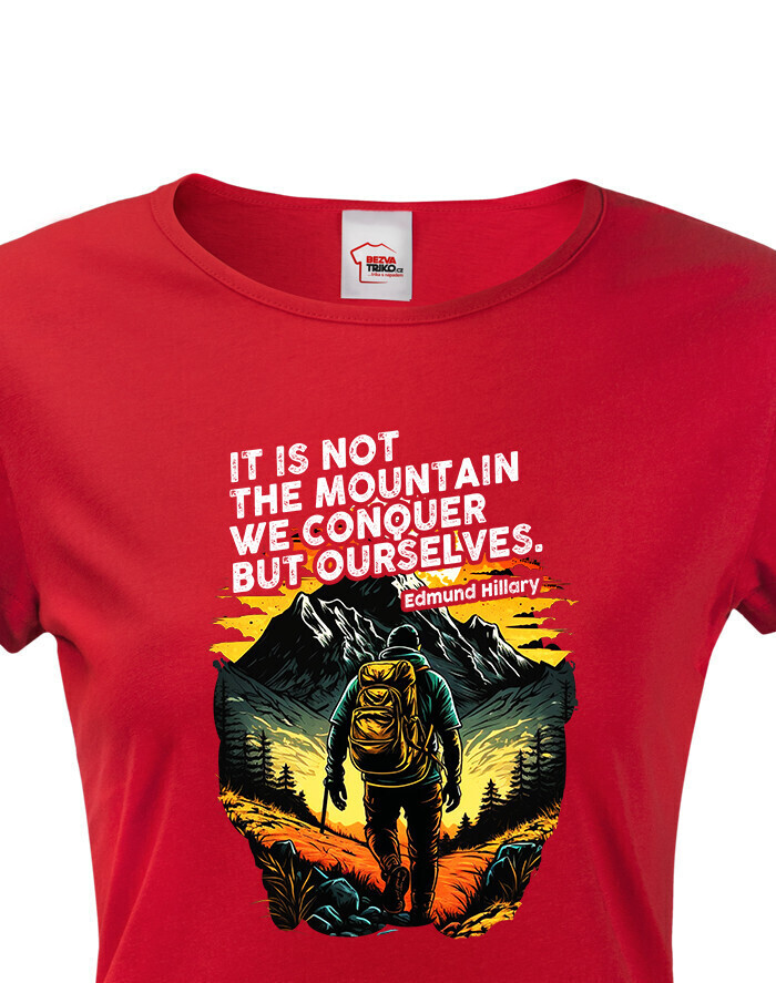 It is not the mountain we conquer, but ourself. Tento citát slávneho horolezca Sira Edmunda Hillaryho je dokonalým pripomenutím toho, prečo neustále vyrážame vyššie a ďalej. Skvelá potlač na dámske tričko pre všetky ženy, ktoré srdce ťahá do hôr.