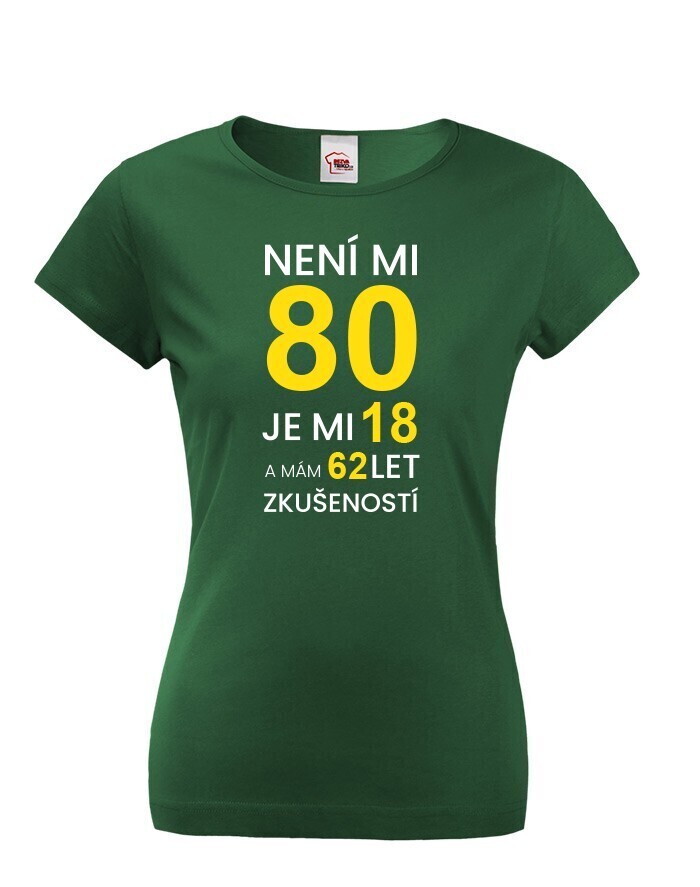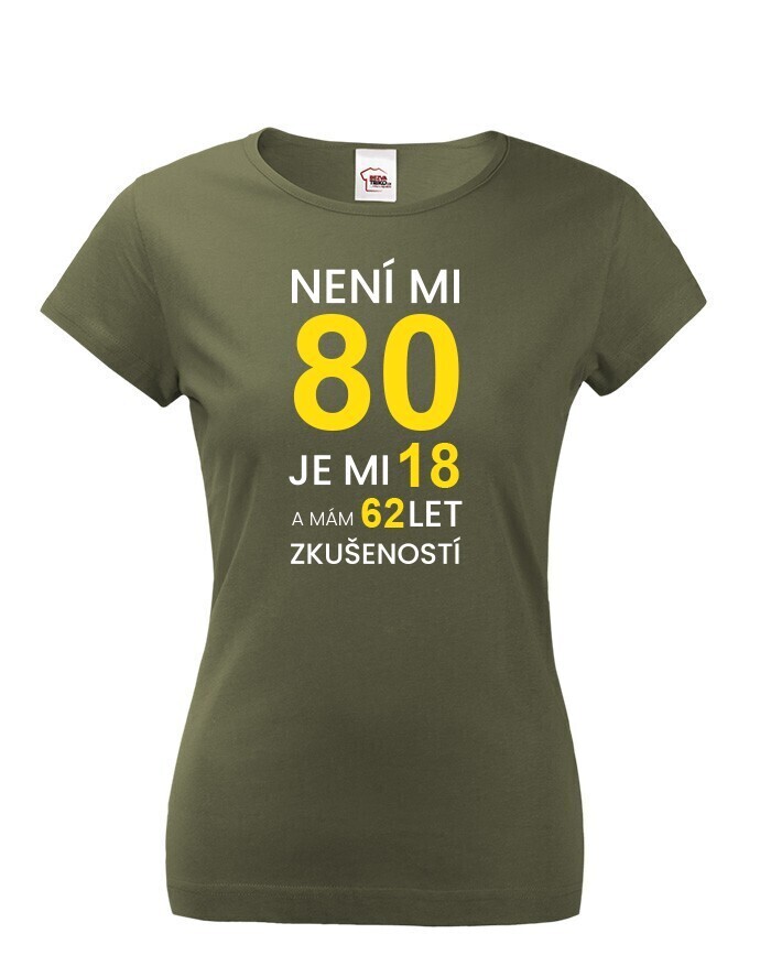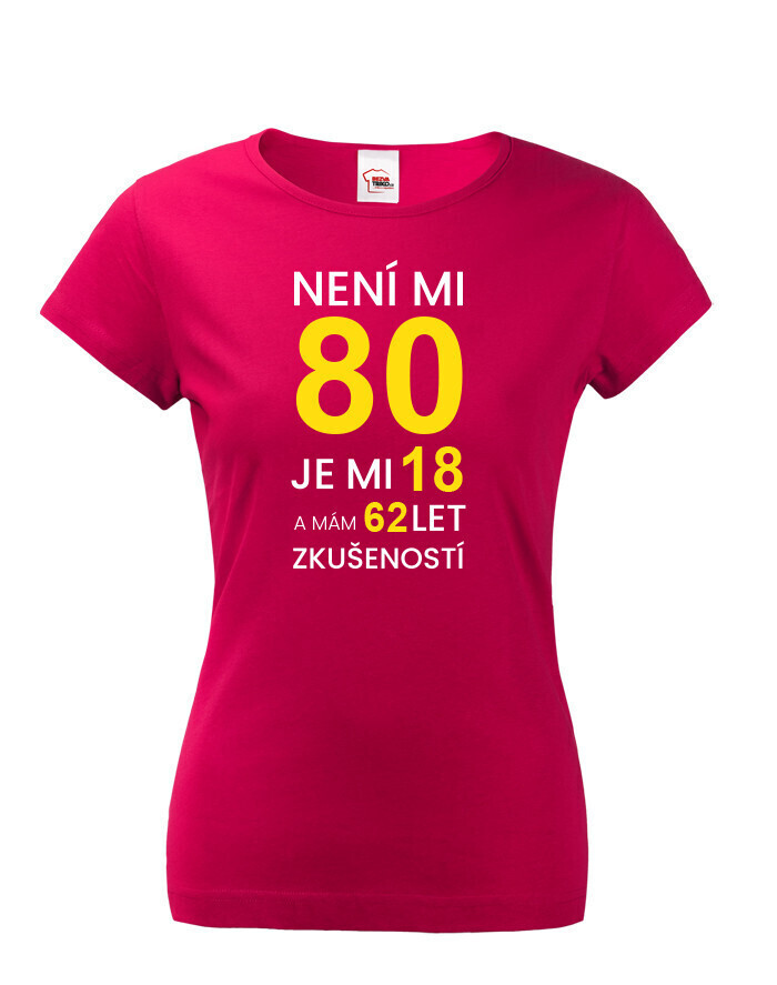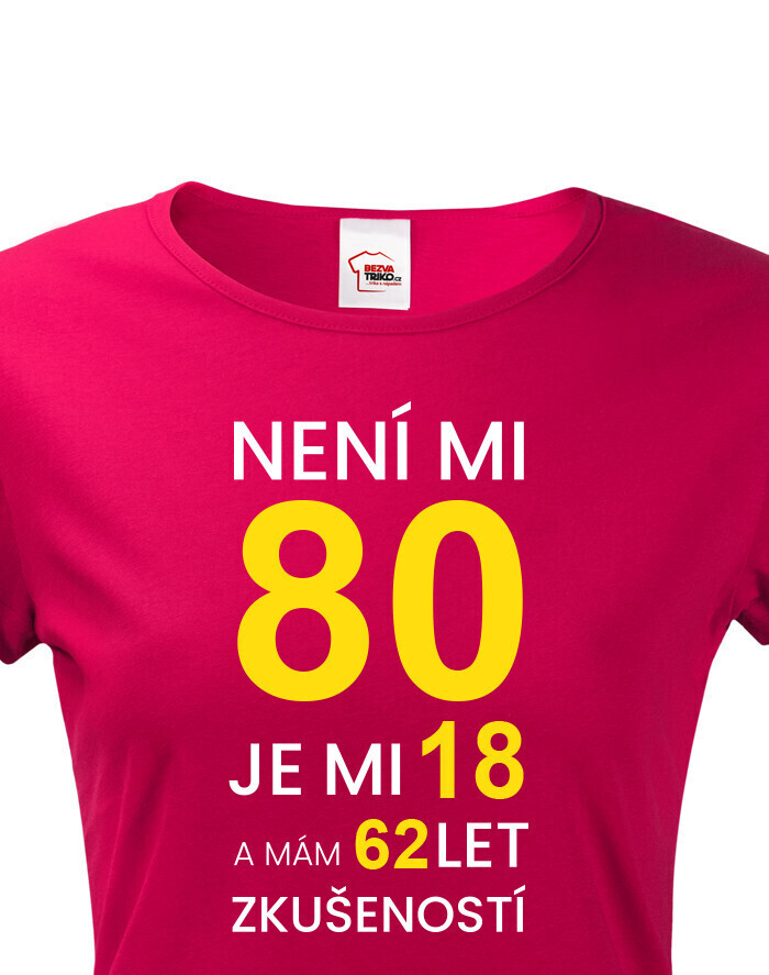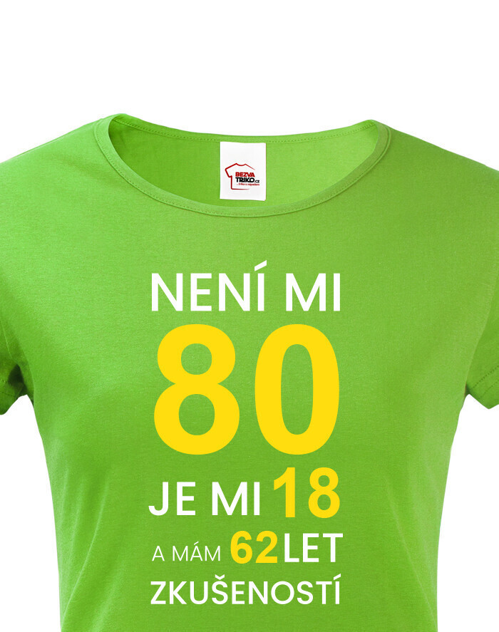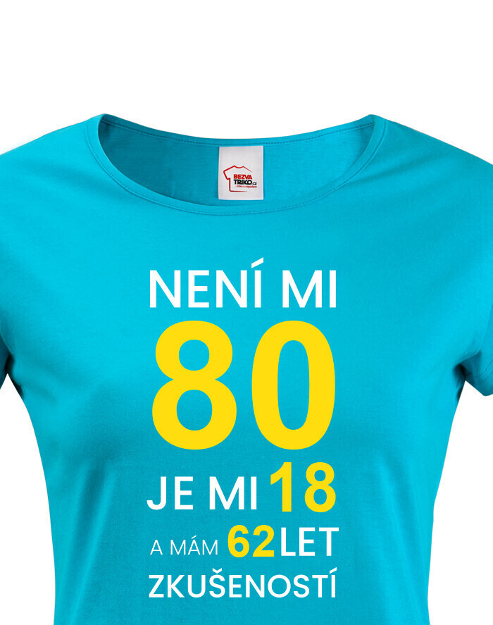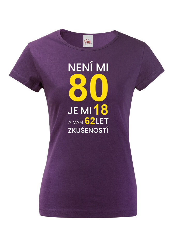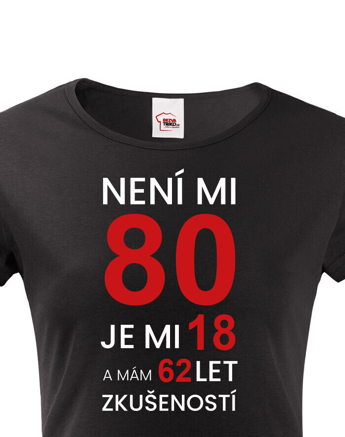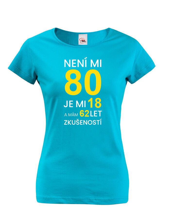 Dámské narodeninové tričko s potlačou "Nie je mi 80 je mi 18 a mám 62 rokov skúseností" rozosmeje každého, kto si potlač prečíta. Veď predsa vek nie je žiadna hanba. Tričko pre oslávenca okrúhlych narodenín - pre všetkých, ktorí chcú v 80. rokov vyzerať naozaj cool! Tričko sa ideálne hodí ako darček na narodeniny pre mamu, sestru či tetu.