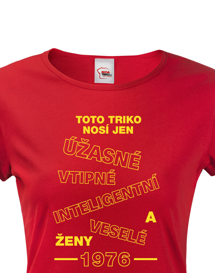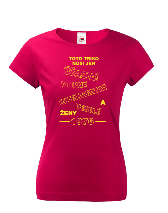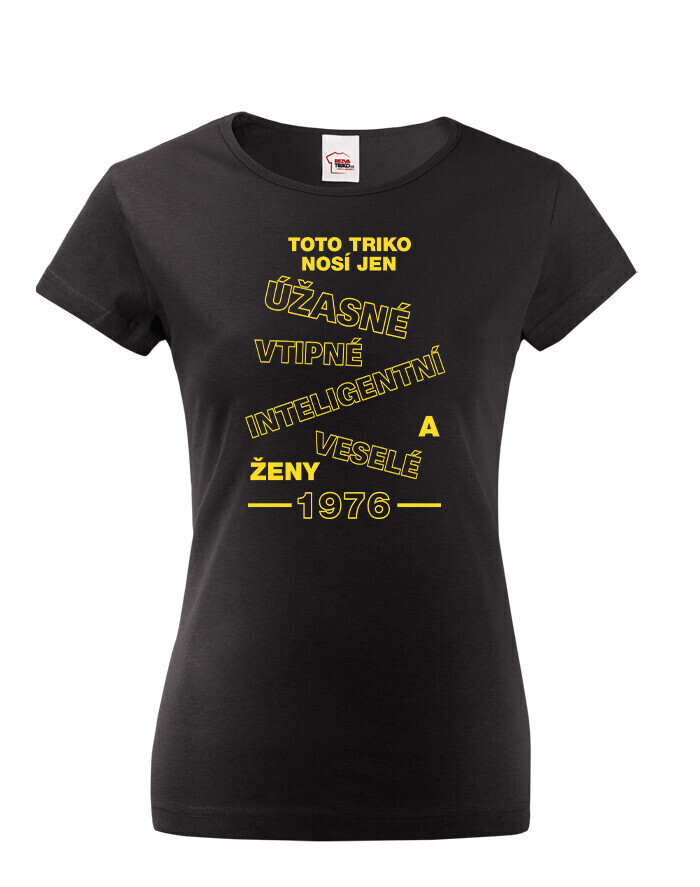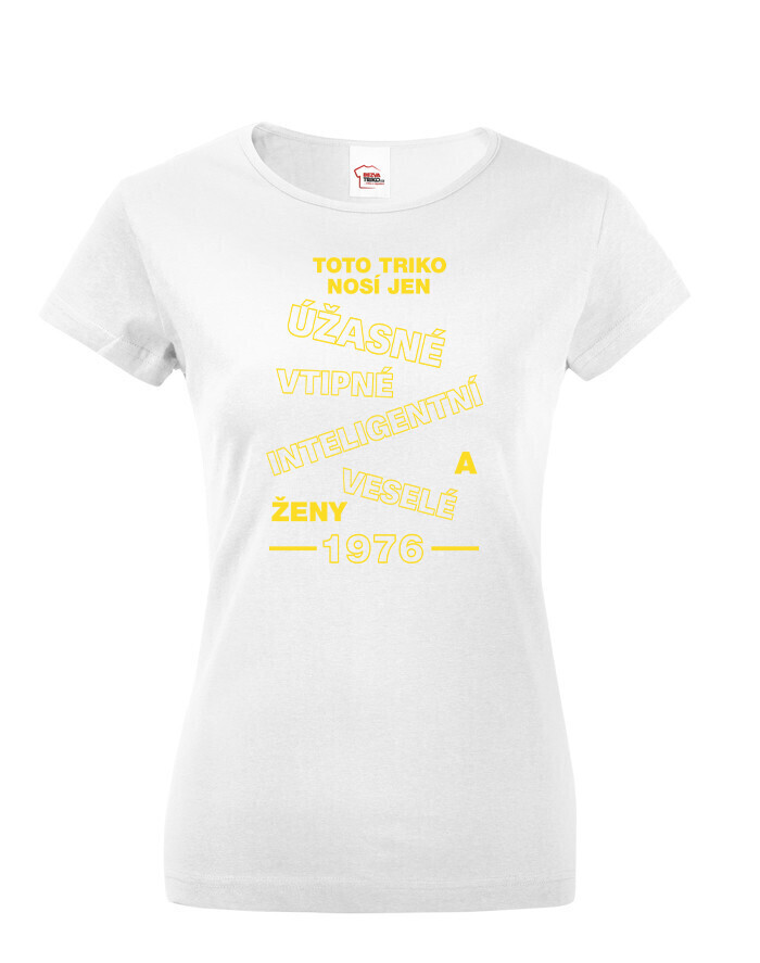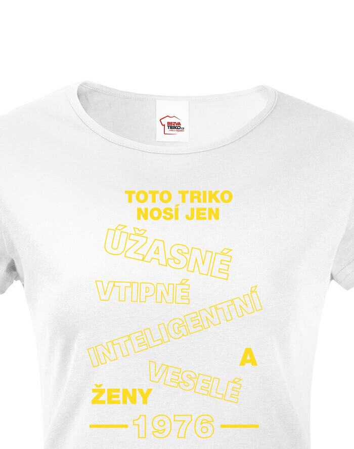 Toto dámské tričko s potiskem ,,Toto triko nosí jen úžasné, vtipné, inteligentní a veselé ženy + rok narození,, bude ideálním narozeninovým dárkem. Samozřejmě nezáleží na tom, jestli oslavujete narozeniny nebo si jen chcete připomenout, jak moc jste úžasná, toto tričko Vám dodá potřebnou dávku sebevědomí a energie. Ideální dárek pro každou ženu, která si zaslouží být uctěna a oslavována! Nezapomeňte nám do poznámky doplnit rok, který budeme tisknout na tričko. Triko s potiskem bude originálním a vtipným dárkem k narozeninám. Na tričko Vám rádi dotiskneme jméno nebo další přání.