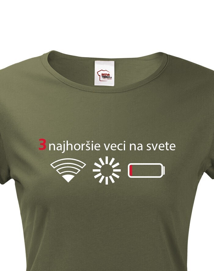 Premýšľali ste niekedy nad tým, čo sú tri najhoršie veci na svete? Ak nie, tak už nemusíte. Máme pre vás jednoznačnú odpoveď - slabý signal WIFI, zaseknutá appka a dochádzajúca batéria. Naša vtipné tričko s potlačou nebezpečne reflektuje dnešnú dobu, keď bez mobilného telefónu nikto nedá ani ranu.