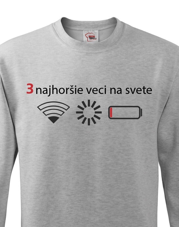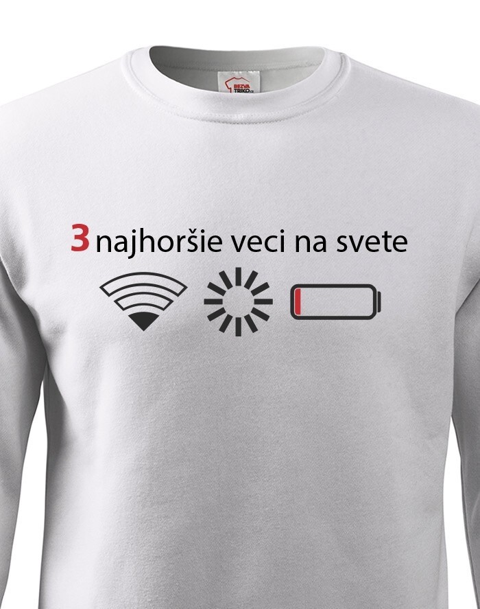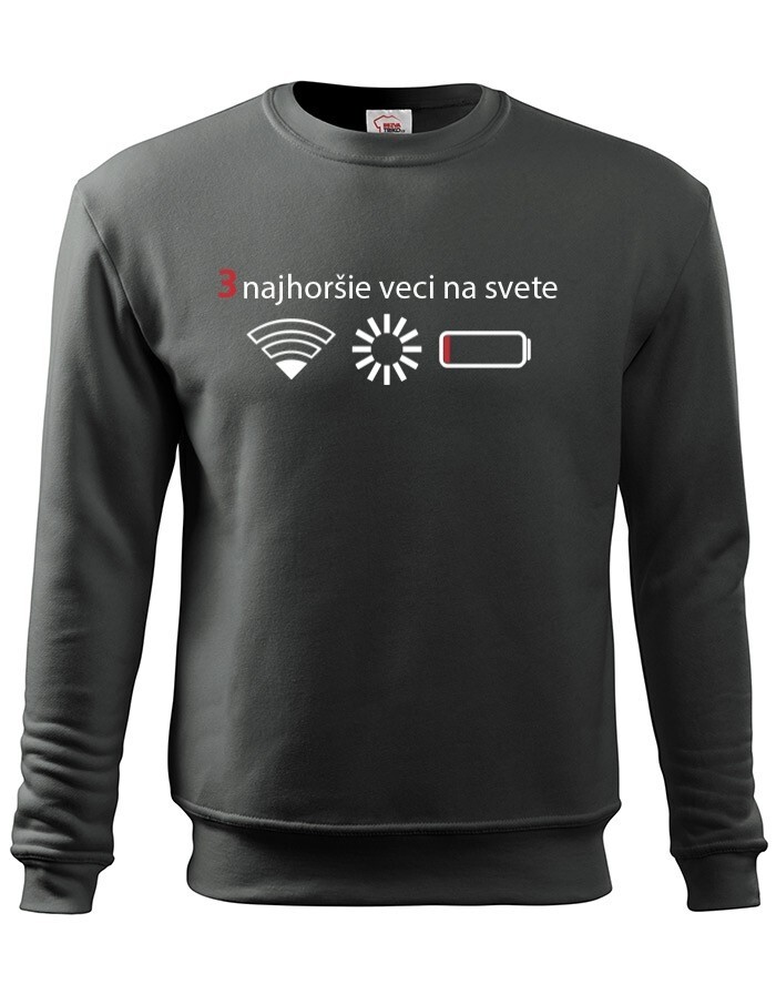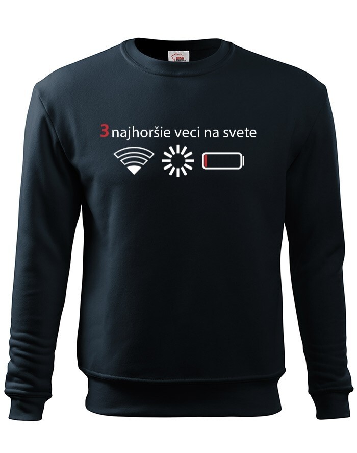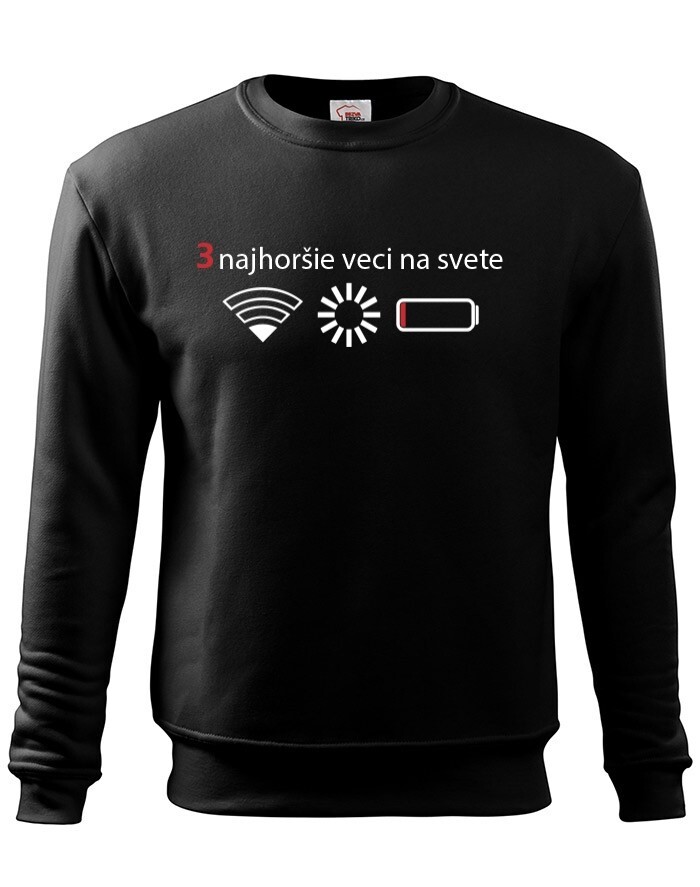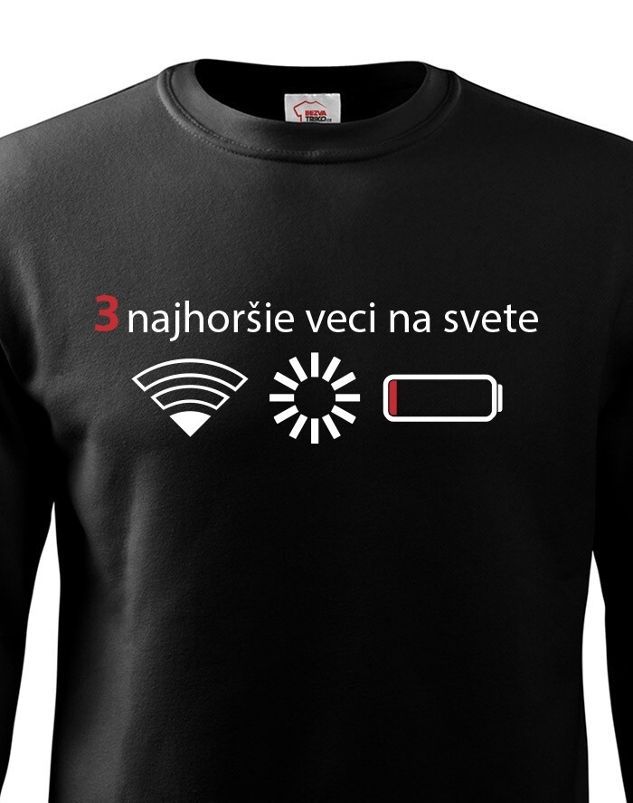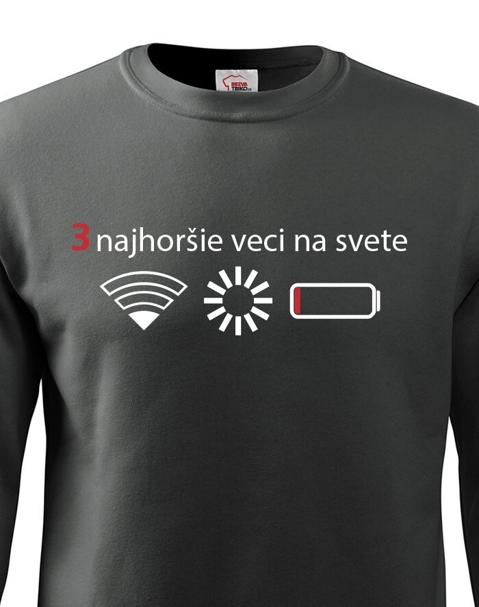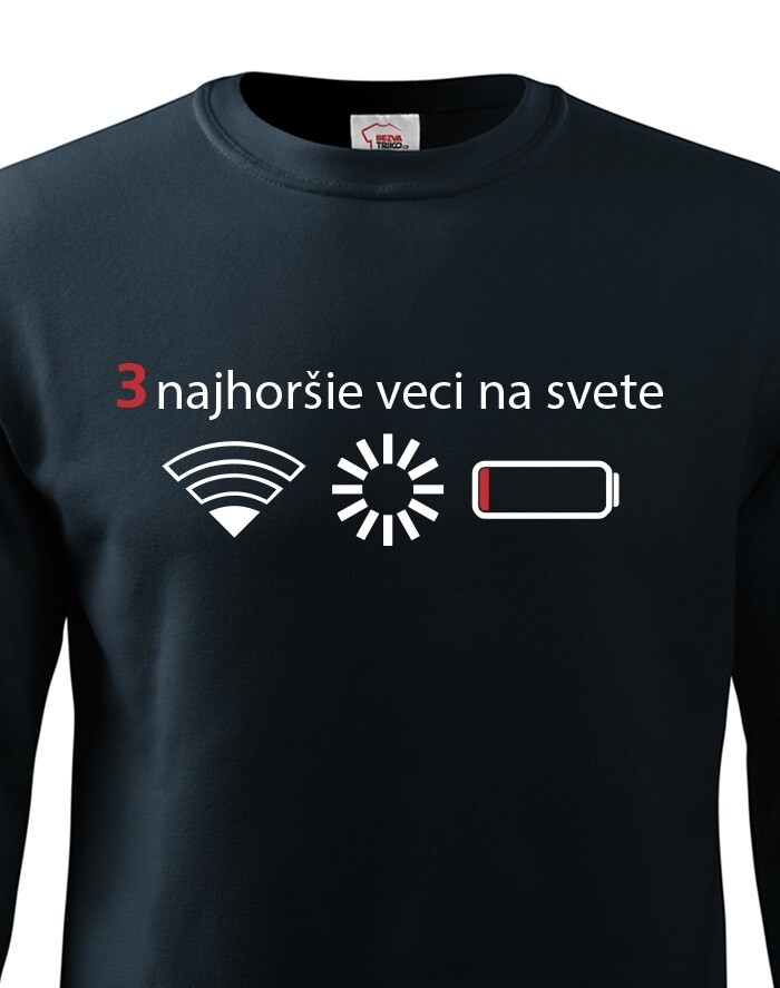 Přemýšľali ste niekedy nad tým, čo sú tri najhoršie veci na svete? Ak nie, tak už nemusíte. Máme pre vás jednoznačnú odpoveď - slabý signal WIFI, zaseknutá apka a dochádzejúca batéria. Naša vtipná mikina s potlačou nebezpečne reflektuje dnešnú dobu, kedy bez mobilného telefónu nikto nedá ani ranu.