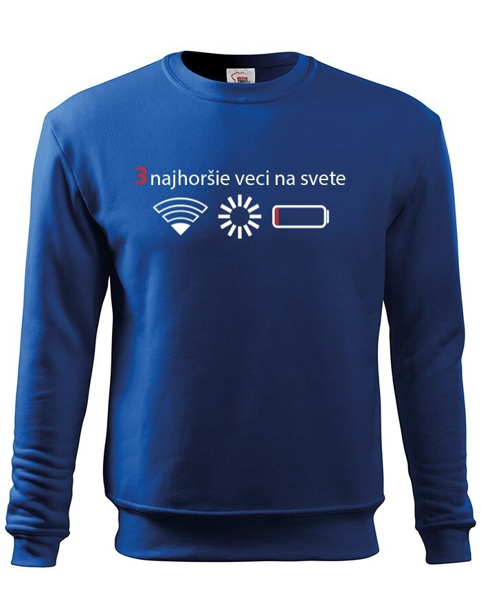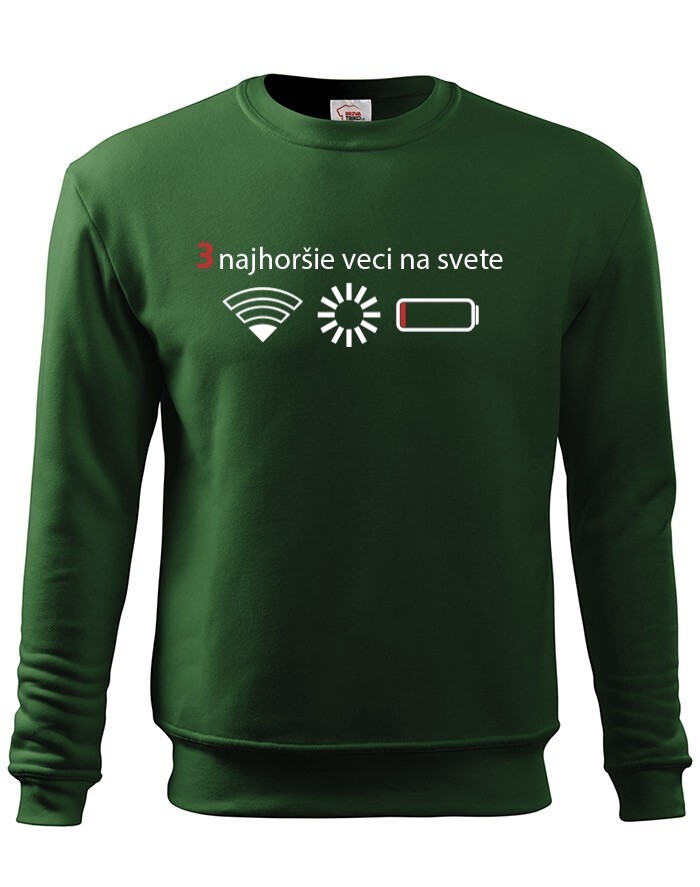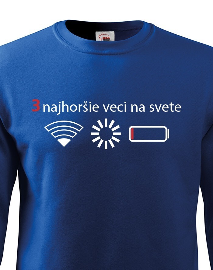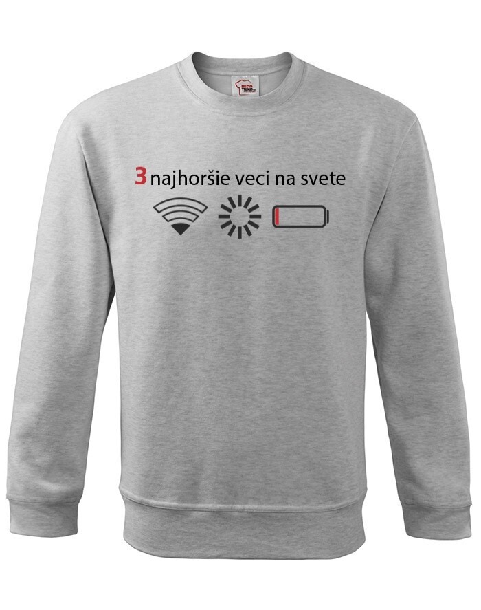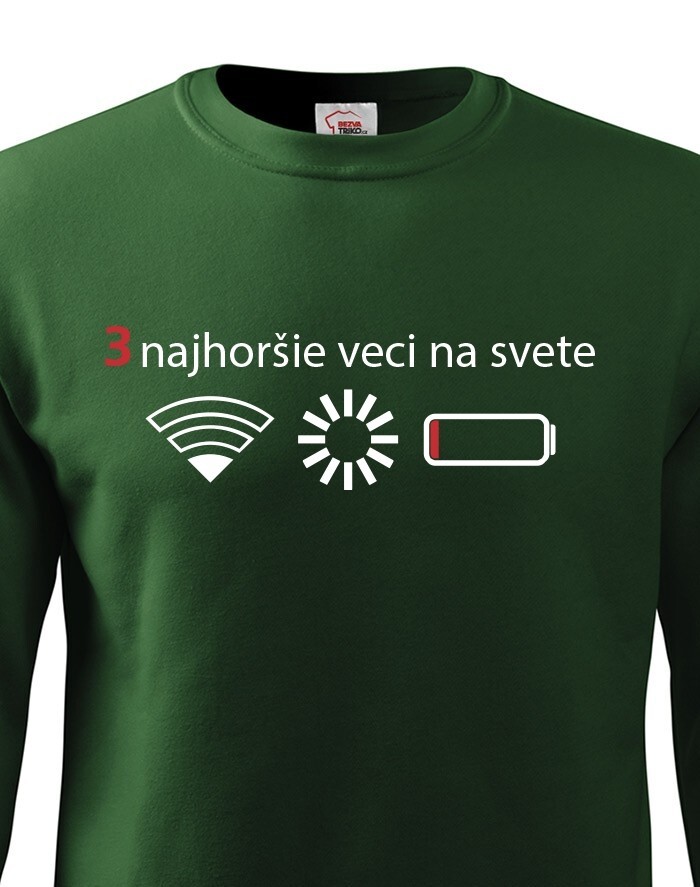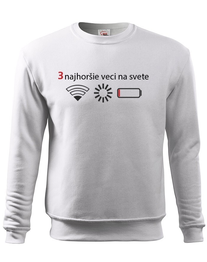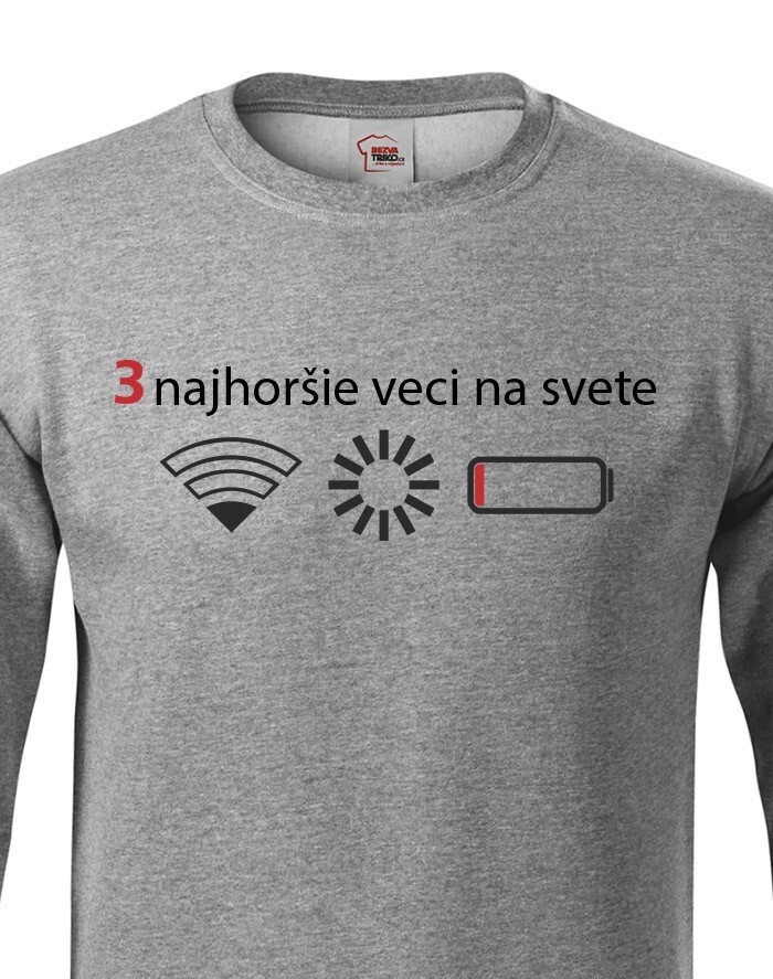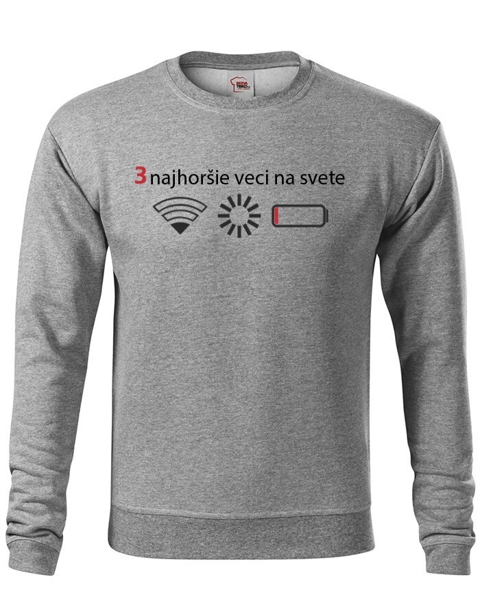 Přemýšľali ste niekedy nad tým, čo sú tri najhoršie veci na svete? Ak nie, tak už nemusíte. Máme pre vás jednoznačnú odpoveď - slabý signal WIFI, zaseknutá apka a dochádzejúca batéria. Naša vtipná mikina s potlačou nebezpečne reflektuje dnešnú dobu, kedy bez mobilného telefónu nikto nedá ani ranu.