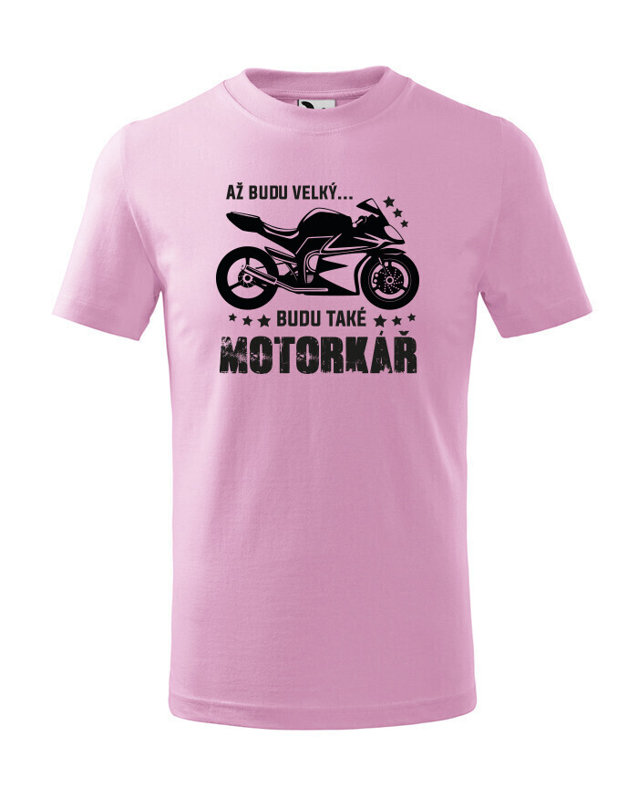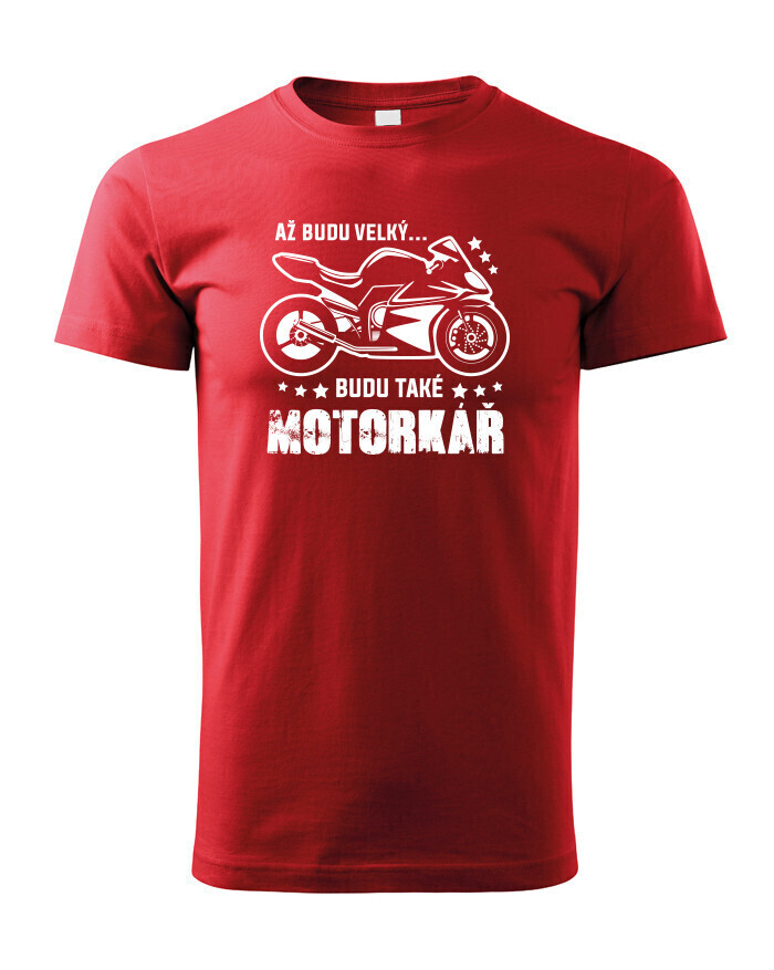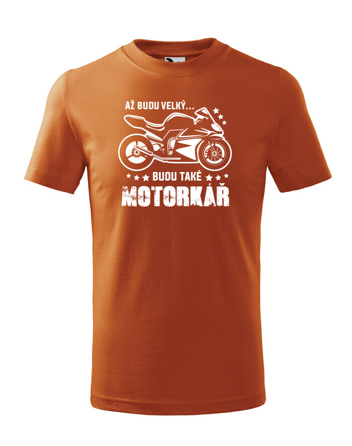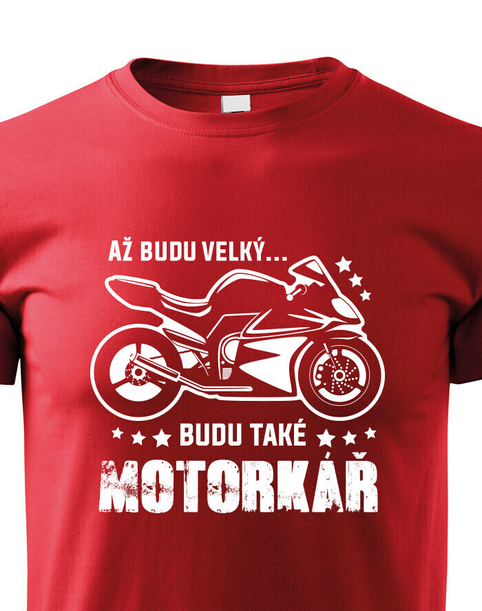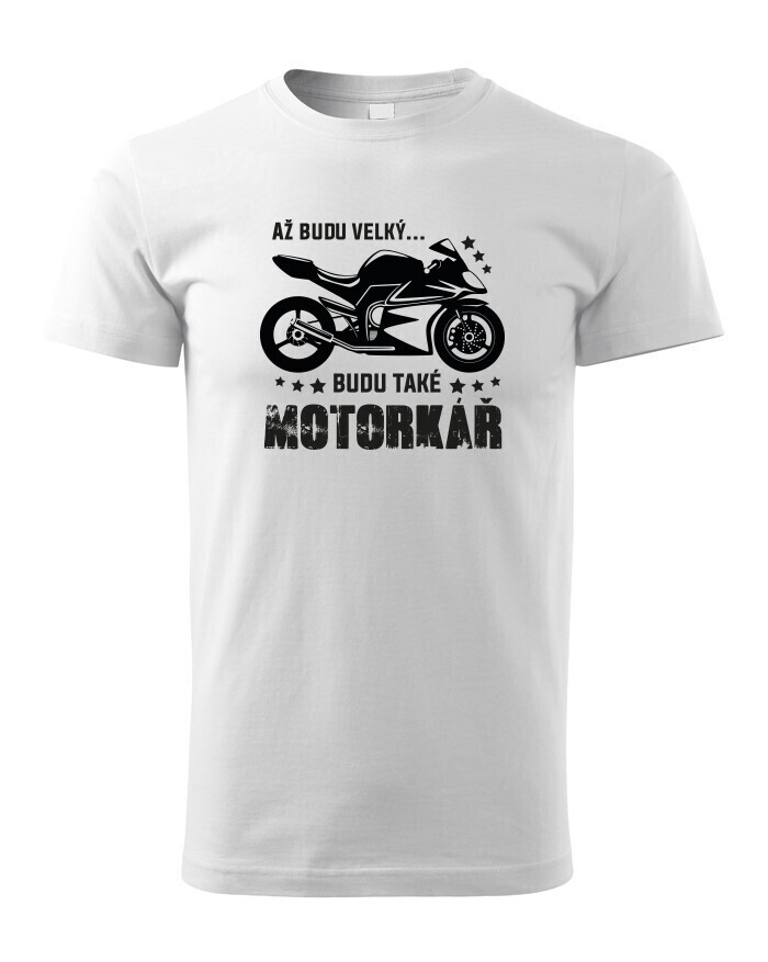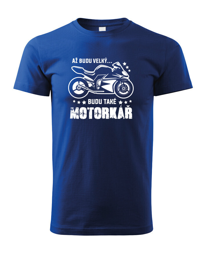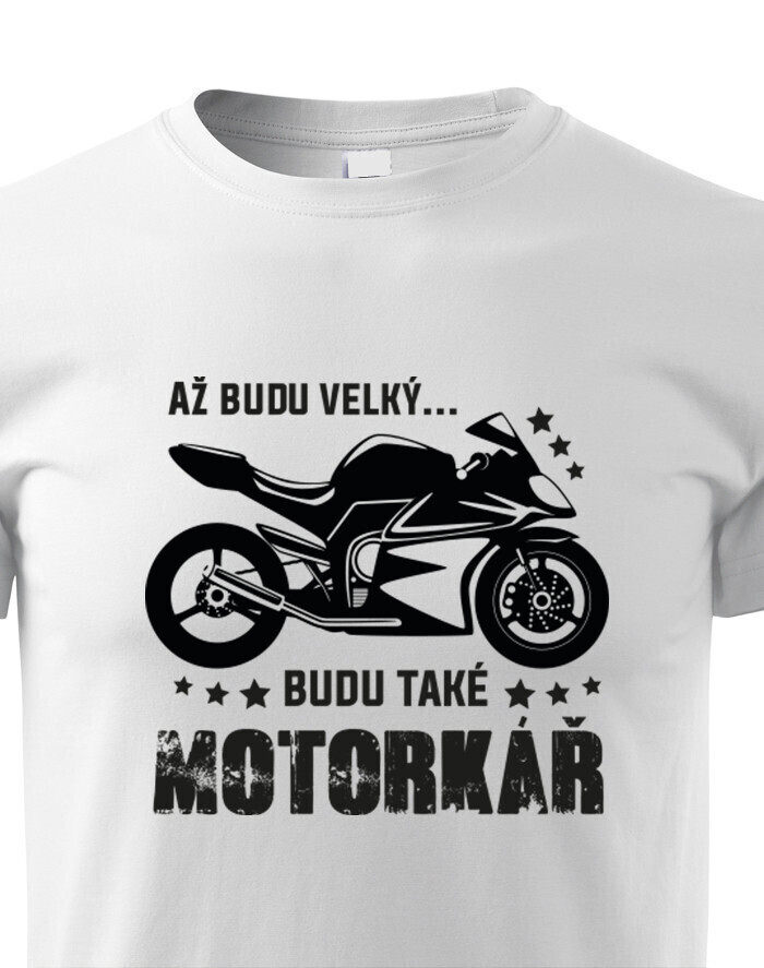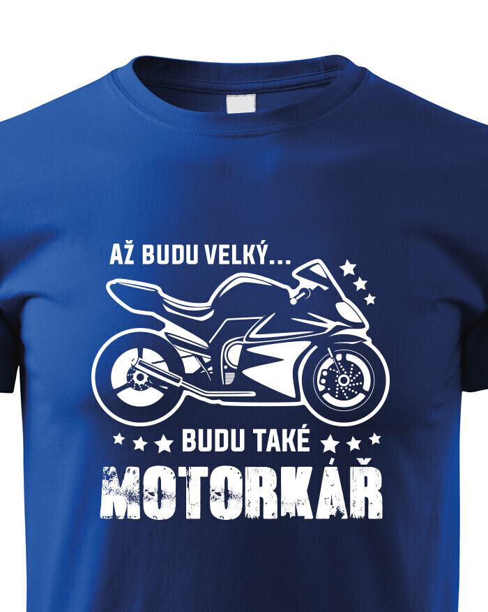 Motorkár po tatovi? Detské originálné tričko s potlačou motorky a nápisom "Až budem veľký budem tiež motorkár" zahreje pri srdci nejedného vášnivého motorkára. Pokiaľ vaše deti milujú vôňu benzínu a zvuk rýchlych kolies, tak potom toto tričko je ideálne pre vaše dieťa. Všetky deti majú vzor vo svojích rodičoch. Pokiaľ to vaše túži byť motorkár po tatovi, tak potom toto tričko je skvelým darčekom na narodeniny alebo Vianoce. Potlač perfektne vynikne na modrom alebo čiernom tričku, ale vedľa nešliapnete ani s inou farebnou variantou. Tričko sa hodí do školy, na tréningy alebo von s kamarátmi - jednoducho všade.