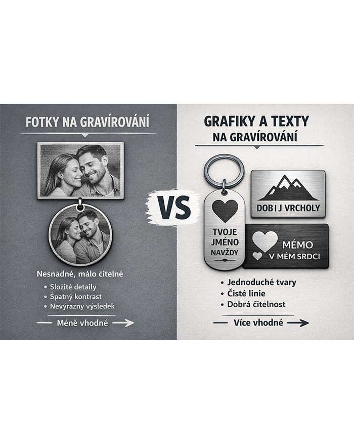 I když se kreativitě meze nekladou, je dobré mít na paměti, že gravírování na placatku s imitací kůže funguje jinak než klasický barevný tisk. Motiv vzniká pomocí laseru, který zviditelňuje spodní vrstvu materiálu, takže výsledný efekt pracuje především s kontrastem – nikoli s barvami. Výsledný motiv je vždy jednobarevný a jeho odstín je dán barvou podkladové vrstvy. Nejlépe proto vyniknou texty, jednoduché symboly, lineární grafika a kvalitně připravená loga bez barevných přechodů. Naopak velmi drobné detaily, tenké linky nebo složité fotografie s jemnými přechody nemusí být na menší ploše dobře čitelné.