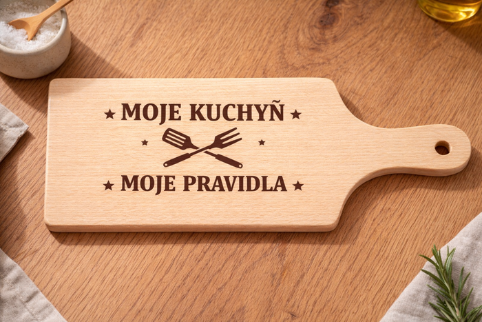 Motív Moja kuchyň, moje pravidlá jasne ukazuje, že varenie beriete vážne a s humorom. Rozmer 14×30 cm je ideálny na krájanie zeleniny, mäsa alebo syrov a kvalitné drevo zabezpečí, že doska vydrží dlhodobé používanie. Navyše si môžete nechať pridať voliteľné meno, a urobiť z dosky osobný a jedinečný darček.