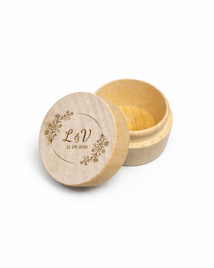 V Česku koupíte tento produkt zde: Dřevěná kulatá krabička 4x2,7 cm na svatební prstýnky kruh