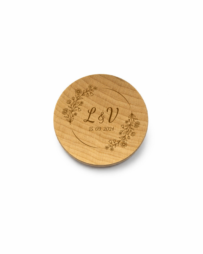 Drevená okrúhla krabička 4×2,7 cm na svadobné prstene kruh