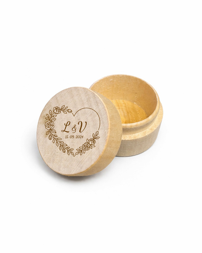 V Česku koupíte tento produkt zde: Dřevěná kulatá krabička 4x2,7 cm na svatební prstýnky srdce