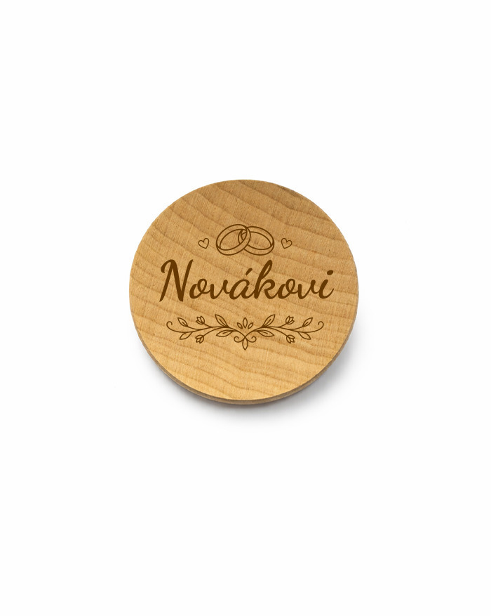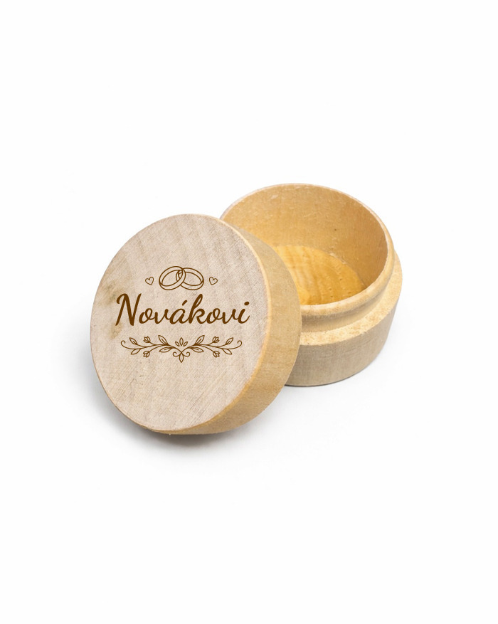 Drevená okrúhla krabička 4×2,7 cm na svadobné prstene s priezviskom