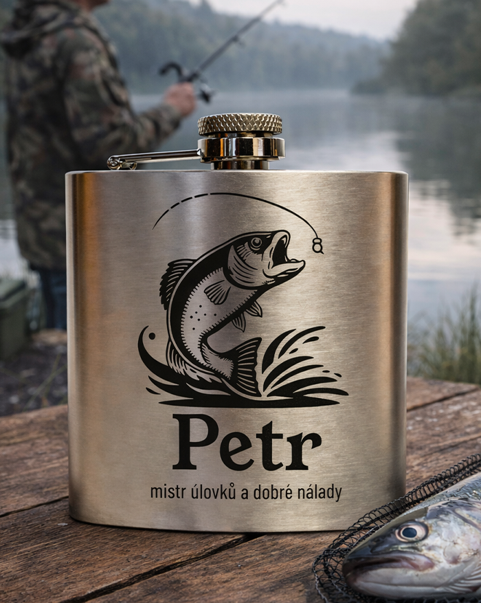 Motív „Majster úlovkov a dobrej nálady“ zaujme na prvý pohľad a možnosť doplniť vlastné meno z nej robí jedinečný kúsok. Nie je to len ploskačka, ale osobný doplnok, ktorý patrí konkrétnemu rybárovi. Ideálna k vode, na výlety aj bežné nosenie.