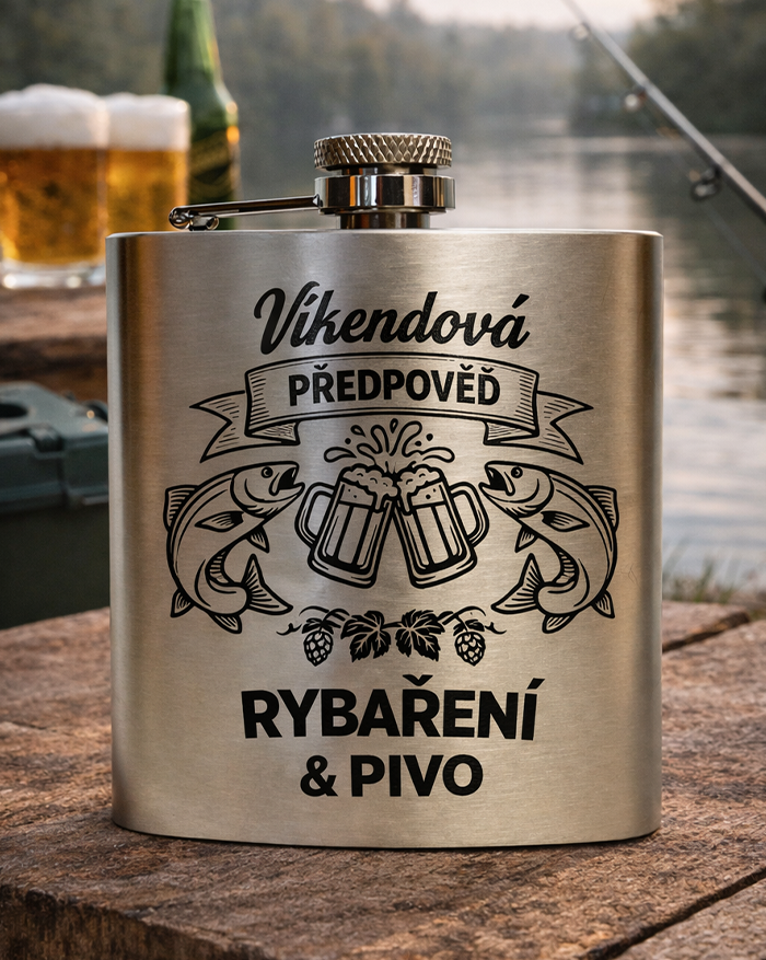 Zabudni na počasie. Pre správneho rybára je víkendová predpoveď vždy rovnaká – rybačka a pivo. Táto nerezová ploskačka s vtipným motívom to vystihuje dokonale. Ideálna pre každého, kto miluje chvíle pri vode a pohodu.