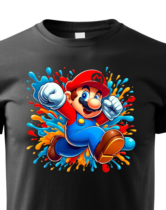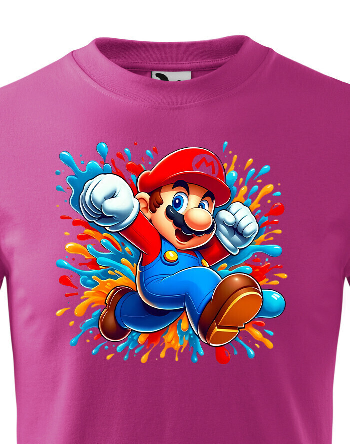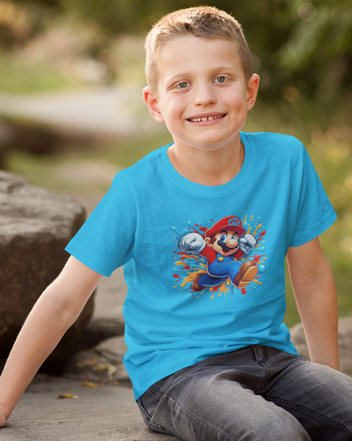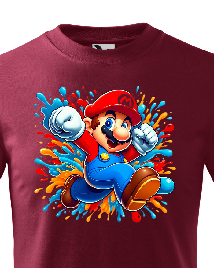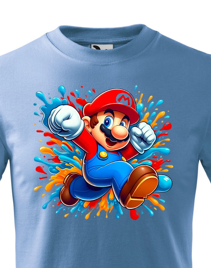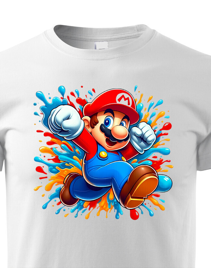 Detské tričko s motívom Mario zo série Super Mario zobrazuje Maria v ikonickej víťaznej póze – vo výskoku s rukou hore, pripraveného zdolať ďalšiu výzvu. Farebné striekance okolo postavy dodávajú dizajnu moderný a energický vzhľad, ktorý okamžite pritiahne pozornosť.