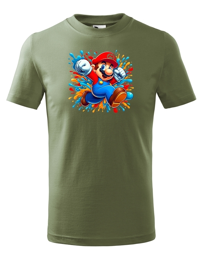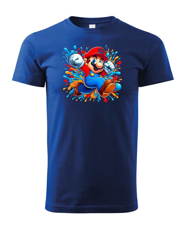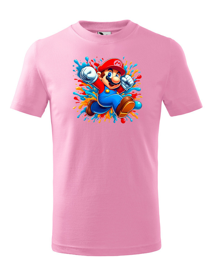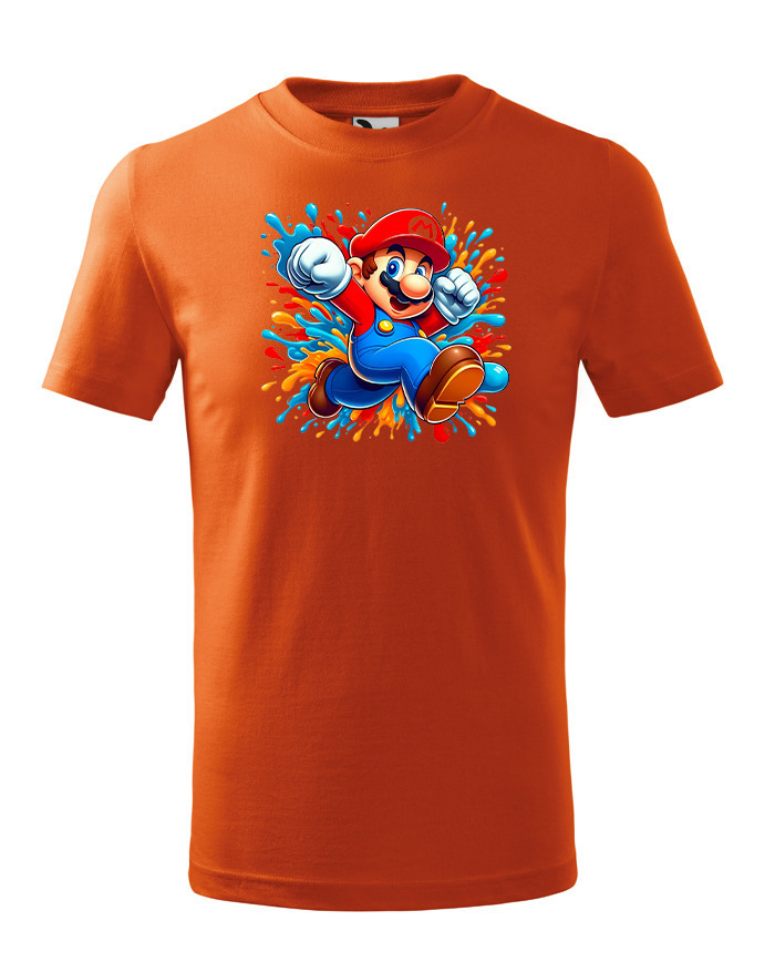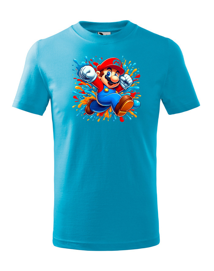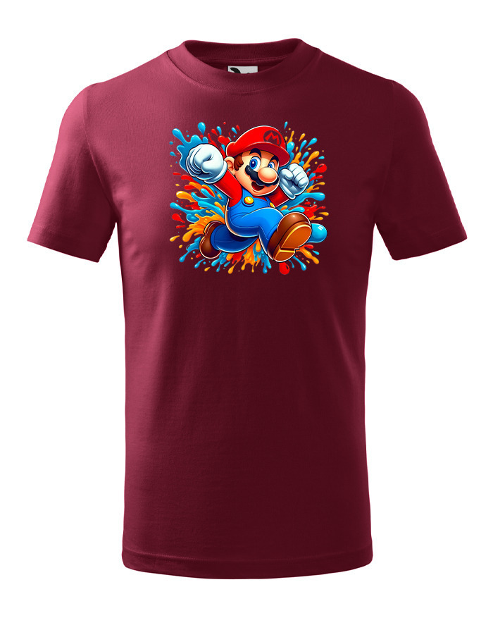 Detské tričko s motívom Mario zo série Super Mario zobrazuje Maria v ikonickej víťaznej póze – vo výskoku s rukou hore, pripraveného zdolať ďalšiu výzvu. Farebné striekance okolo postavy dodávajú dizajnu moderný a energický vzhľad, ktorý okamžite pritiahne pozornosť.