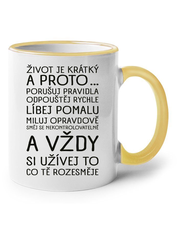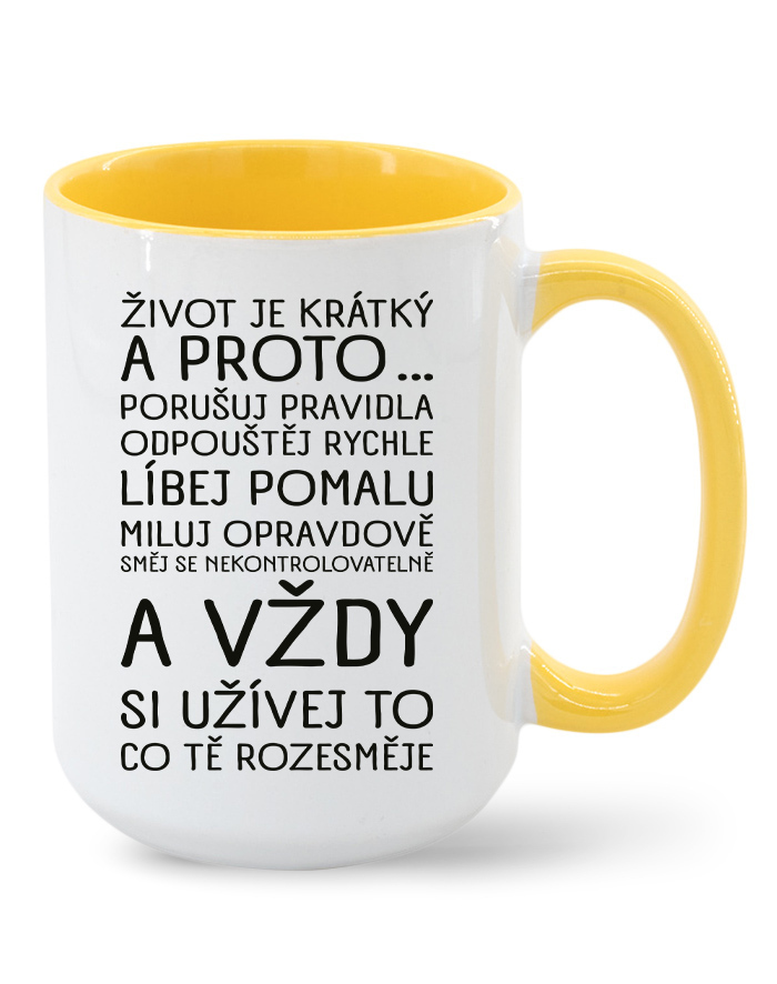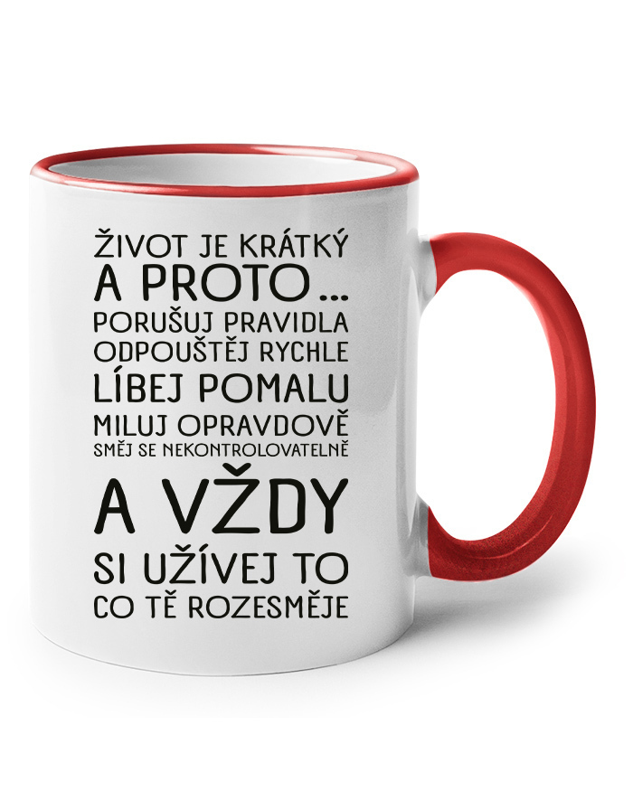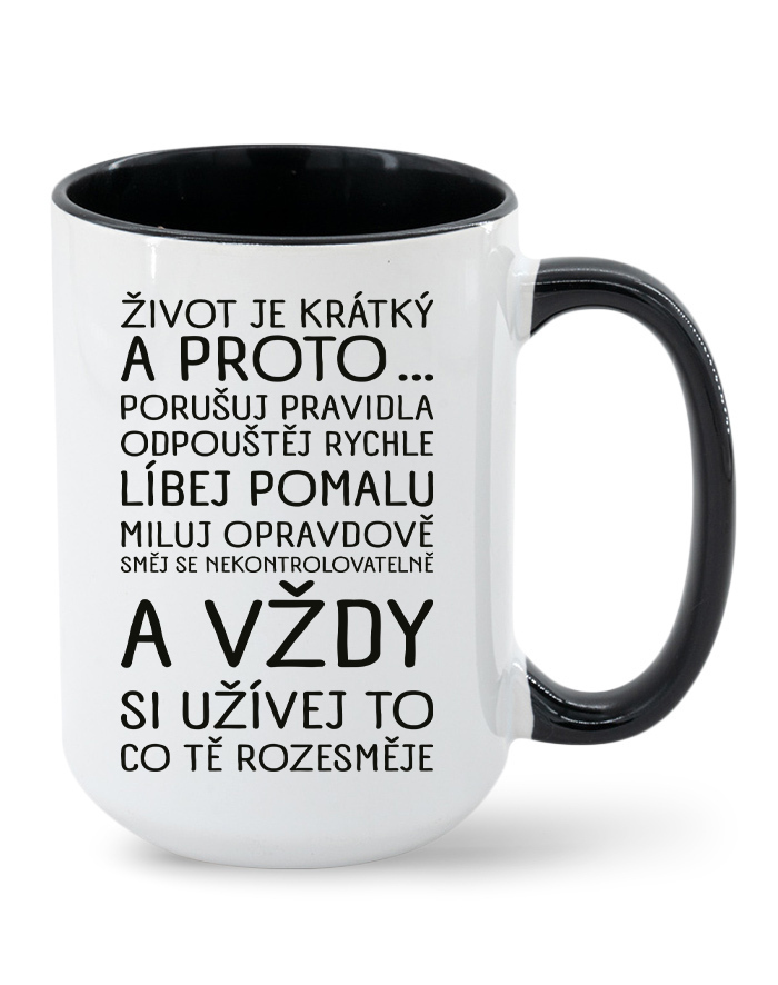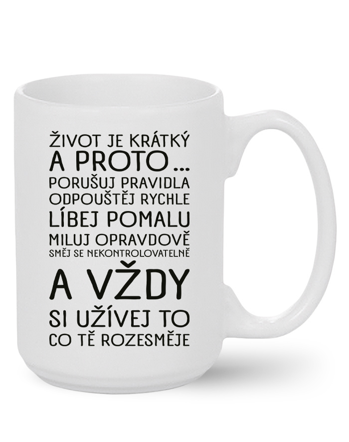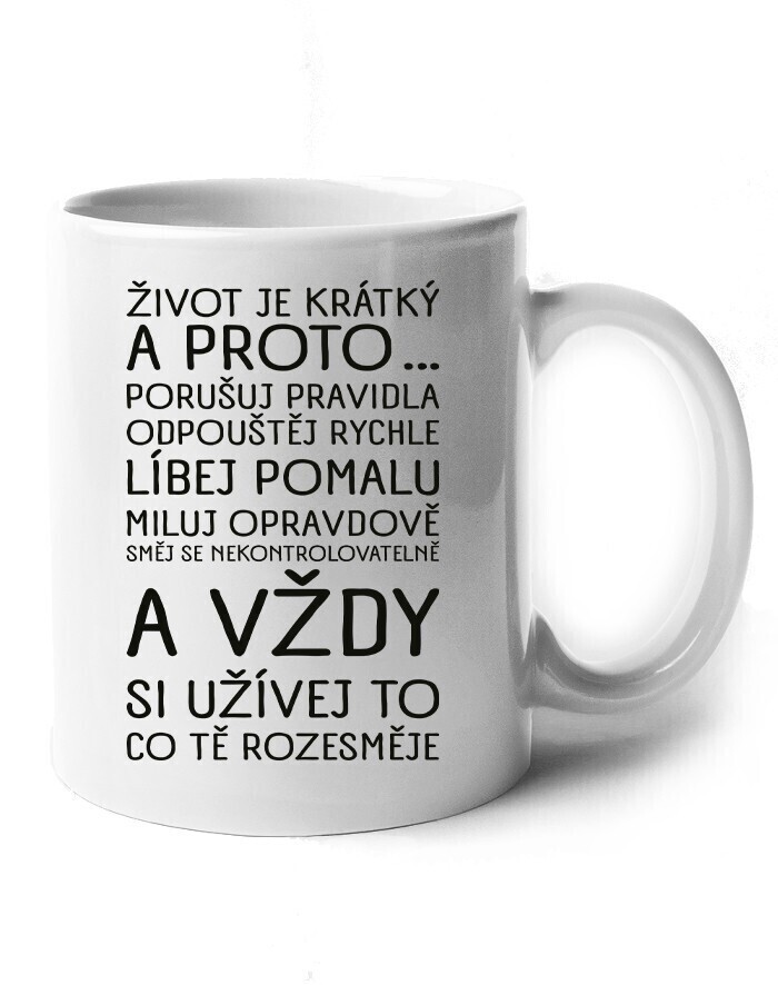 Na našom keramickom hrnčeku nájdeš motív, ktorý ti pripomenie, že každý okamih stojí za to. S nápisom: „Život je krátky a preto … porušuj pravidlá, odpúšťaj rýchlo, bozkávaj pomaly, miluj opravdivo, smej sa nekontrolovateľne a vždy si užívaj to, čo ťa rozosmeje" je tento hrnček viac než len nádobou na pitie – je malou dennou inšpiráciou.