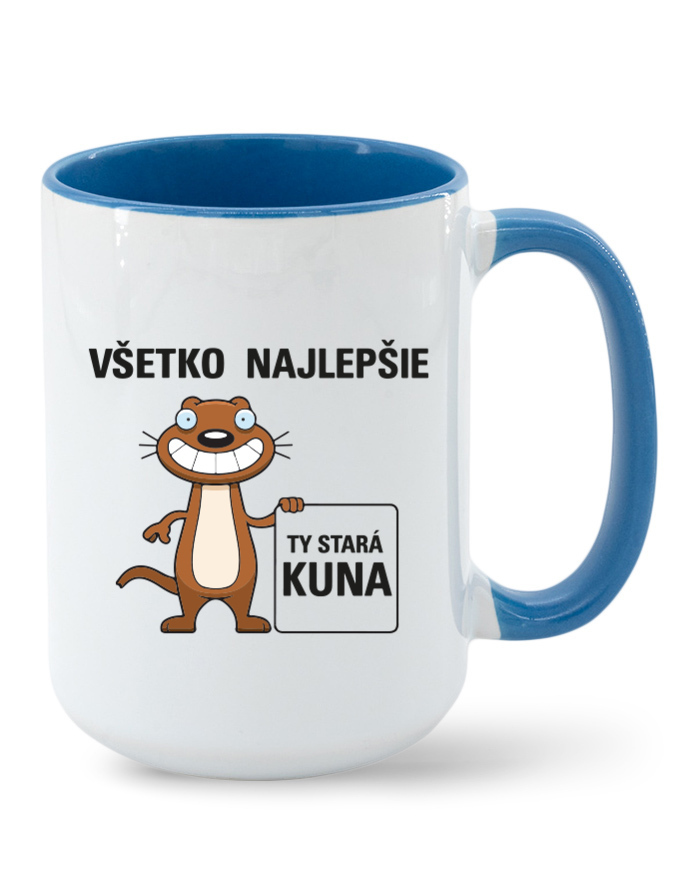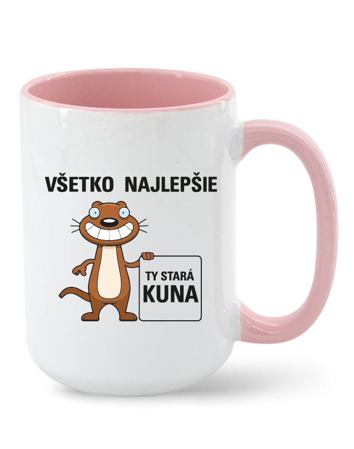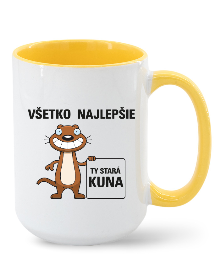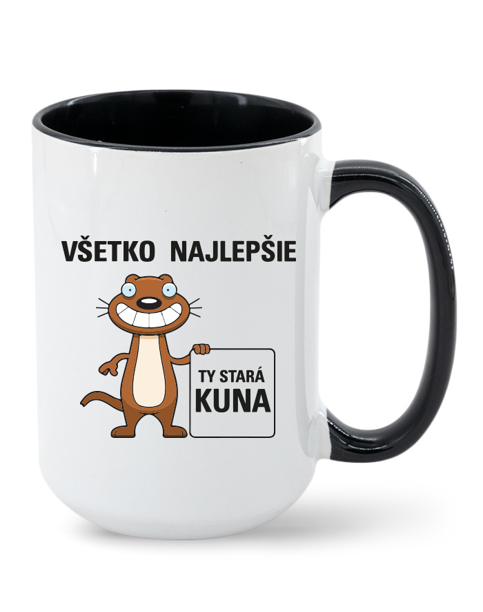 Vtipný narodeninový hrnček s potlačou "Všetko najlepšie ty stará kuna. Hľadáte vtipný narodeninový hrnček nad ktorým sa človek zasmeje? Hrnček patrí medzi veľmi užitočný darček doma aj v práci. Darujte niekomu tento vtipný hrnček. Obdarovaná osoba sa zaručene zasmeje aj poteší.