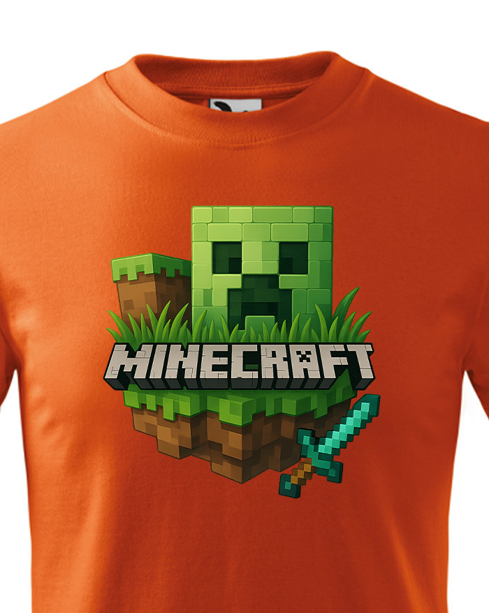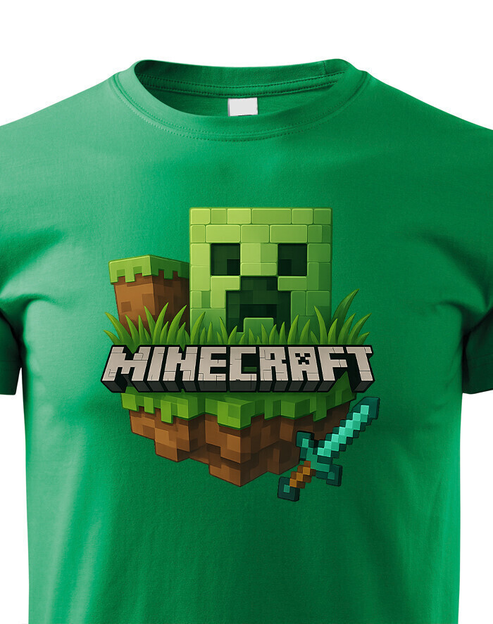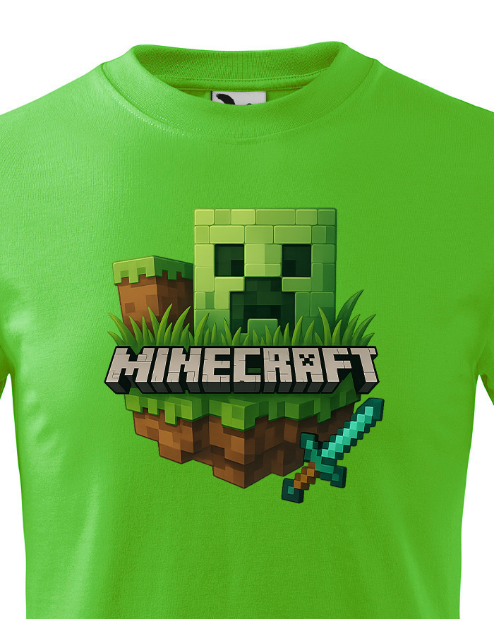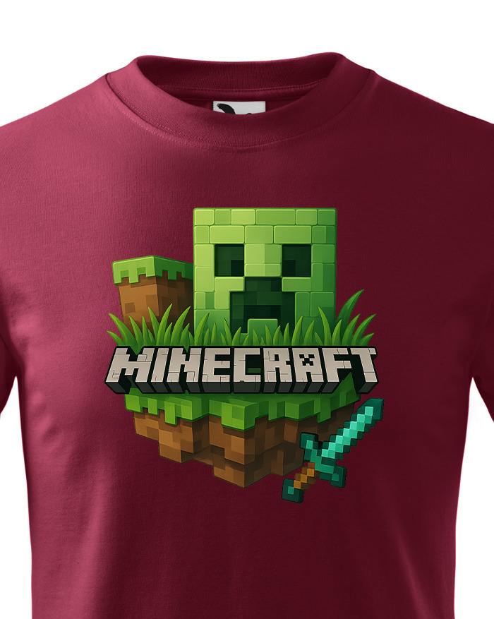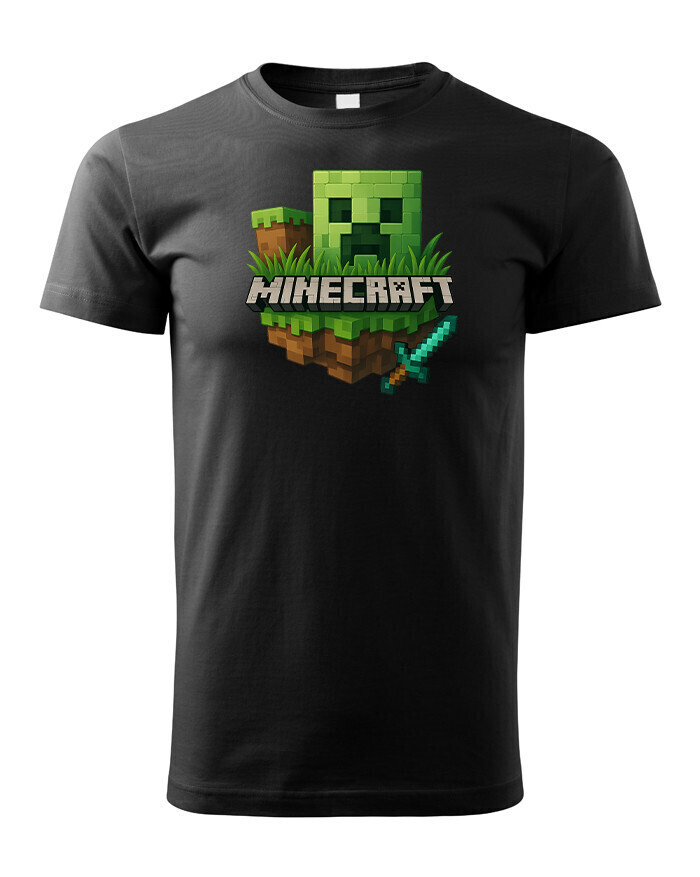 Veľká hlava Creepera v kombinácii s kockovaným terénom a hernou zbraňou vytvára dynamický motív, ktorý každý fanúšik Minecraftu okamžite spozná. Tričko pôsobí hravo a jasne ukazuje, že jeho nositeľ patrí do herného sveta.