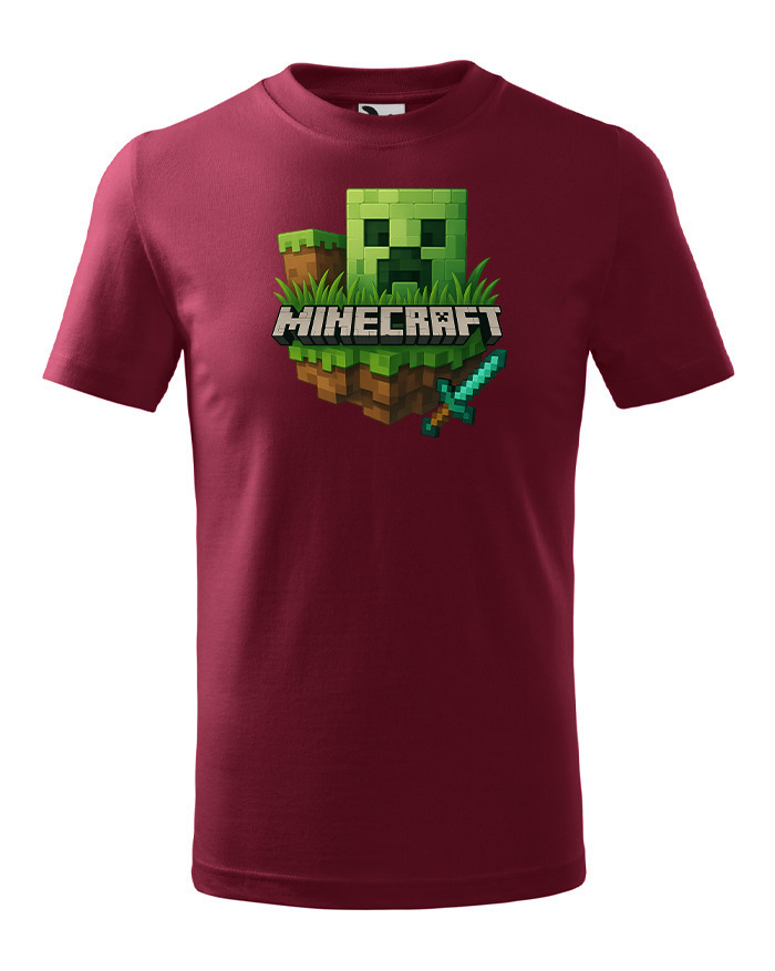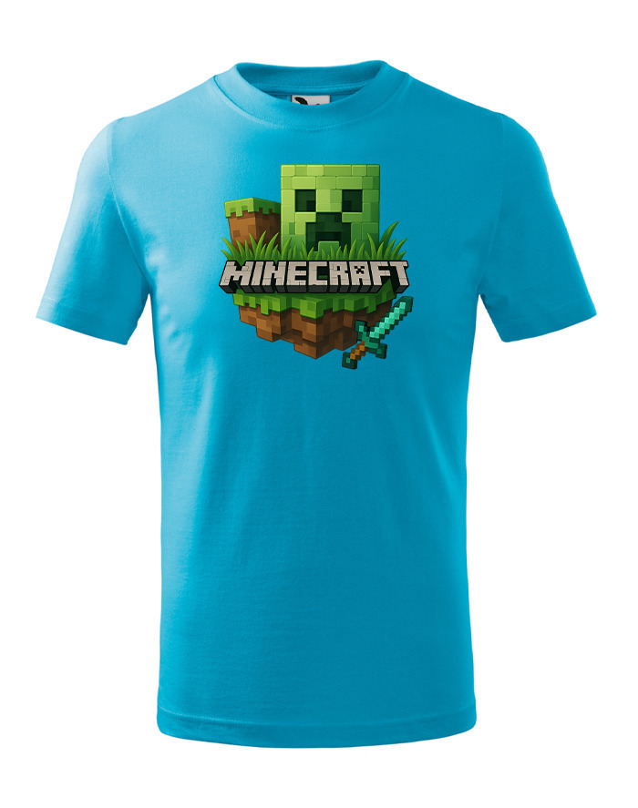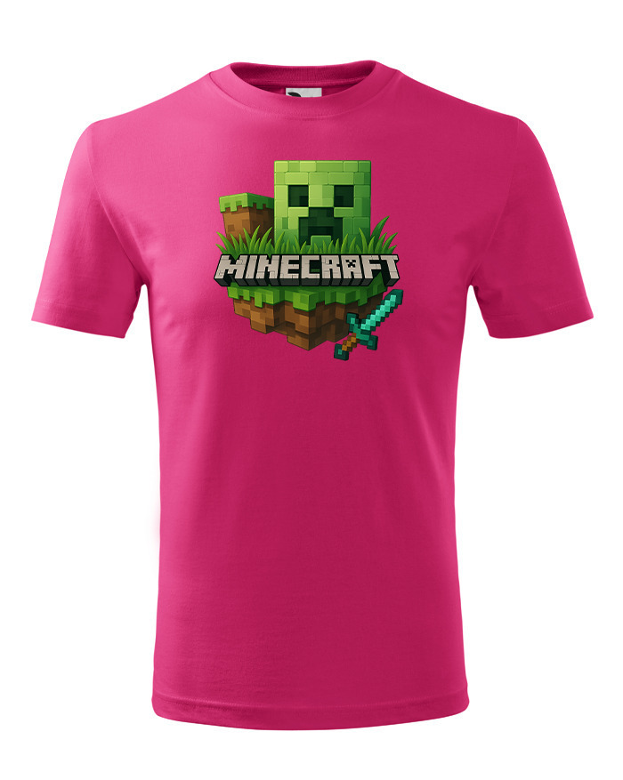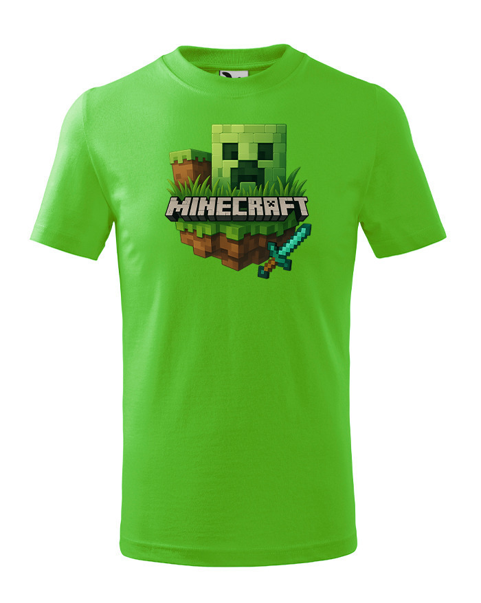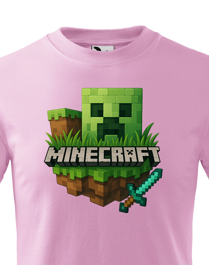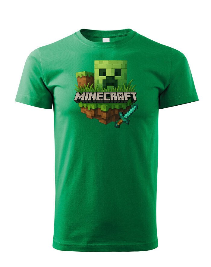 Veľká hlava Creepera v kombinácii s kockovaným terénom a hernou zbraňou vytvára dynamický motív, ktorý každý fanúšik Minecraftu okamžite spozná. Tričko pôsobí hravo a jasne ukazuje, že jeho nositeľ patrí do herného sveta.