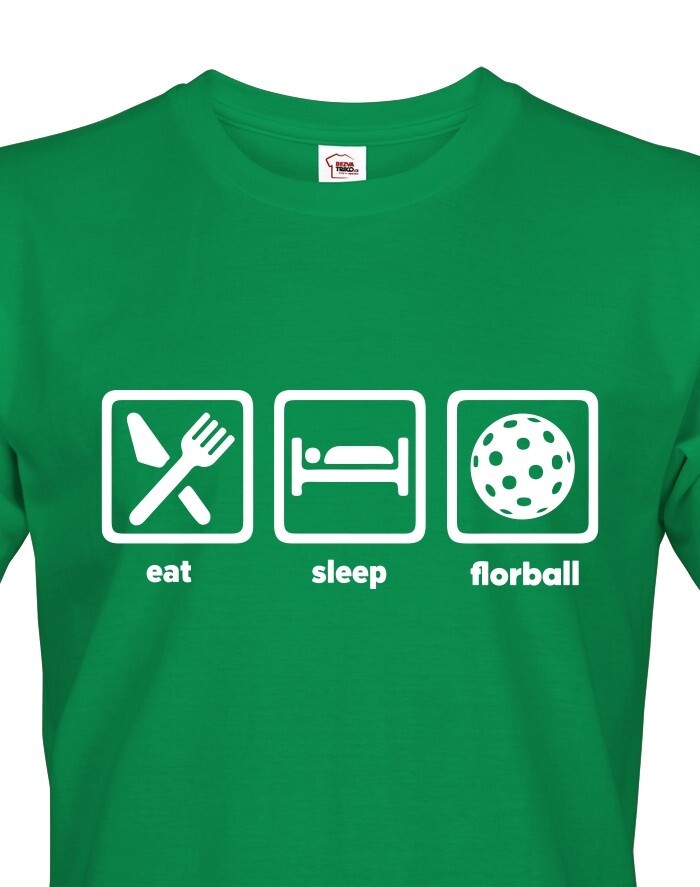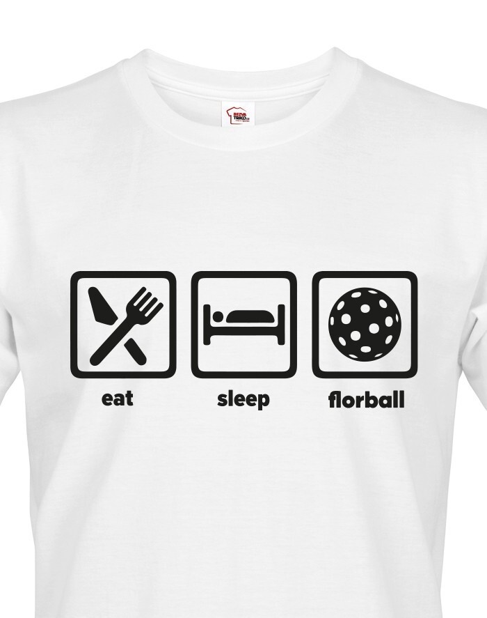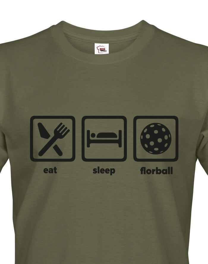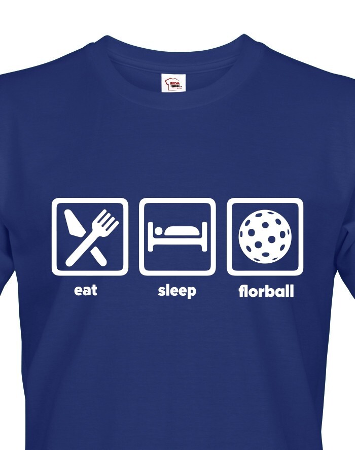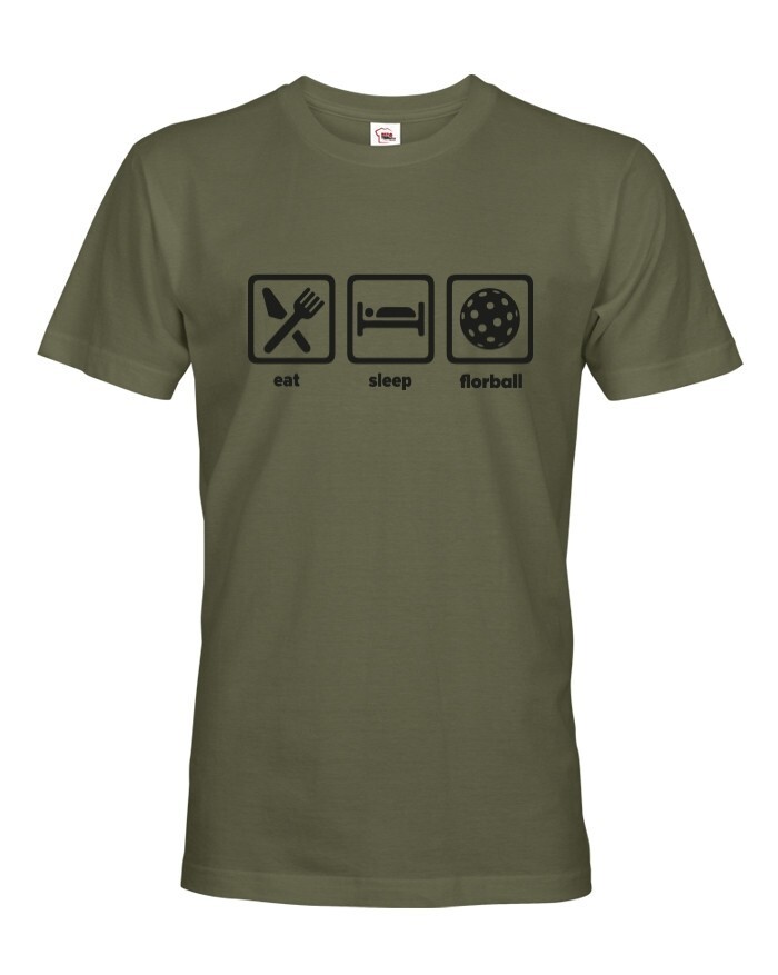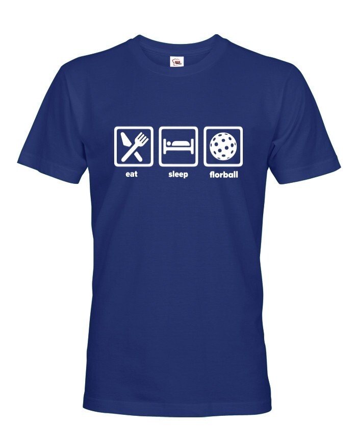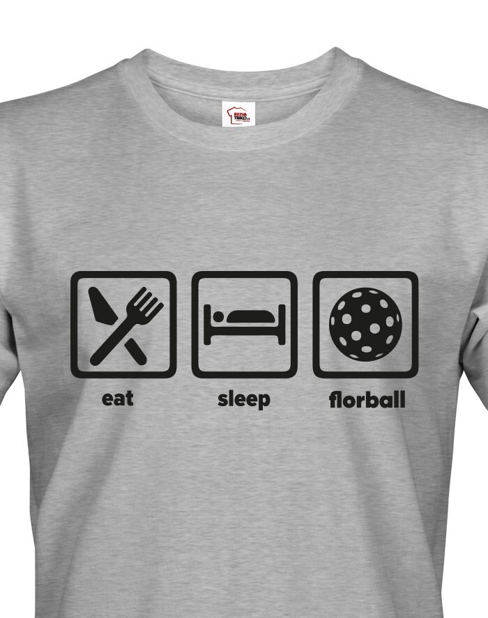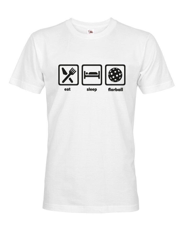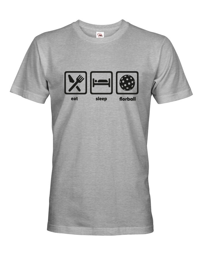 Pánske tričko s potlačou eat, sleep, florbal. Tričko pre všetkých hráčov a fanúšikov florbalu. Tričko sa hodí, ako na zápas, tak aj na denné nosenie. Pánske tričko urobí radosť k narodeninám, Vianociam alebo jednoducho len tak.