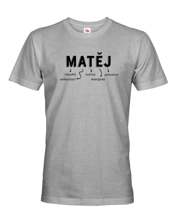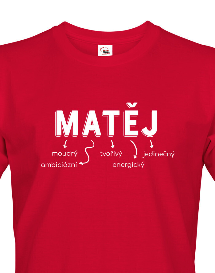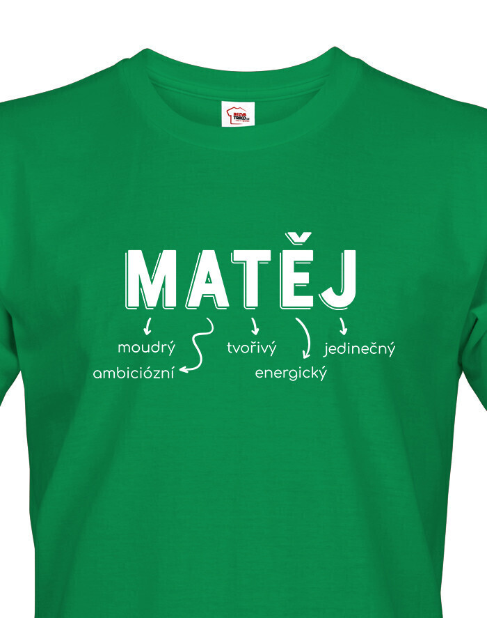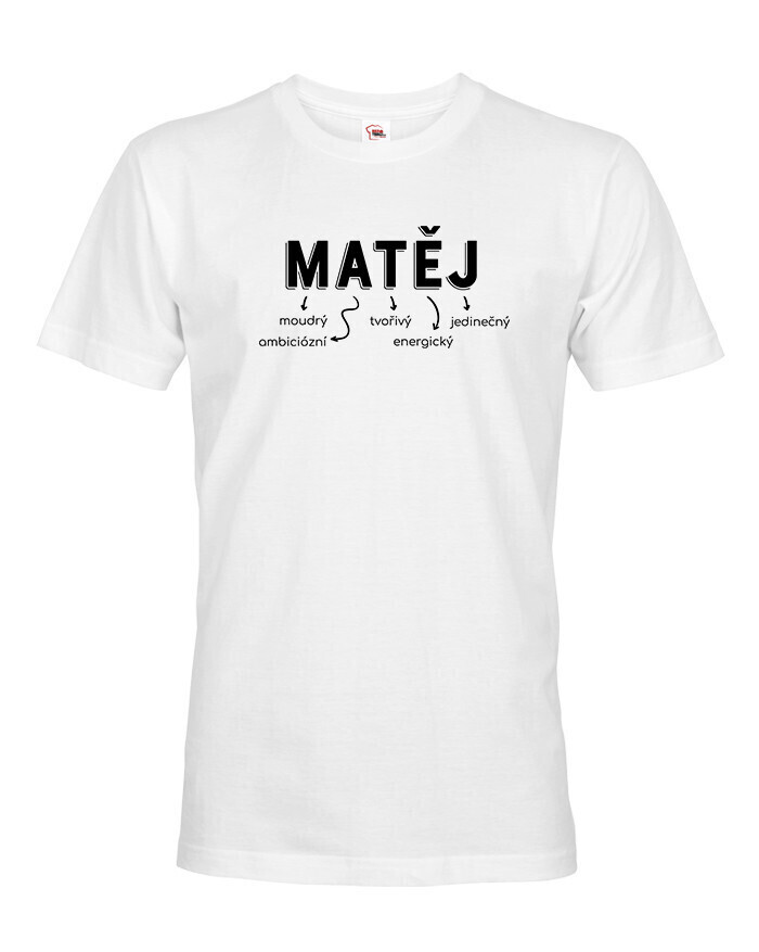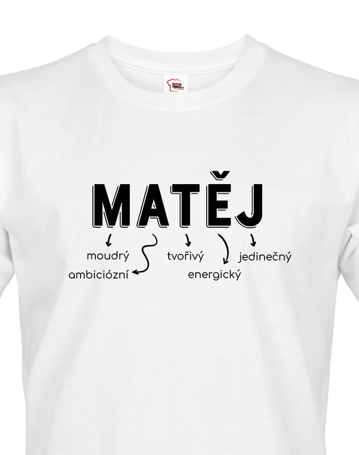 Meno Matěj vyjadruje osobnosť: múdry, ambiciózny, tvorivý, energický a jedinečný. Dizajn s vlastným menom dodáva tričku jedinečný a osobitý vzhľad, ktorý určite vyčarí úsmev obdarovaného.
