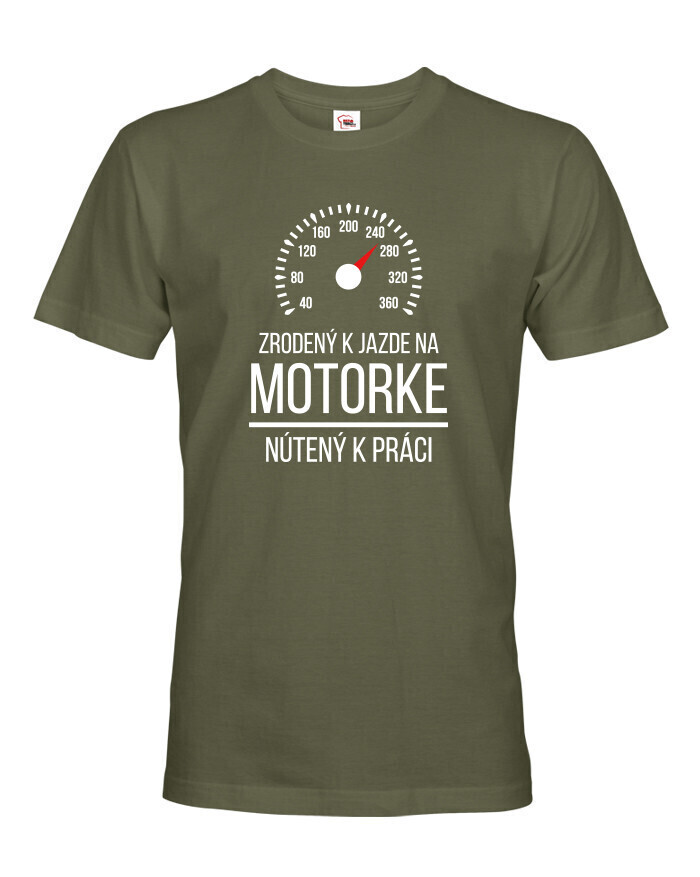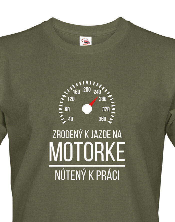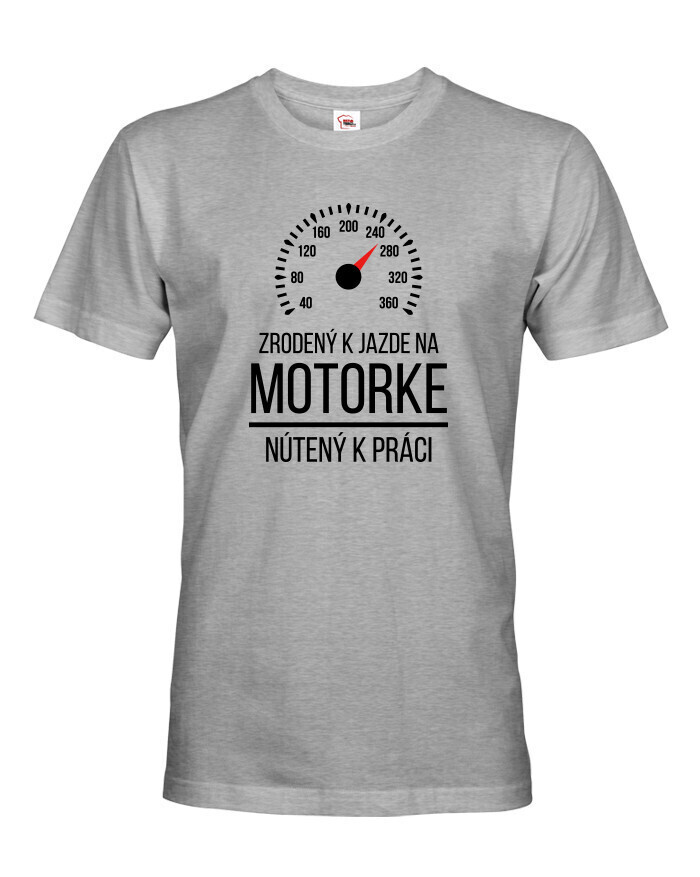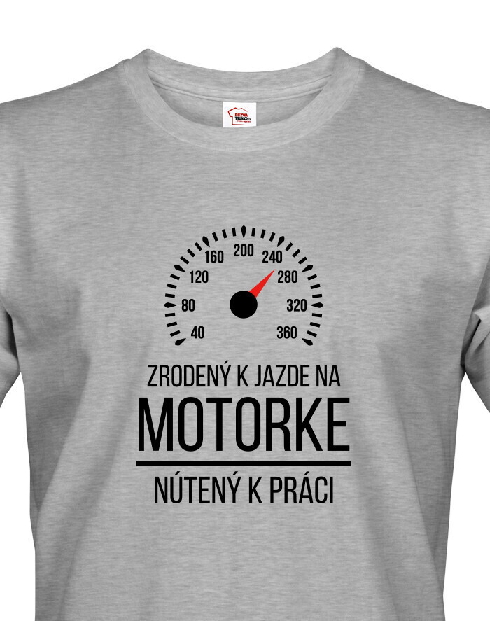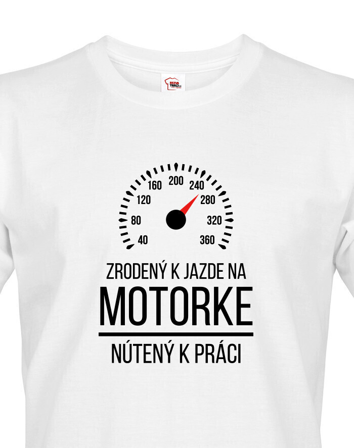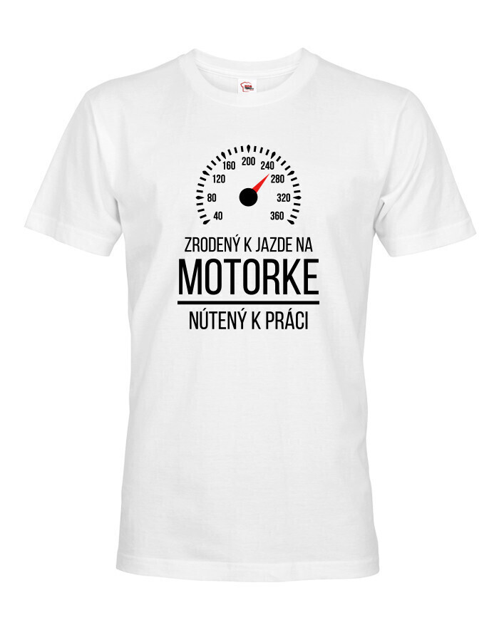 Originálne tričko s potlačou pre všetkých zapálených motorkárov. Motív "Zrodený k jazde na motorke, nútený k práci" bude dokonalým vyjadrením pocitov každého motorkára. Urobte radosť motorkárovi týmto skvelým darčekom k narodeninám alebo Vianociam. Motív s tachometrom, kde rýchlosť prekračuje 240 km/h vždy pripomenie, že život sa musí prežiť naplno!