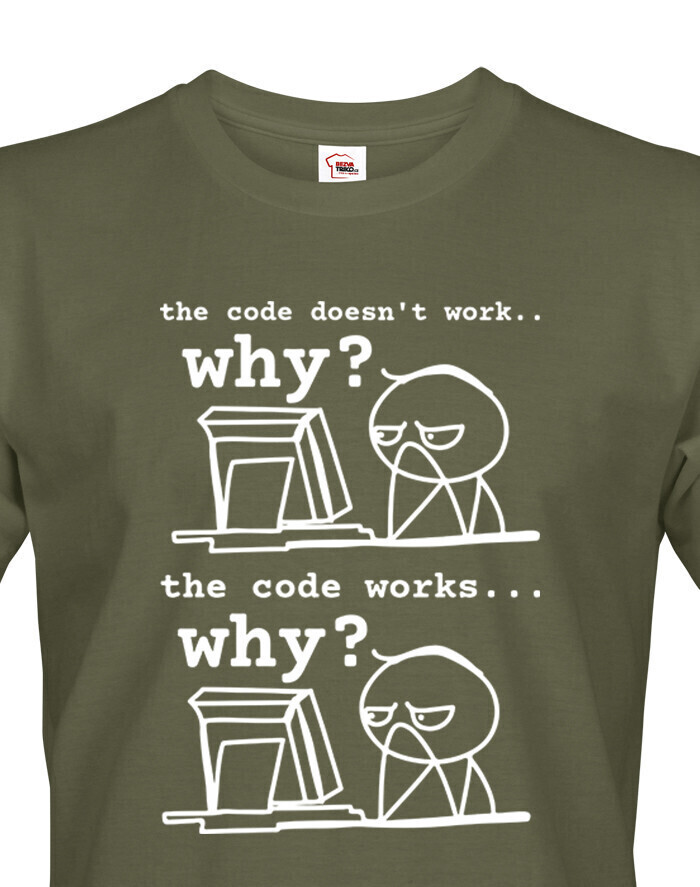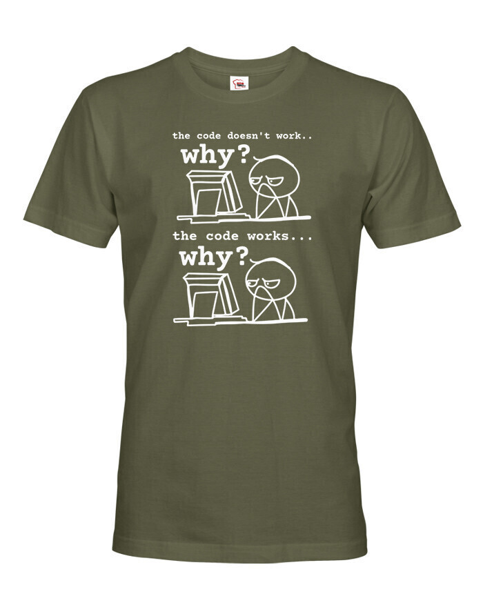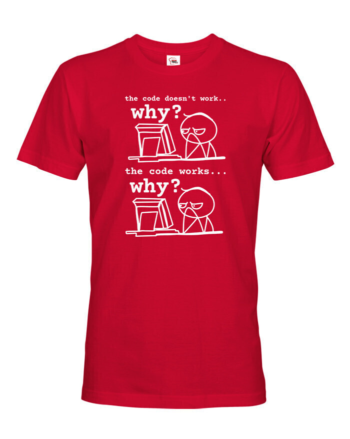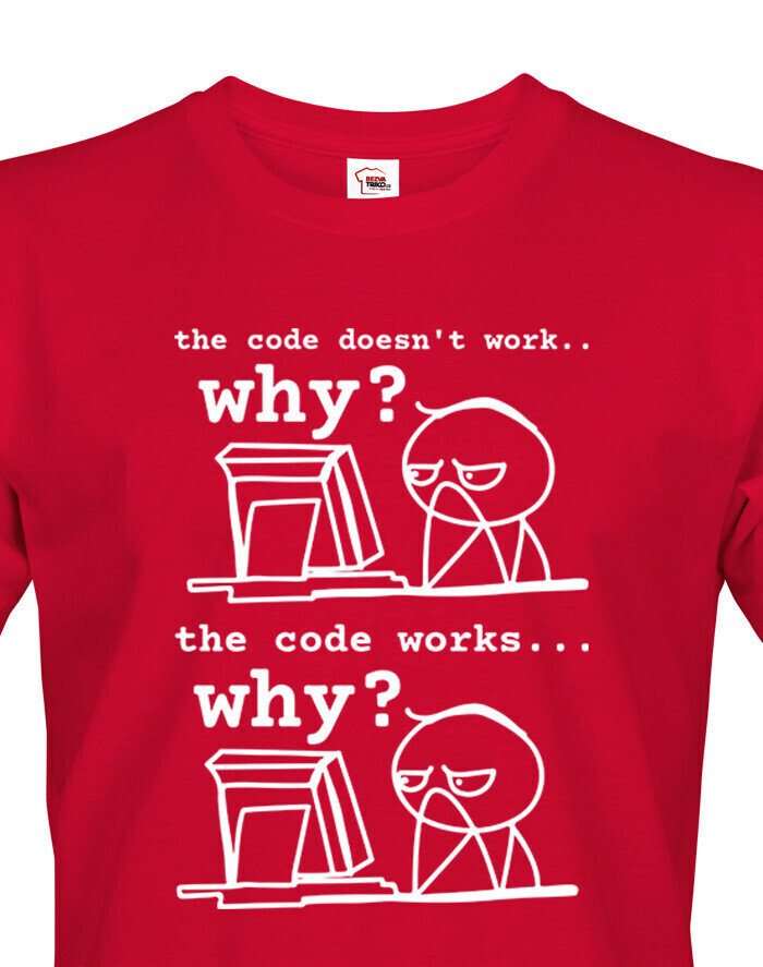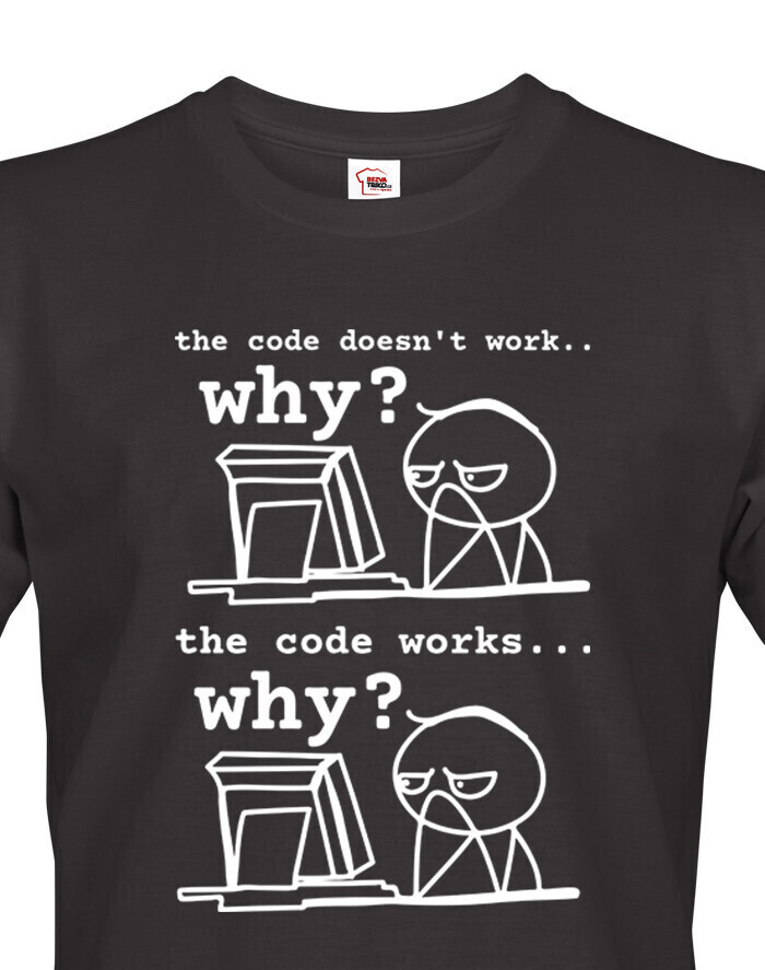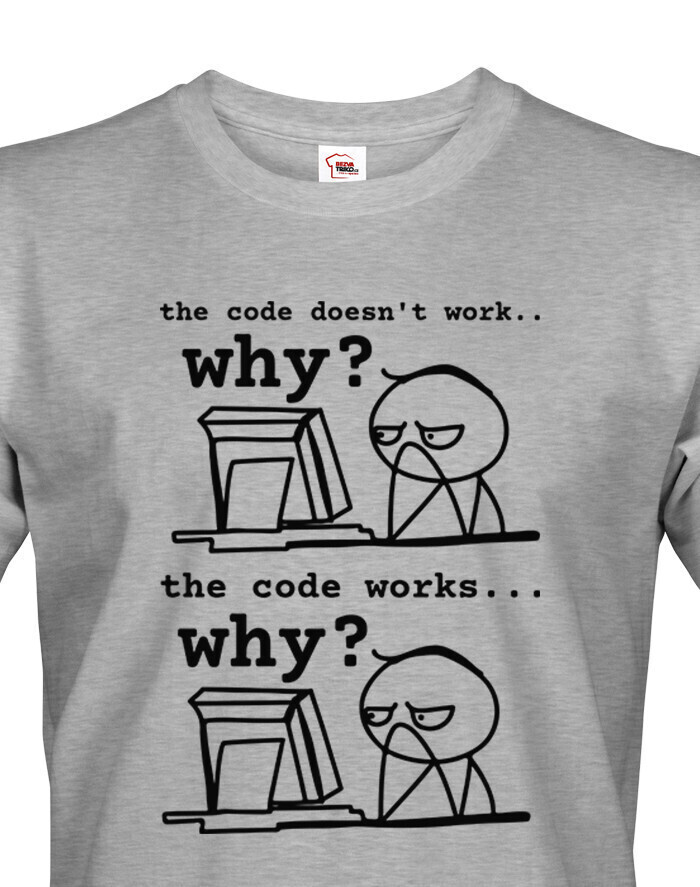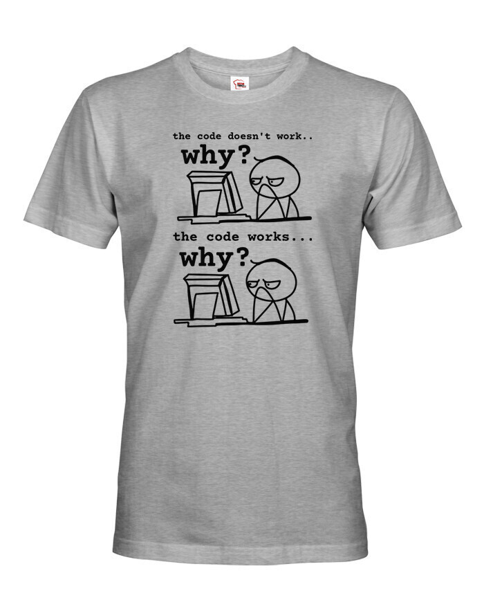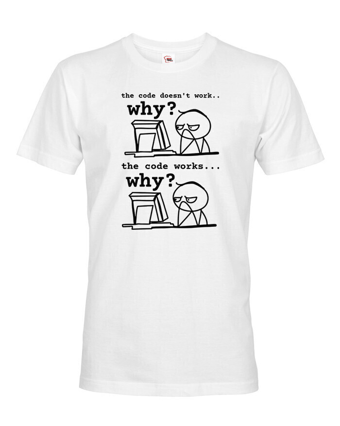 Toto tričko pre programátorov dokonale vystihuje každodennú realitu vývojárov, ktorí sa najčastejšie pýtajú: „Prečo to nefunguje?“ a „Prečo to funguje?“ Vtipná potlač s jednoduchou grafikou a dvoma fázami frustrácie pobaví každého, kto sa niekedy ponoril do sveta kódu. Vyrobené z pohodlného materiálu, ideálne na bežné nosenie do práce, školy alebo na stretnutia v oblasti IT. Skvelý darček pre programátorov, študentov informatiky a všetkých geekov, ktorí si občas lámu hlavu nad monitorom. Tričko, ktoré hovorí za vás - aj keď práve mlčky hľadíte na obrazovku.