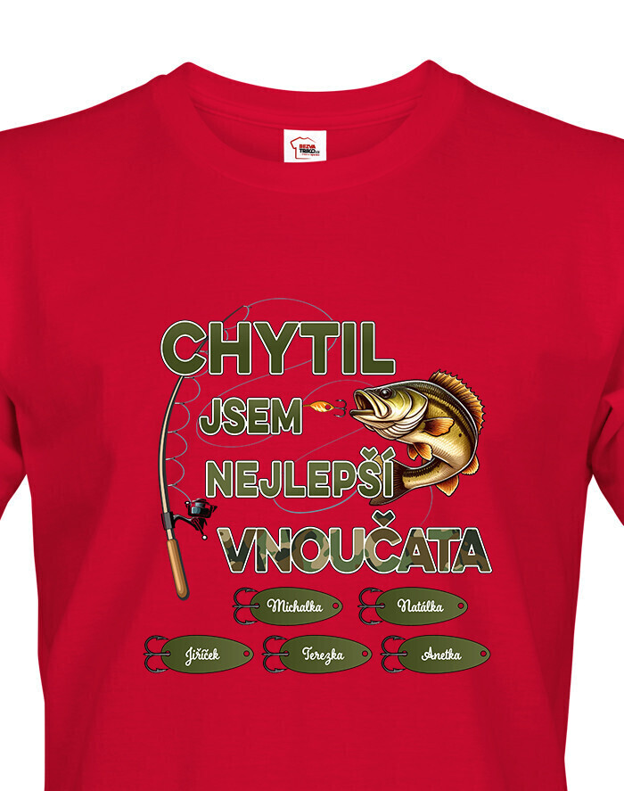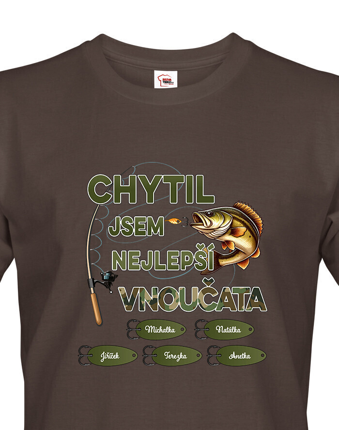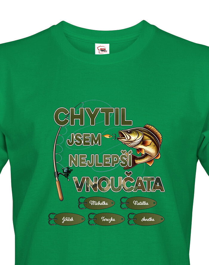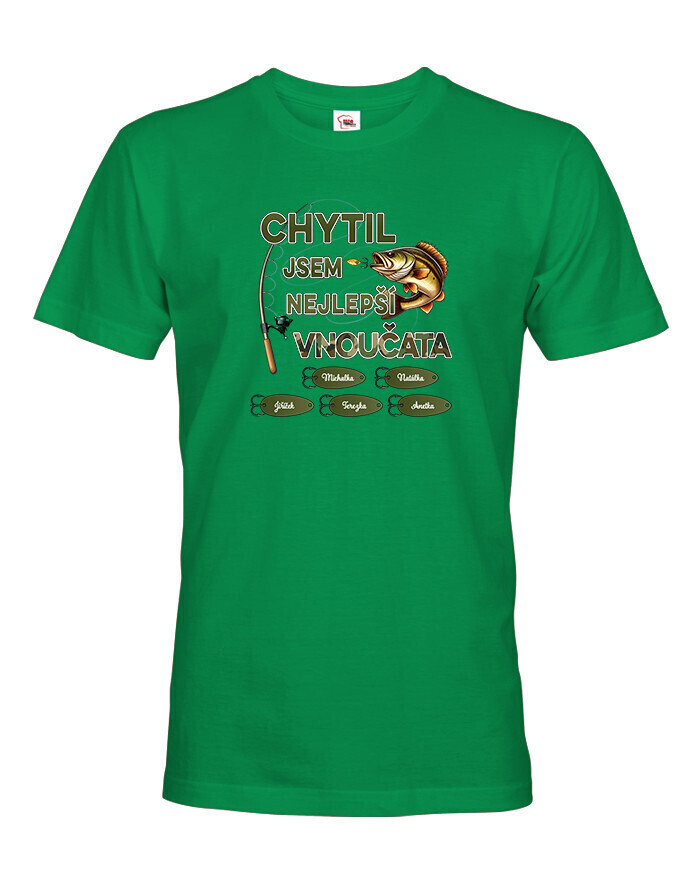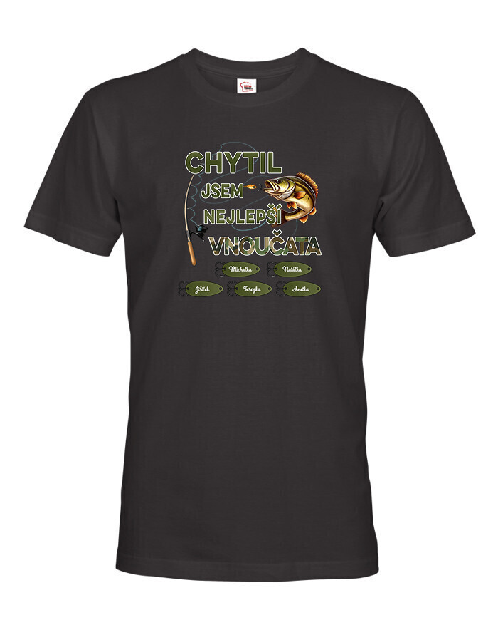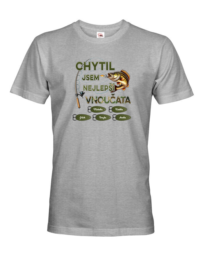 Představujeme jedinečné pánské tričko pro rybáře s vtipným motivem, které potěší každého hrdého dědečka! Na tričku je veselý nápis "Chytil jsem nejlepší vnoučata" a co víc, máte možnost přidat jména svých vnoučat a udělat z trička naprosto osobní kousek.