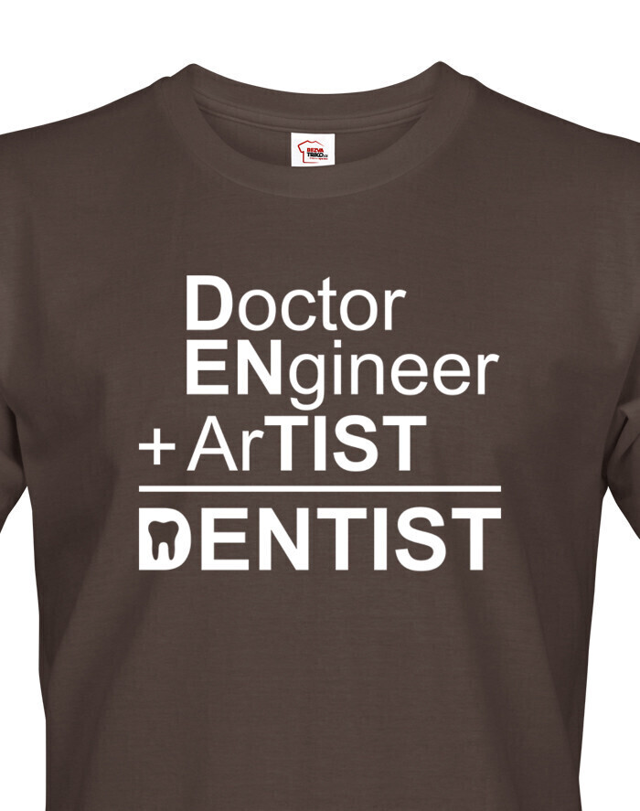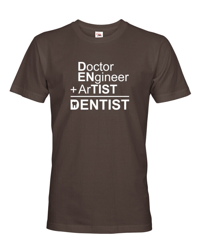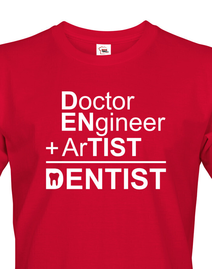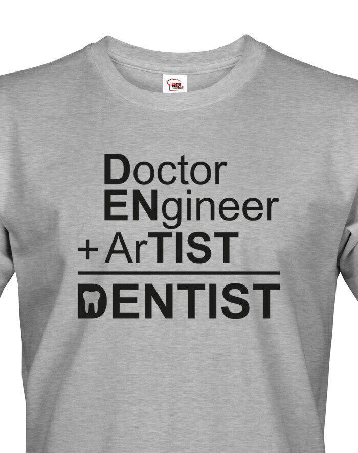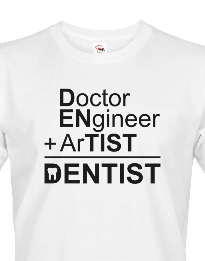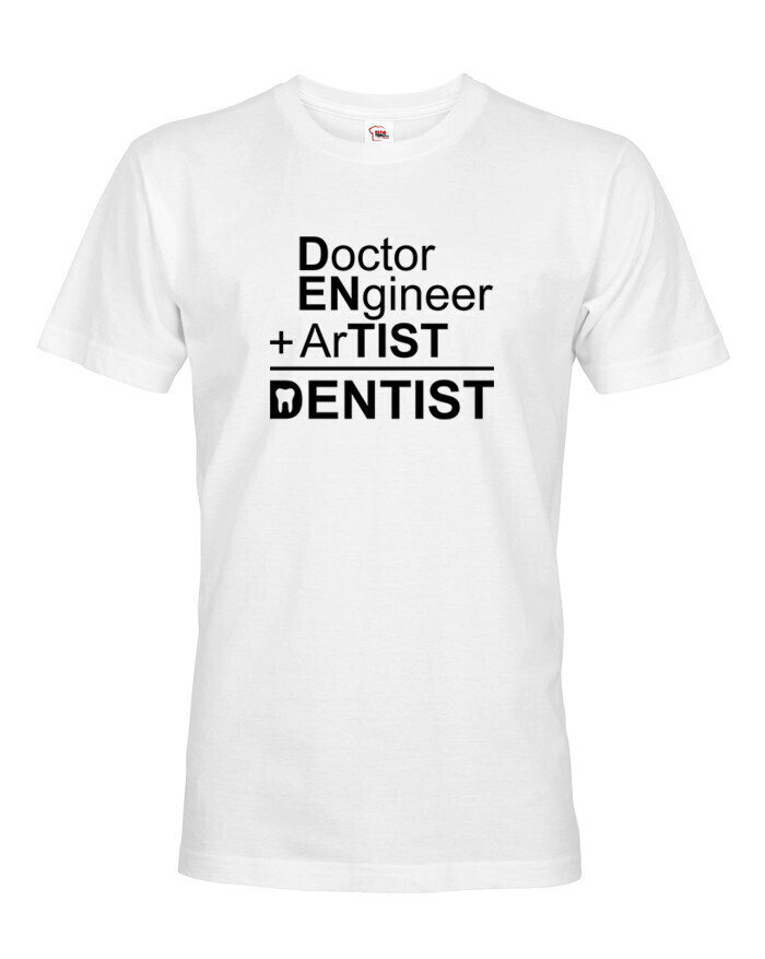 Toto štýlové pánske tričko s originálnym nápisom „Doctor, ENgineer + ARTIST = DENTIST“ je výstižnou a vtipnou poctou všetkým zubárom, ktorí vo svojej profesii spájajú precíznosť lekára, logiku inžiniera a kreativitu umelca. Je ideálna pre každého, kto pracuje v oblasti zubného lekárstva alebo práve začína na tejto ceste - či už ide o skúseného odborníka, študenta zubného lekárstva alebo čerstvého absolventa. Vďaka kvalitnému bavlnenému materiálu je tričko veľmi pohodlné na nosenie, či už v práci, pri štúdiu alebo vo voľnom čase. Biely základ a výrazná čierna potlač poskytujú moderný, čistý a profesionálny vzhľad. Je vhodná ako neotrelý darček k narodeninám, Vianociam, promócii alebo aj ako poďakovanie zubárovi, ktorý vám zachránil úsmev. Skvele sa hodí na neformálne príležitosti - napríklad na teambuilding, neformálne stretnutia s kolegami alebo len na bežné nosenie. Tričko nielen pobaví, ale zároveň vystihuje náročnosť a krásu tohto povolania. Je ideálnou voľbou pre každého, kto je hrdý na svoju profesiu a chce to dať najavo štýlovo. Či už hľadáte darček pre kolegu, priateľa, člena rodiny alebo pre seba - s týmto tričkom neurobíte chybu. Navyše originálna potlač okamžite upúta pozornosť a vyčarí úsmev na tvári každému, kto ju uvidí.