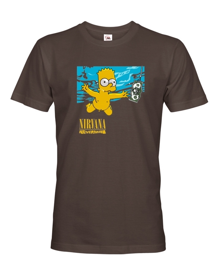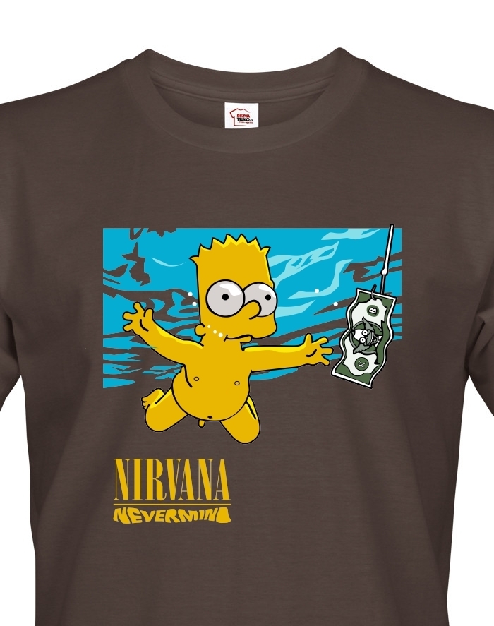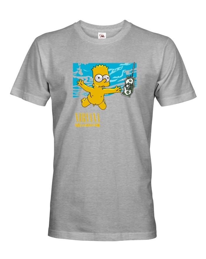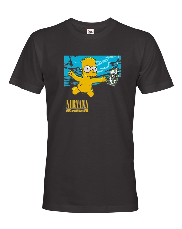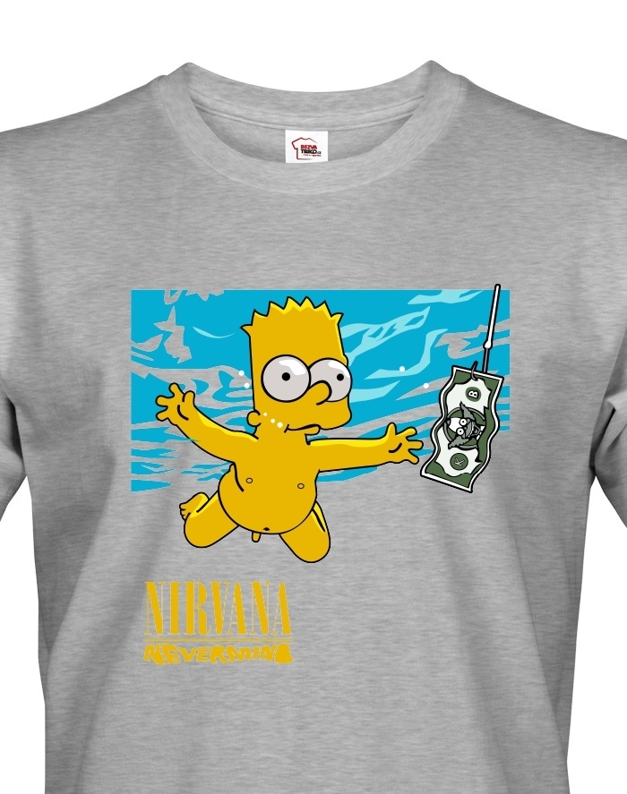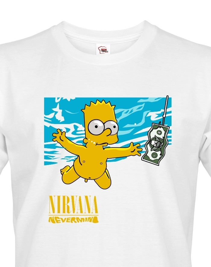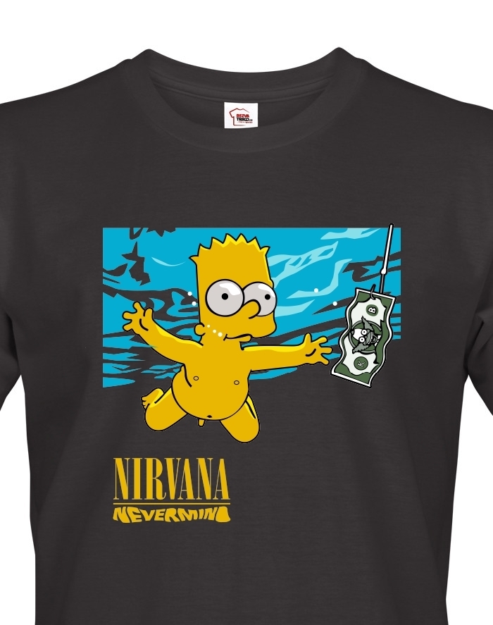 Tričko s potlačou známej seriálovej postavičky Barta Simpsona z amerického seriálu Simpsonovci vytvorený Mattom Groeningom na motív paródie obalu hudobného albumu Nevermind rockovej kapely Nirvana. Bart, ktorý nahradil nahé bábätko plávajúce za bankovkou je skvelý kúsok, ktorý ti nesmie chýbať. Originálne a vtipné tričko rozosmeje každého fanúšika týchto žltých človiečikov a fanúšika legendárnej skupiny Nirvana. Tričko sa bude vynímať na každej párty ale aj posedenie s priateľmi.