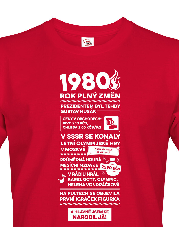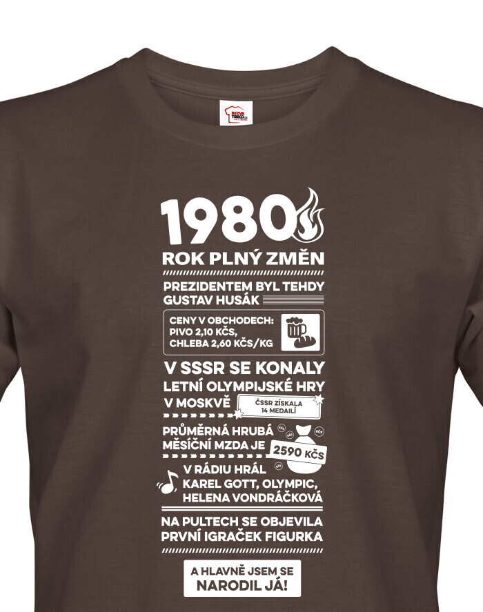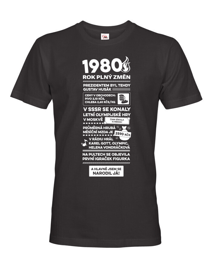 Toto pánske tričko s nápisom „1980 - rok plný zmien“ je skvelým retro kúskom pre všetkých, ktorí sa narodili v tomto nezabudnuteľnom roku. Vtipne a zároveň štýlovo zhŕňa historické momenty, zaujímavosti a dobové ceny, ktoré pripomínajú atmosféru doby - od prezidenta Gustáva Husáka, cez ceny piva až po prvý Igráček na pultoch. Ideálne pre mužov, ktorí si chcú zaspomínať na svoje detstvo alebo len hrdo ukázať, kedy prišli na svet. Tričko je vyrobené z kvalitnej bavlny, je príjemné na nosenie a vďaka modernému strihu sa prispôsobí každej postave. Skvelé ako originálny darček k narodeninám - zaručene pobaví a poteší. Môžete ho použiť na rodinné oslavy, stretnutia spolužiakov, ako aj na bežné nosenie alebo tematické párty. Potlač je odolná a vydrží opakované pranie, takže vám bude robiť radosť dlhý čas. Skvele sa hodí k džínsom a šortkám a zaujme na prvý pohľad. Ak hľadáte kombináciu humoru, nostalgie a originality, toto tričko je to pravé.