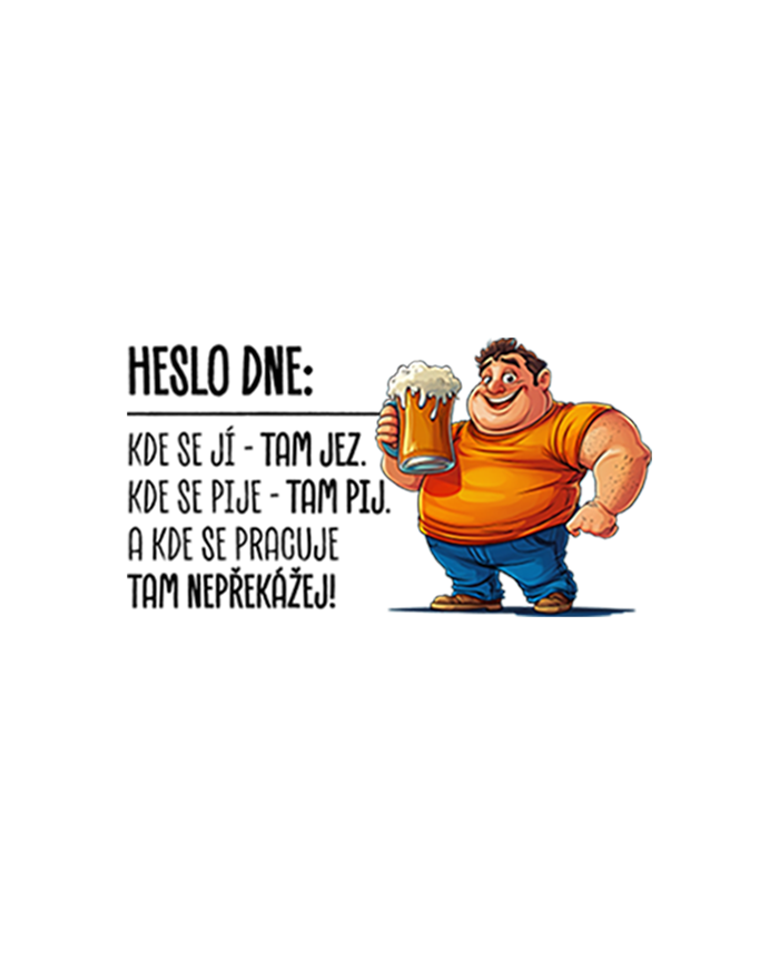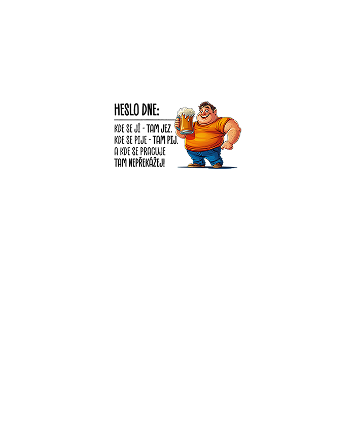Toto vtipné tričko s nápisom „Heslo dňa“ je ideálnou voľbou pre všetkých milovníkov jedla, piva a relaxu. Humorná potlač s postavičkou držiacou pivo a chytľavým sloganom pobaví vaše okolie a ukáže váš uvoľnený prístup k životu. Pohodlný strih a kvalitný materiál zaručujú celodenné pohodlie, či už si ho vezmete na grilovačku, do krčmy alebo len tak domov. Skvelý darček pre priateľa, ktorý má zmysel pre humor a vie si užiť deň bez zbytočného stresu.
