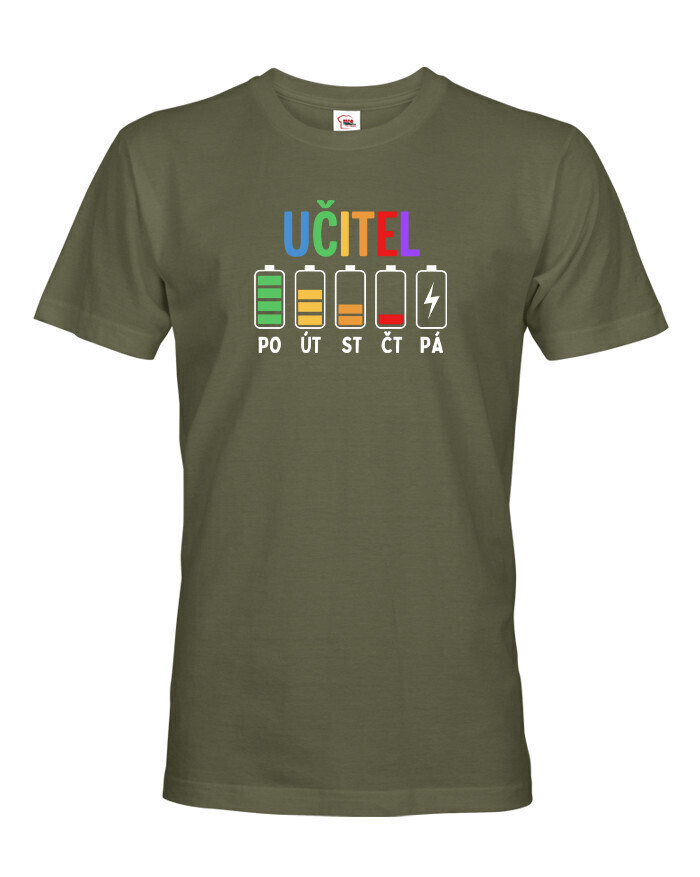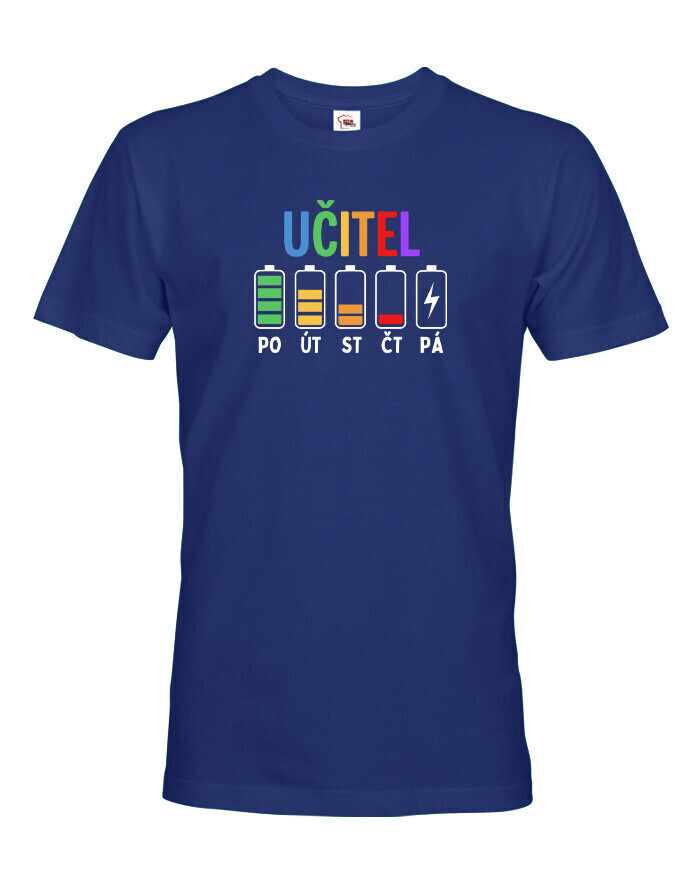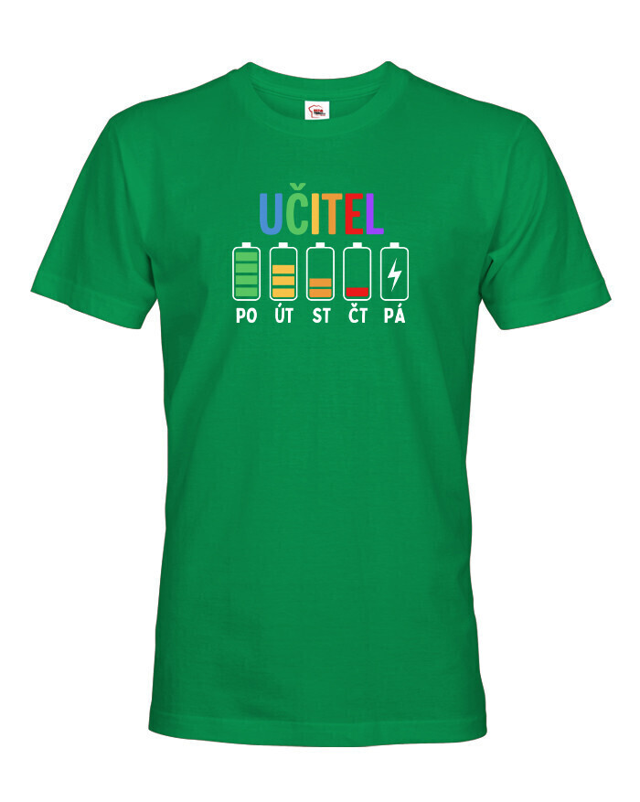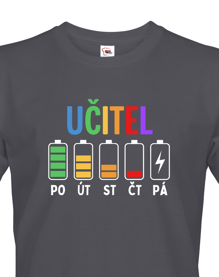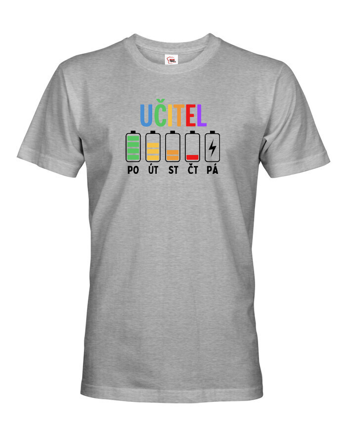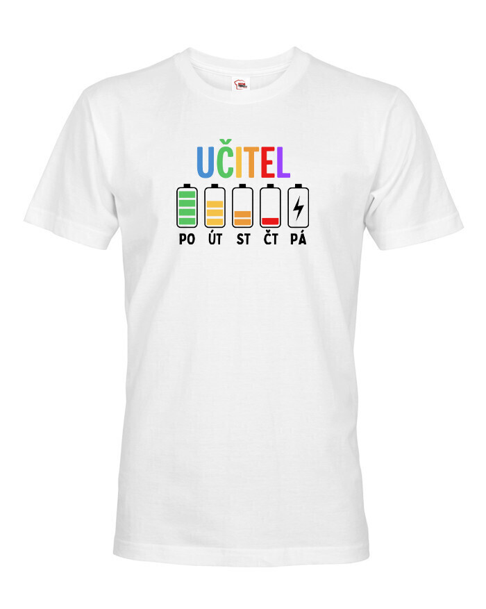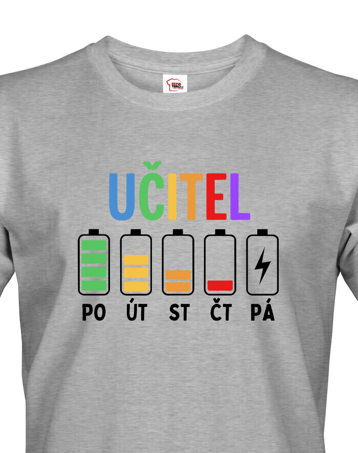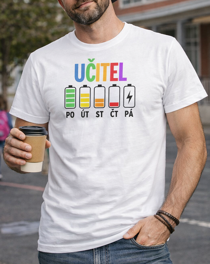 Pondelok ešte ide. Utorok tiež. Streda už trochu bolí… a piatok? Tam ideš na posledné percentá. Pánske tričko s motívom učiteľských „batérií“ počas týždňa presne vystihuje realitu každého učiteľa. Pretože kto učí, ten vie, že energia ubúda rýchlejšie než káva v zborovni.