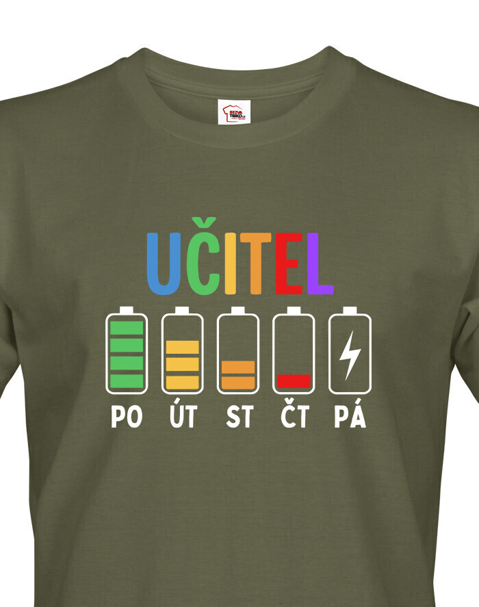 Farebný motív s nápisom „Učiteľ“ a batériami od pondelka do piatku je vtipný, trefný a veľmi pravdivý. Každý kolega, študent aj rodič hneď pochopí, o čo ide. Ide o ideálny kúsok pre všetkých, ktorí učia a dávajú do svojej práce maximum.