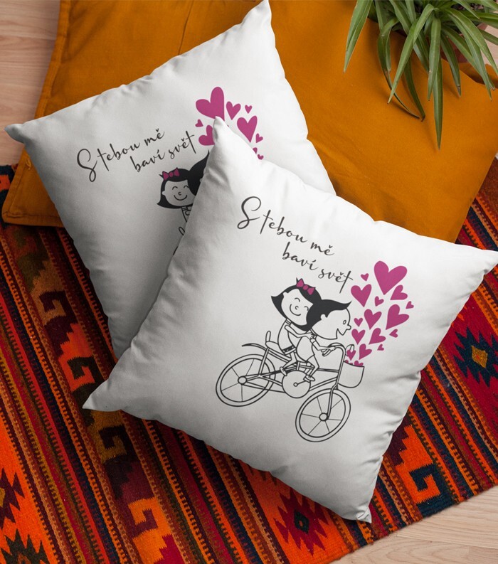 Prezrieť hodnotenie na Heureka.skVankúše pre zamilované páry s potlačou "S tebou ma baví svet". Darujte svojej polovičke vankúš s roztomilou potlačou. Kvalitný vankúš s potlačou. Na potlači je zobrazený nápis a roztomilý zamilovaný pár. Z košíka na bicykli vychádzajú srdiečka ako znak pretrvávajúcej lásky. Darujte darček svojej polovičke kedykoľvek, nie len na Vianoce alebo na Valentína.