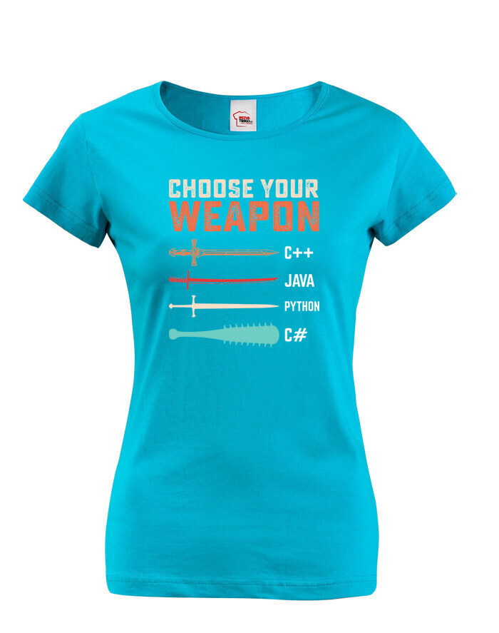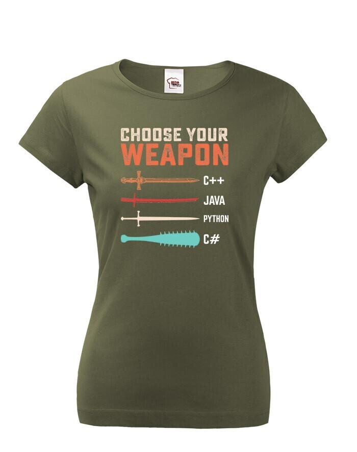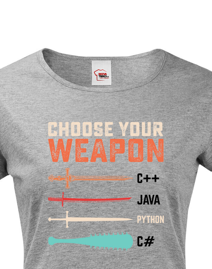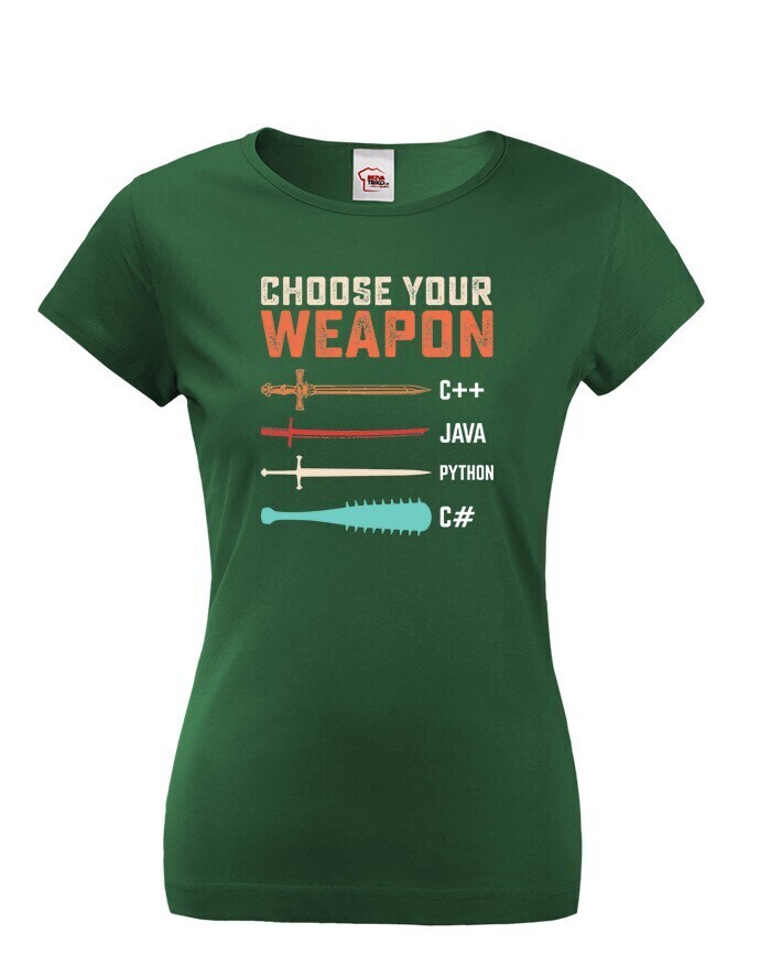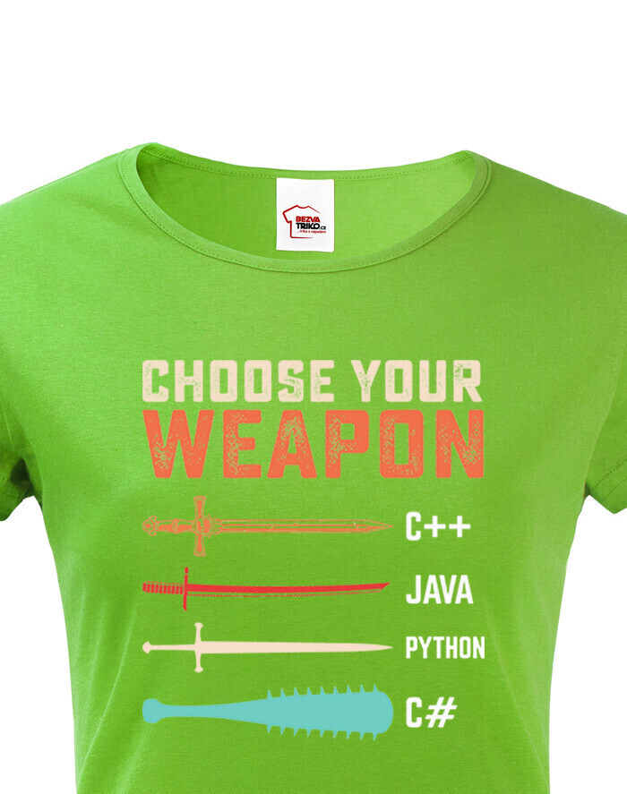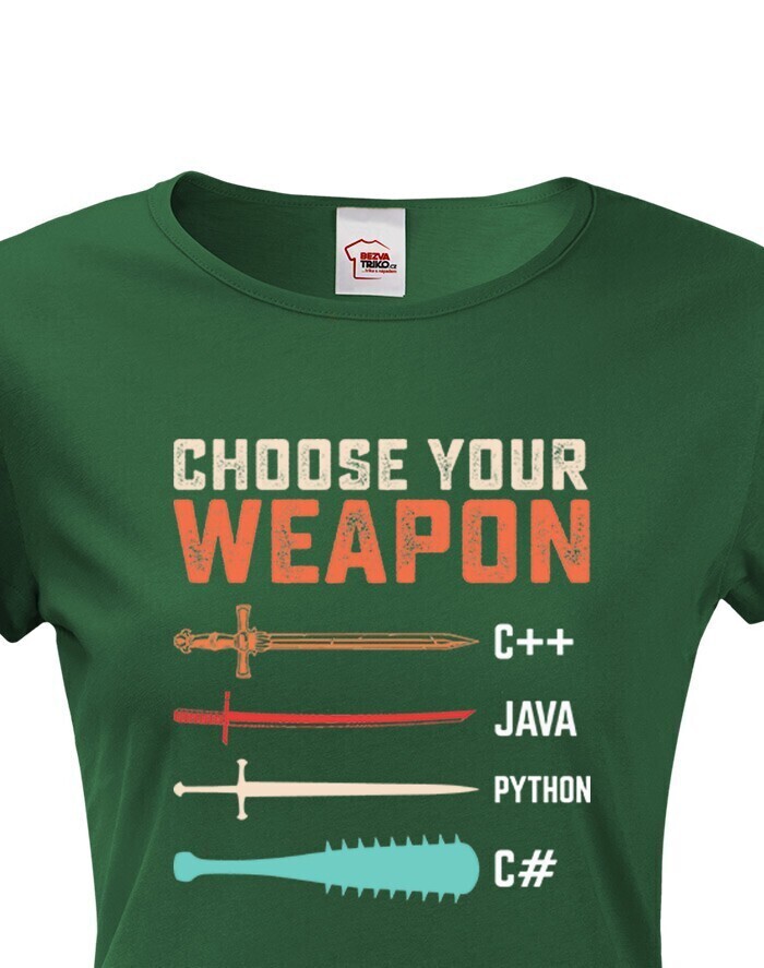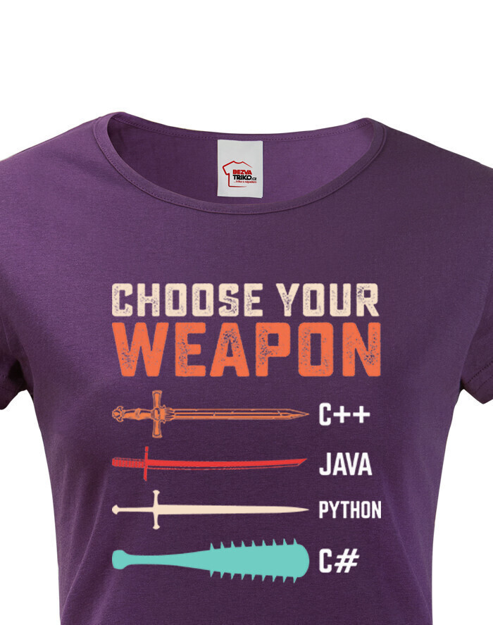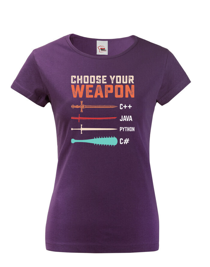Toto tričko s nápisom „Choose Your Weapon“ je ideálnou voľbou pre programátorky a nadšenkyne IT, ktoré chcú štýlovým a vtipným spôsobom ukázať svoju lásku k programovacím jazykom. Dizajn kombinuje svet kódovania s vojnovou symbolikou - rôzne jazyky sú znázornené ako zbrane, od elegantného meča pre C++ po pálku s hrotmi pre C#. Pohodlný strih a vysokokvalitný materiál zaručujú celodenné pohodlie, či už ju budete nosiť do práce, na stretnutie s kolegami alebo na konferenciu o IT. Skvelý darček pre vývojárky, geekov a všetkých, ktorí milujú technológie!