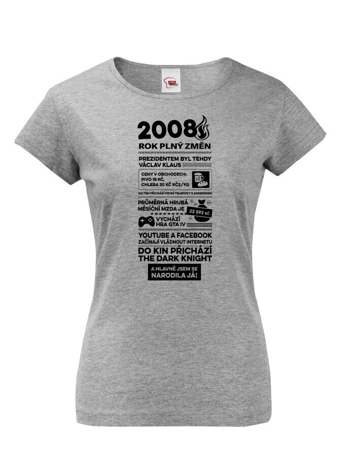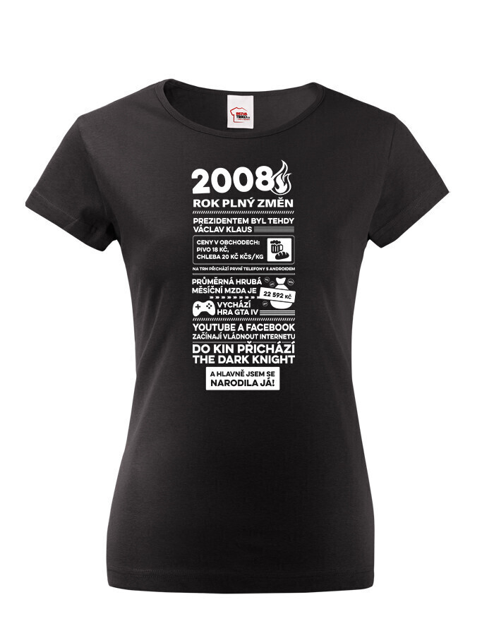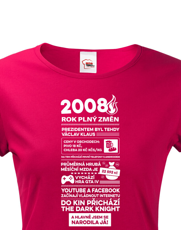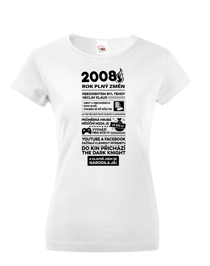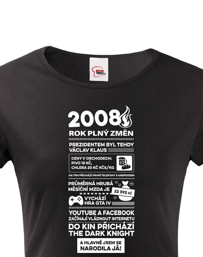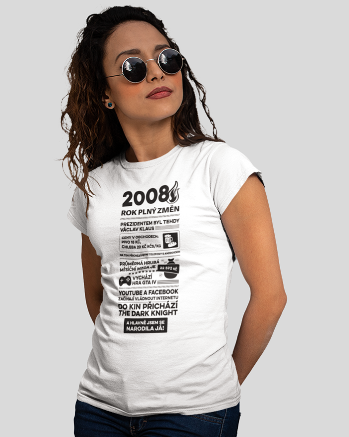Motív trička pripomína rok 2008 formou štýlizovaných novinových titulkov. Nájdete tu rôzne zaujímavosti a udalosti z tohto obdobia – napríklad informáciu o vtedajšom prezidentovi Václavovi Klausovi, priemernej mzde, cenách v obchodoch alebo technologických novinkách, ako boli prvé telefóny s Androidom. Spomenuté sú aj známe momenty z popkultúry, napríklad vydanie hry GTA IV alebo filmový hit The Dark Knight. Vďaka tomu má tričko nostalgický a zároveň zábavný charakter, ktorý poteší každú oslávkyňu.