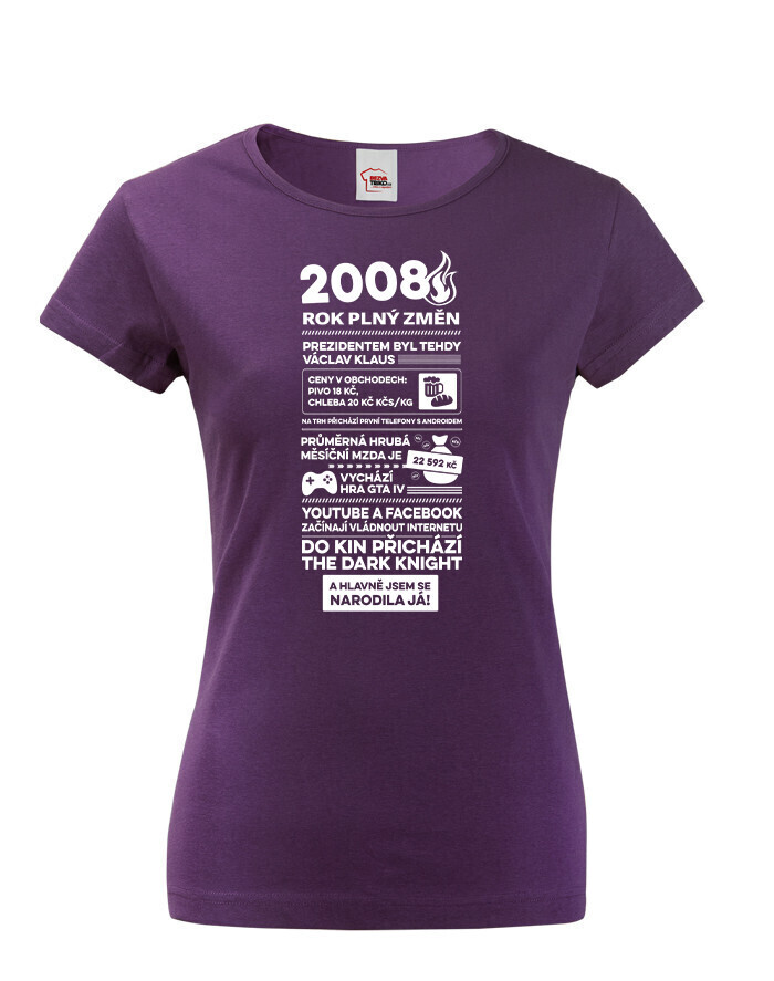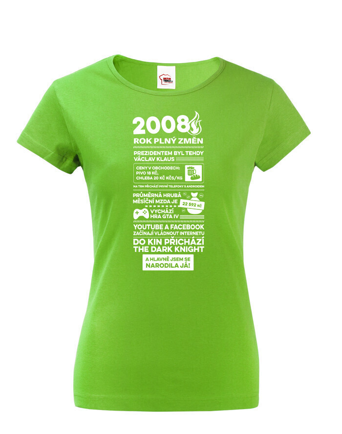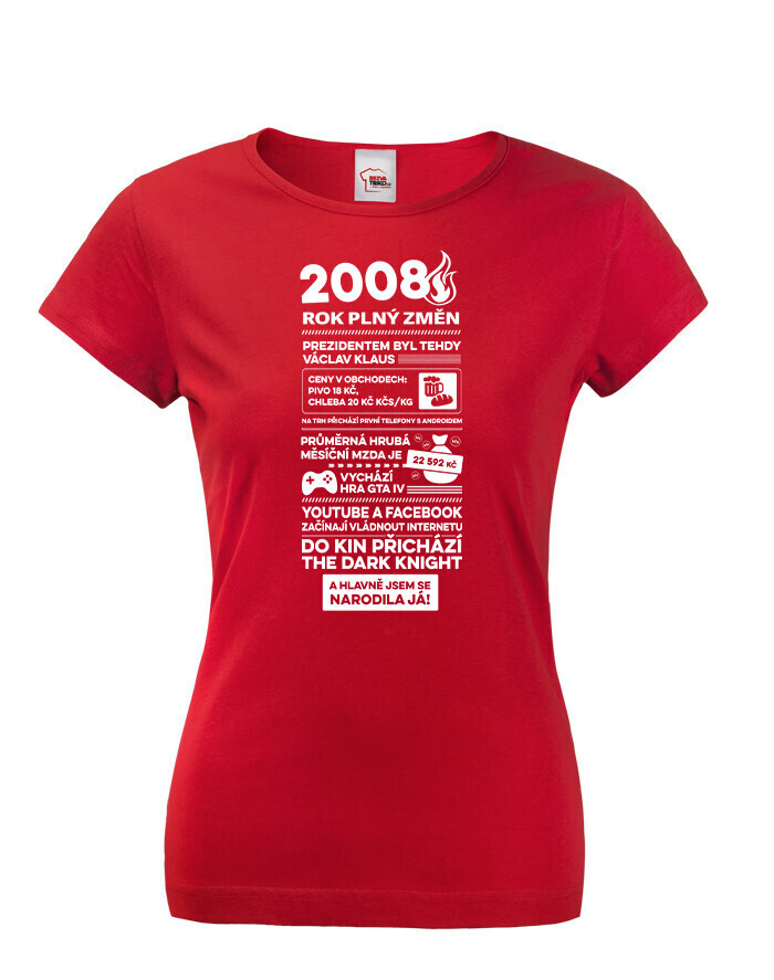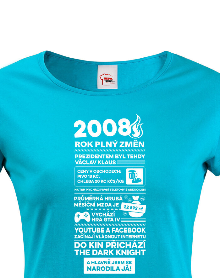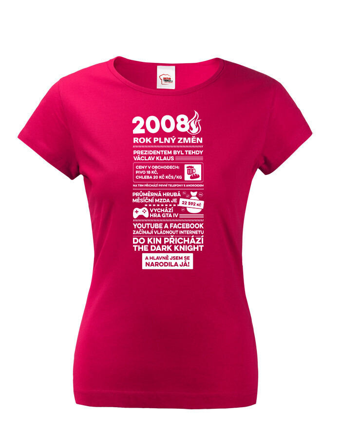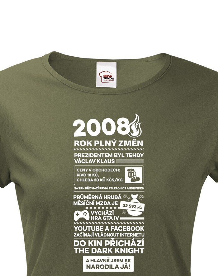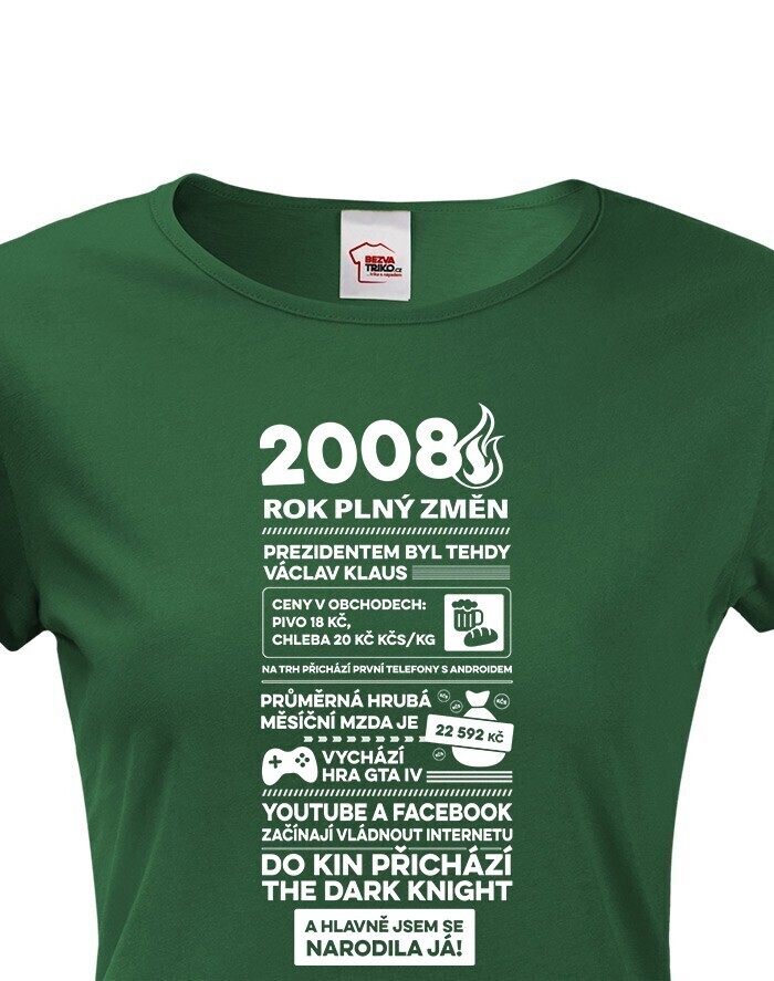 Motív trička pripomína rok 2008 formou štýlizovaných novinových titulkov. Nájdete tu rôzne zaujímavosti a udalosti z tohto obdobia – napríklad informáciu o vtedajšom prezidentovi Václavovi Klausovi, priemernej mzde, cenách v obchodoch alebo technologických novinkách, ako boli prvé telefóny s Androidom. Spomenuté sú aj známe momenty z popkultúry, napríklad vydanie hry GTA IV alebo filmový hit The Dark Knight. Vďaka tomu má tričko nostalgický a zároveň zábavný charakter, ktorý poteší každú oslávkyňu.