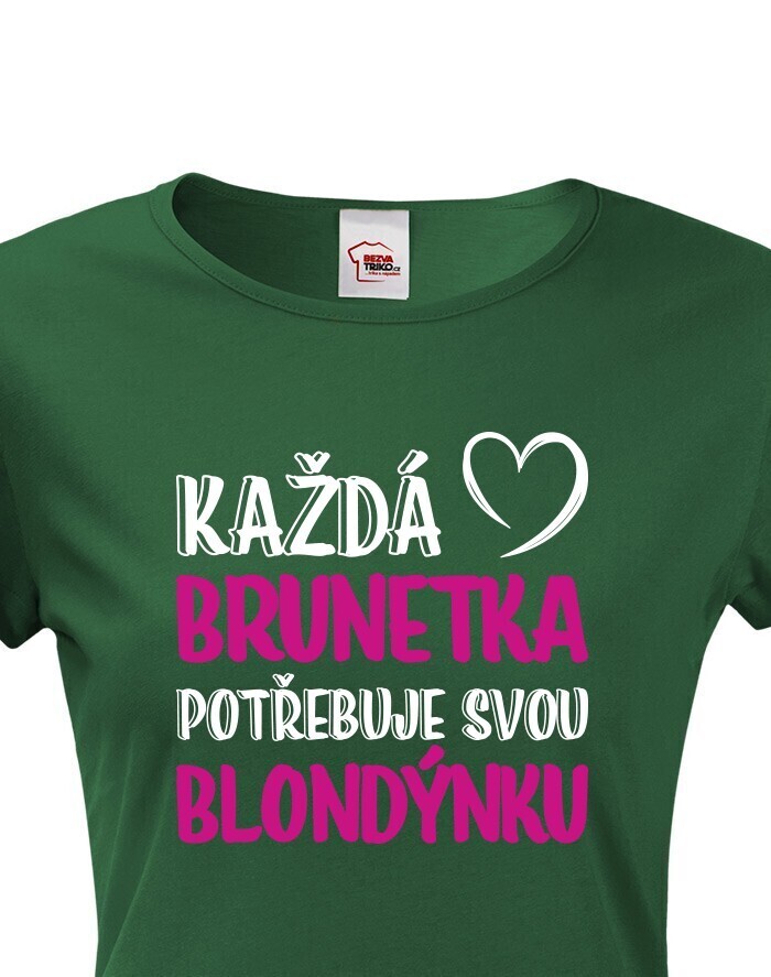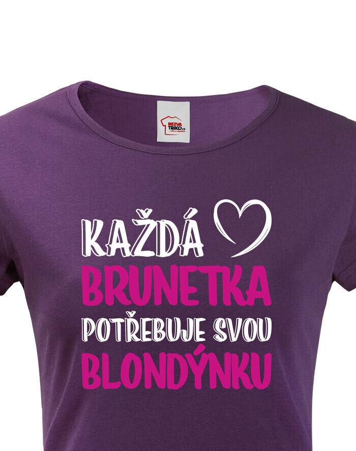 Vyjadrite svoje priateľstvo štýlovo s týmto originálnym tričkom! Výrazný nápis „Každá brunetka potrebuje svoju blondínku“ dokonale vystihuje nerozlučné puto medzi dvoma priateľkami. Pohodlný strih a kvalitný materiál zaručujú maximálne pohodlie pri nosení, či už sa chystáte do mesta, na párty alebo len na kávu. Skvelý darček pre najlepšie kamarátky, ktoré sa dokonale dopĺňajú a vždy držia spolu!