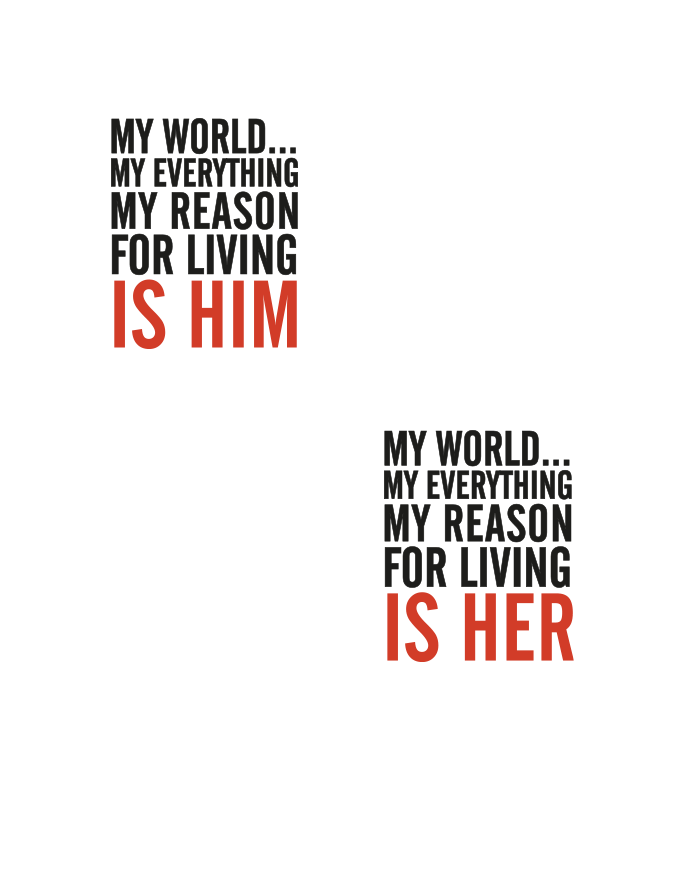 Párové tričká pre zamilovaných s anglickým nápisom MY WORLD, MY EVERYTHING, MY REASON FOR LIVING IS HER/HIM budú skvelým a jasným vyjadrením toho, čo k tomu druhému cítite. Tričká s potlačou budú perfektné ako darček na Valentína alebo proste len tak :-)