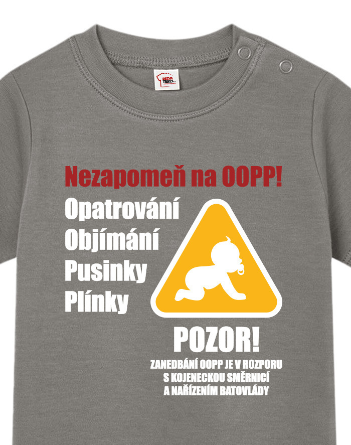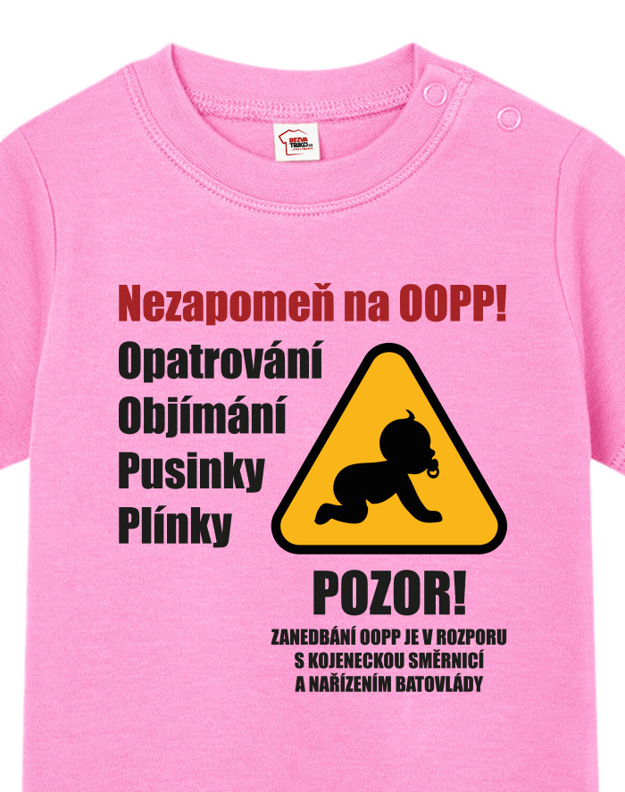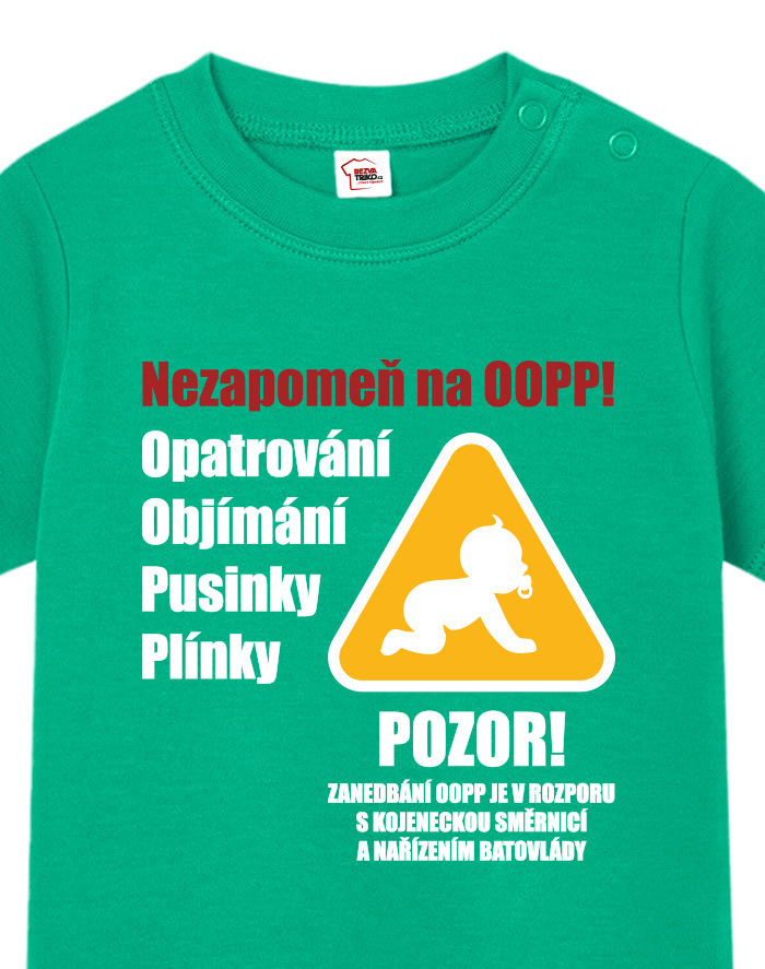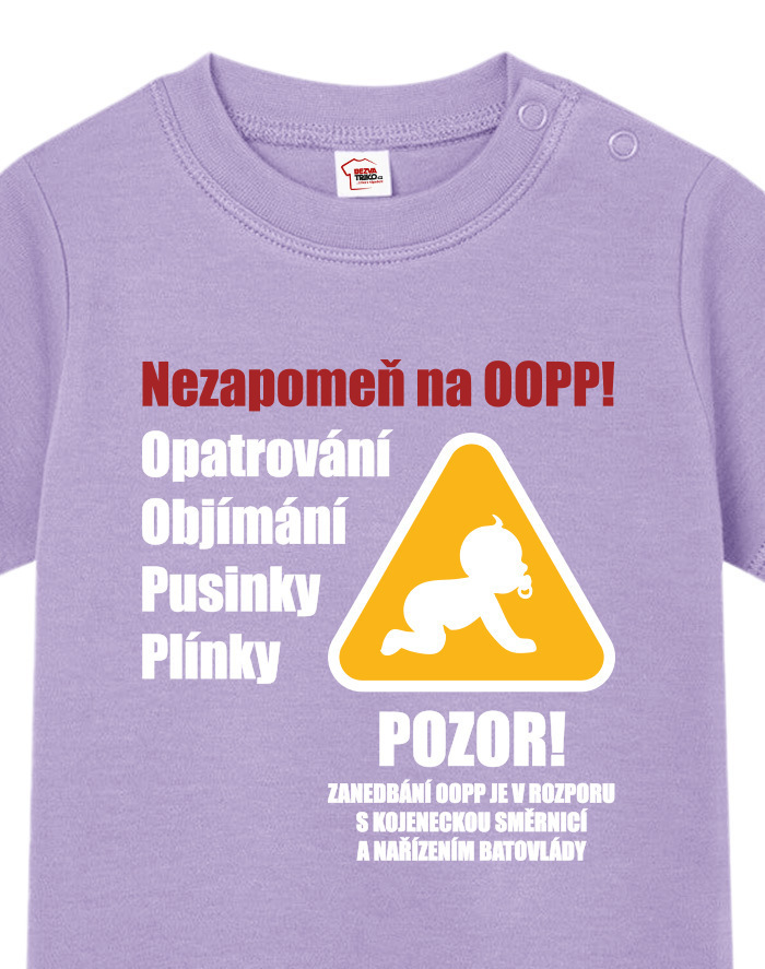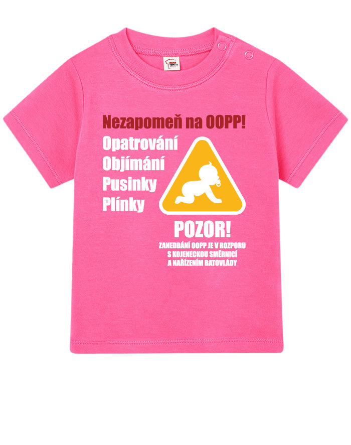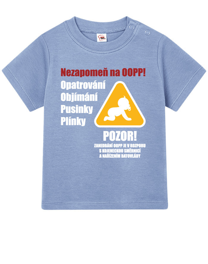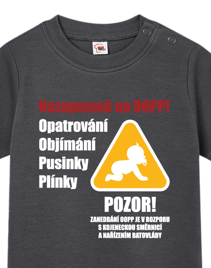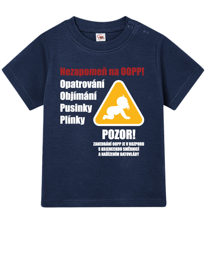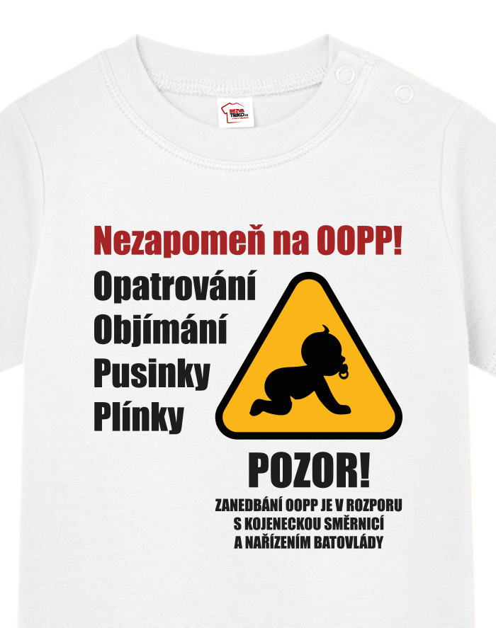Toto vtipné a zároveň nežné detské tričko s potlačou „Nezabudni na OOPP!“ je ideálnou voľbou pre všetky malé šéfky a ženy v domácnosti, ktoré chcú pripomenúť, že bez opatrovania, objatí, bozkov a plienok to jednoducho nejde. Dizajn inšpirovaný výstražným nápisom prináša originálne a hravé posolstvo, ktoré rozosmeje každého, kto sa na dieťa pozrie. Tričko je vhodné pre chlapcov aj dievčatá a je vtipným, ale praktickým darčekom k narodeniu dieťaťa, krstinám, narodeninám alebo aj k Vianociam. Skvele sa bude hodiť aj ako roztomilé oblečenie na návštevy, rodinné oslavy alebo fotenie. Vďaka pohodlnému strihu a kvalitnému bavlnenému materiálu sa dieťa bude cítiť pohodlne po celý deň. Tričko sa dá ľahko kombinovať s inými kúskami detského oblečenia a vďaka svojmu motívu sa rýchlo stane obľúbeným kúskom v každom outfite. Praktické zapínanie umožňuje jednoduché obliekanie, čo ocení každý rodič. Ak hľadáte niečo výnimočné, čo vás pobaví aj poteší, toto tričko je tou správnou voľbou. Je to malý, ale výstižný kúsok, ktorý vám pripomenie, že najdôležitejšia je láska, starostlivosť a úsmev na tvári vášho dieťaťa.