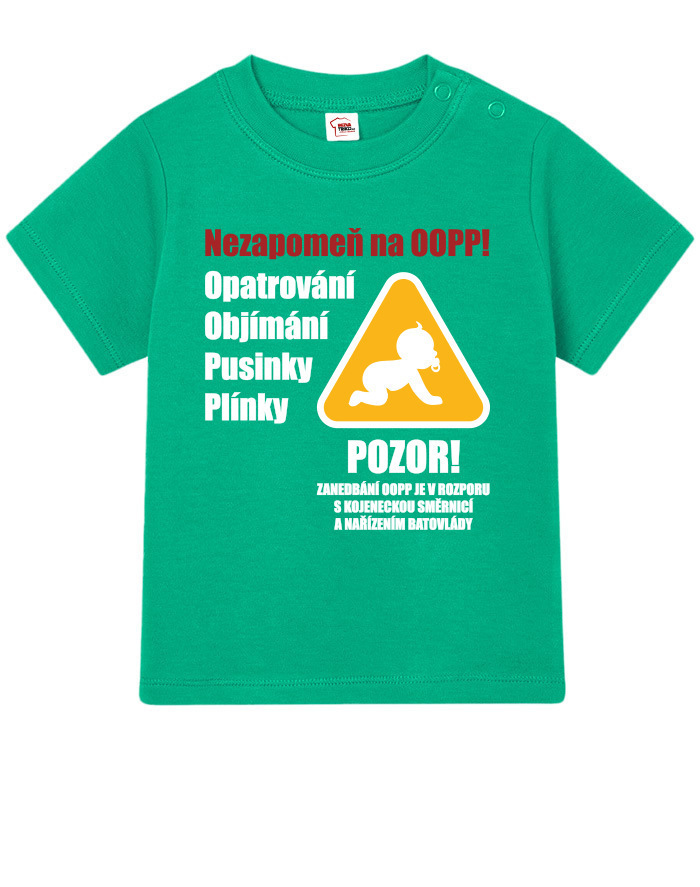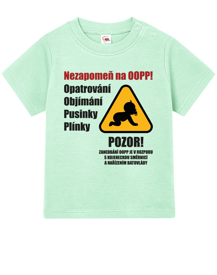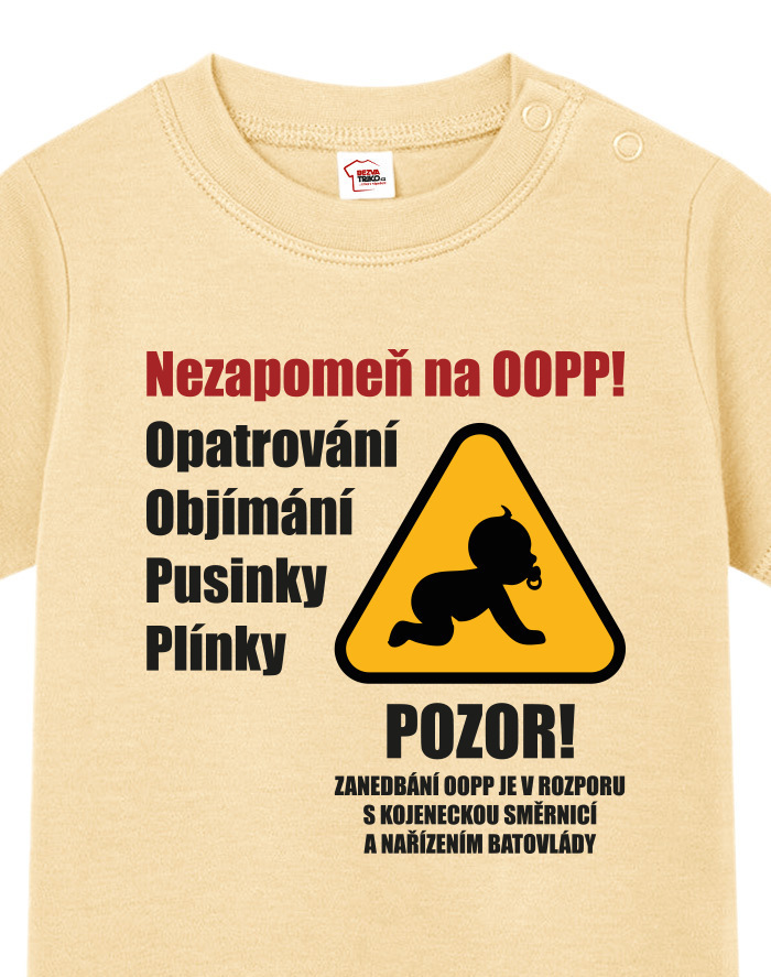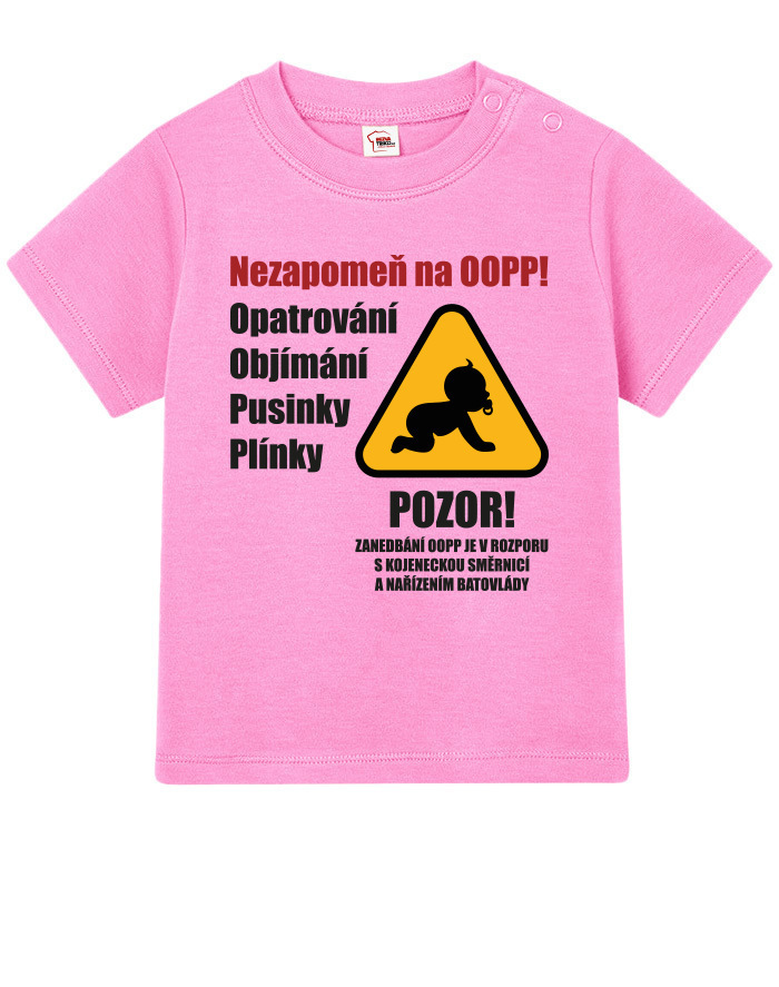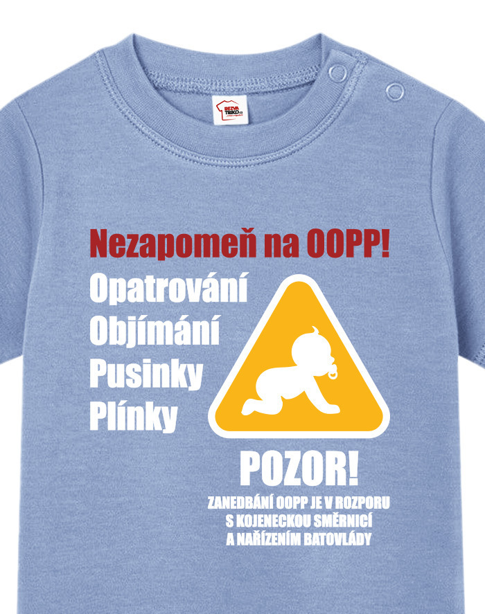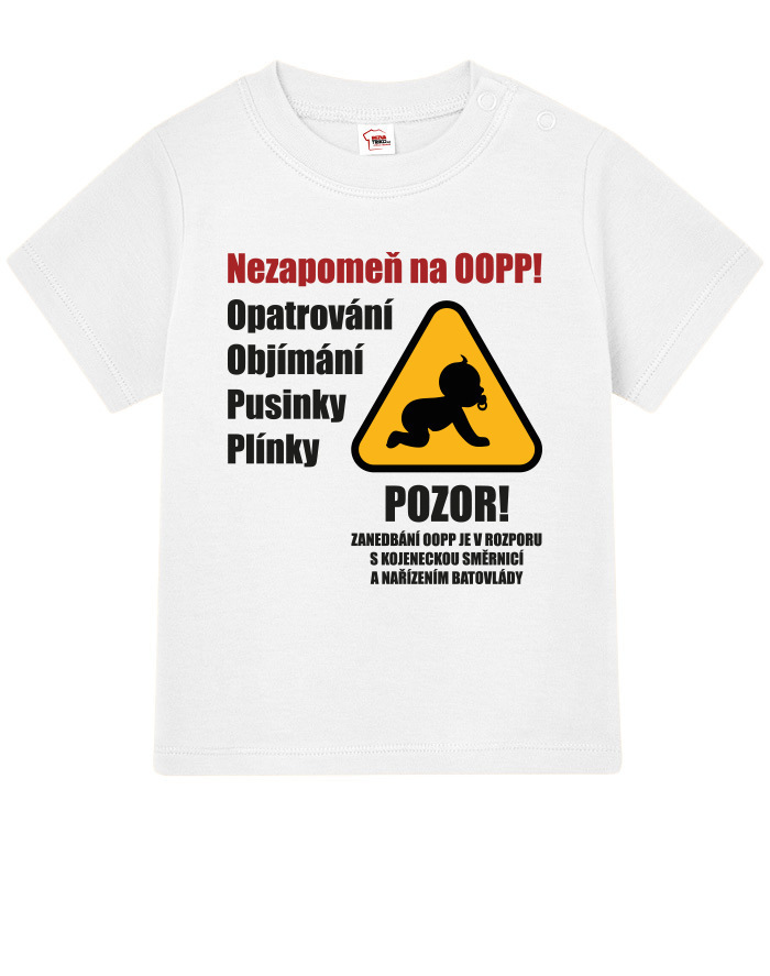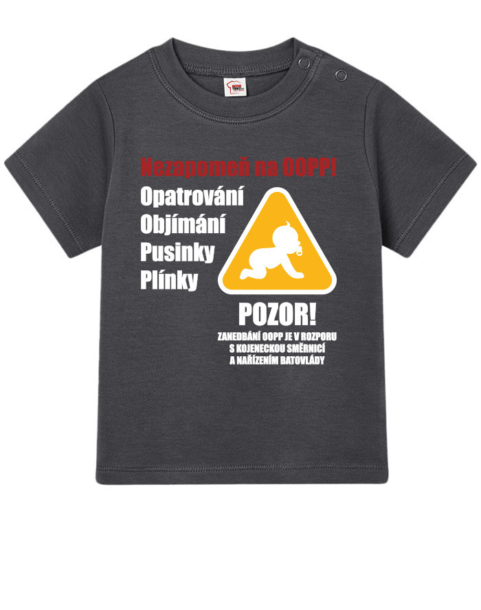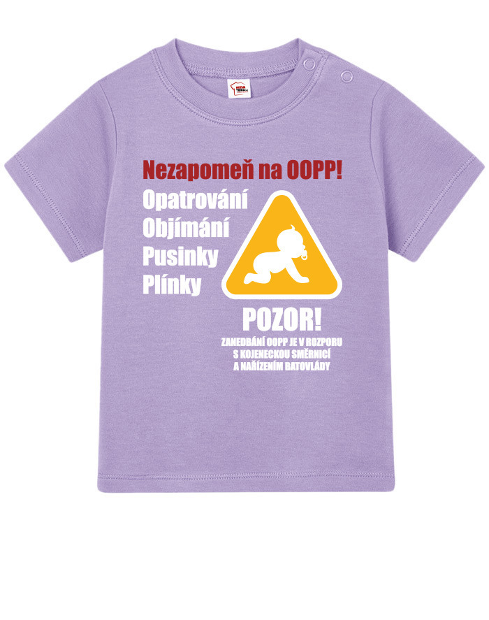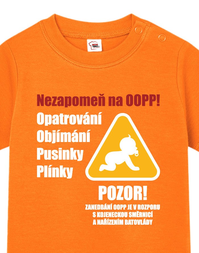 Toto vtipné a zároveň nežné detské tričko s potlačou „Nezabudni na OOPP!“ je ideálnou voľbou pre všetky malé šéfky a ženy v domácnosti, ktoré chcú pripomenúť, že bez opatrovania, objatí, bozkov a plienok to jednoducho nejde. Dizajn inšpirovaný výstražným nápisom prináša originálne a hravé posolstvo, ktoré rozosmeje každého, kto sa na dieťa pozrie. Tričko je vhodné pre chlapcov aj dievčatá a je vtipným, ale praktickým darčekom k narodeniu dieťaťa, krstinám, narodeninám alebo aj k Vianociam. Skvele sa bude hodiť aj ako roztomilé oblečenie na návštevy, rodinné oslavy alebo fotenie. Vďaka pohodlnému strihu a kvalitnému bavlnenému materiálu sa dieťa bude cítiť pohodlne po celý deň. Tričko sa dá ľahko kombinovať s inými kúskami detského oblečenia a vďaka svojmu motívu sa rýchlo stane obľúbeným kúskom v každom outfite. Praktické zapínanie umožňuje jednoduché obliekanie, čo ocení každý rodič. Ak hľadáte niečo výnimočné, čo vás pobaví aj poteší, toto tričko je tou správnou voľbou. Je to malý, ale výstižný kúsok, ktorý vám pripomenie, že najdôležitejšia je láska, starostlivosť a úsmev na tvári vášho dieťaťa.